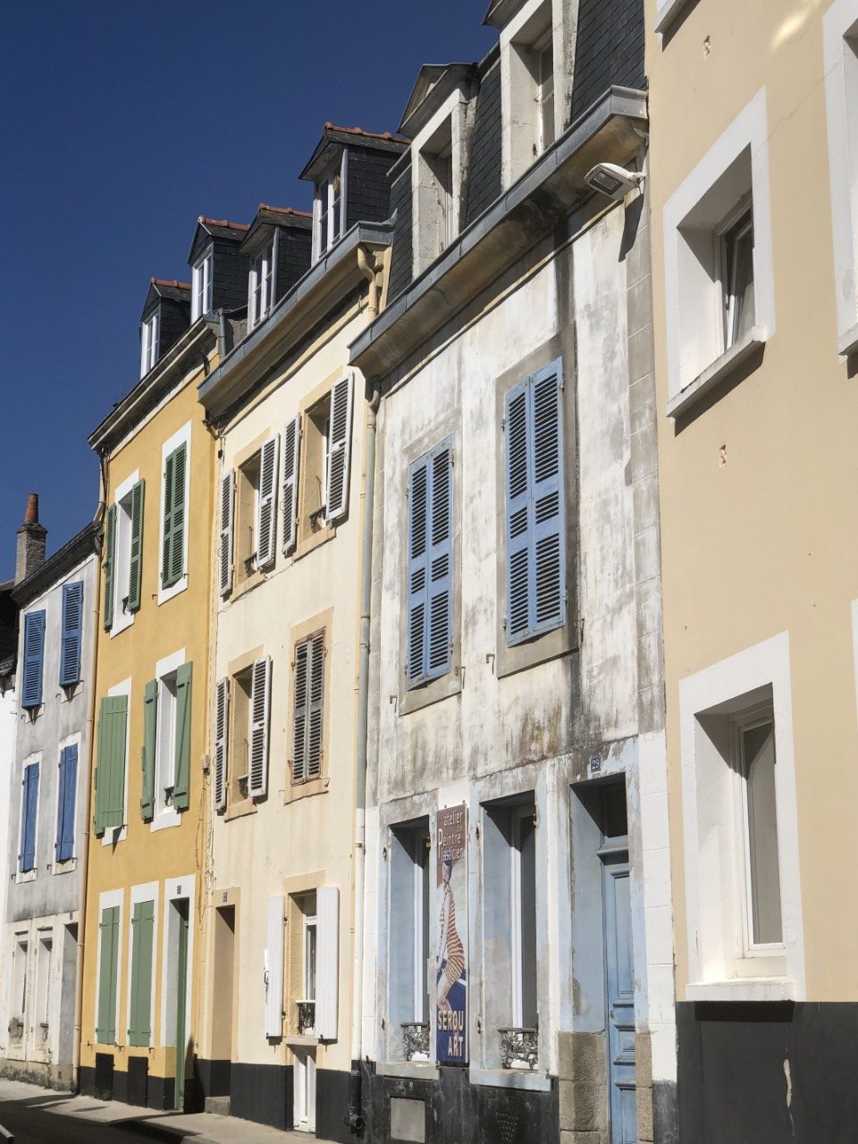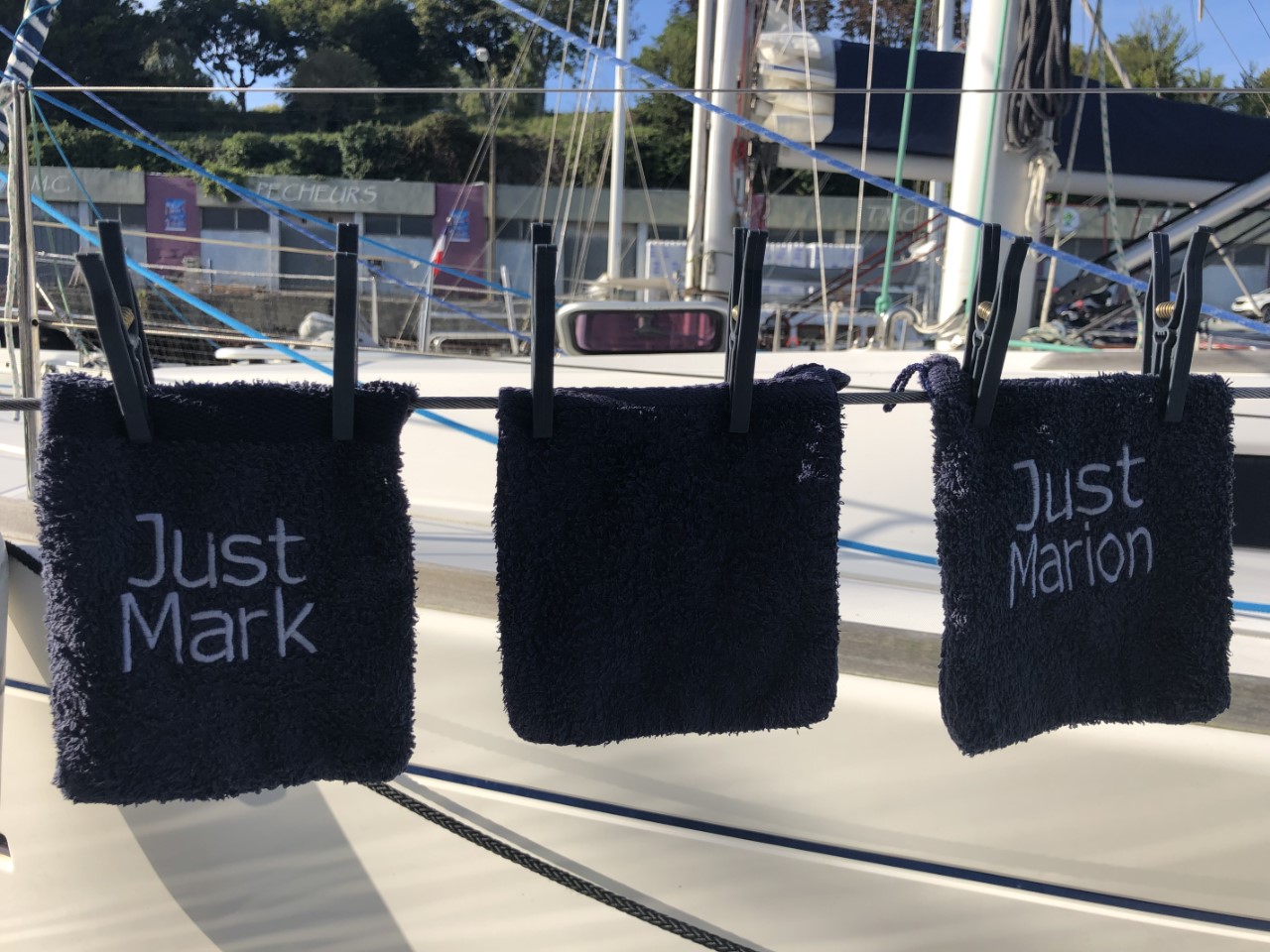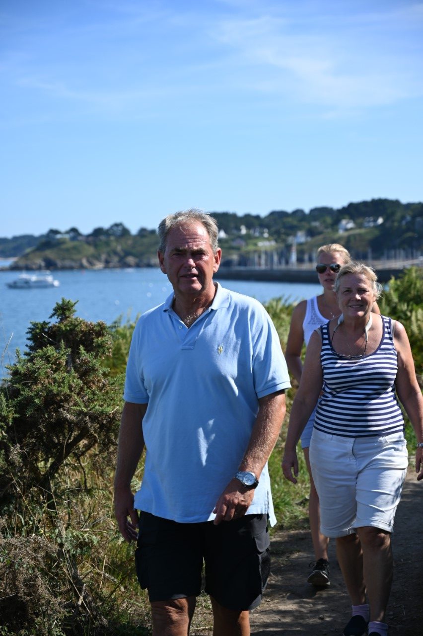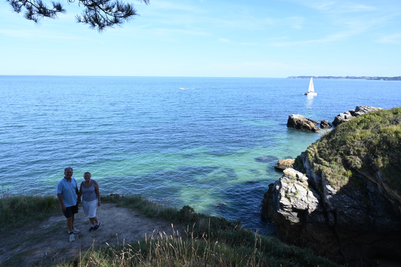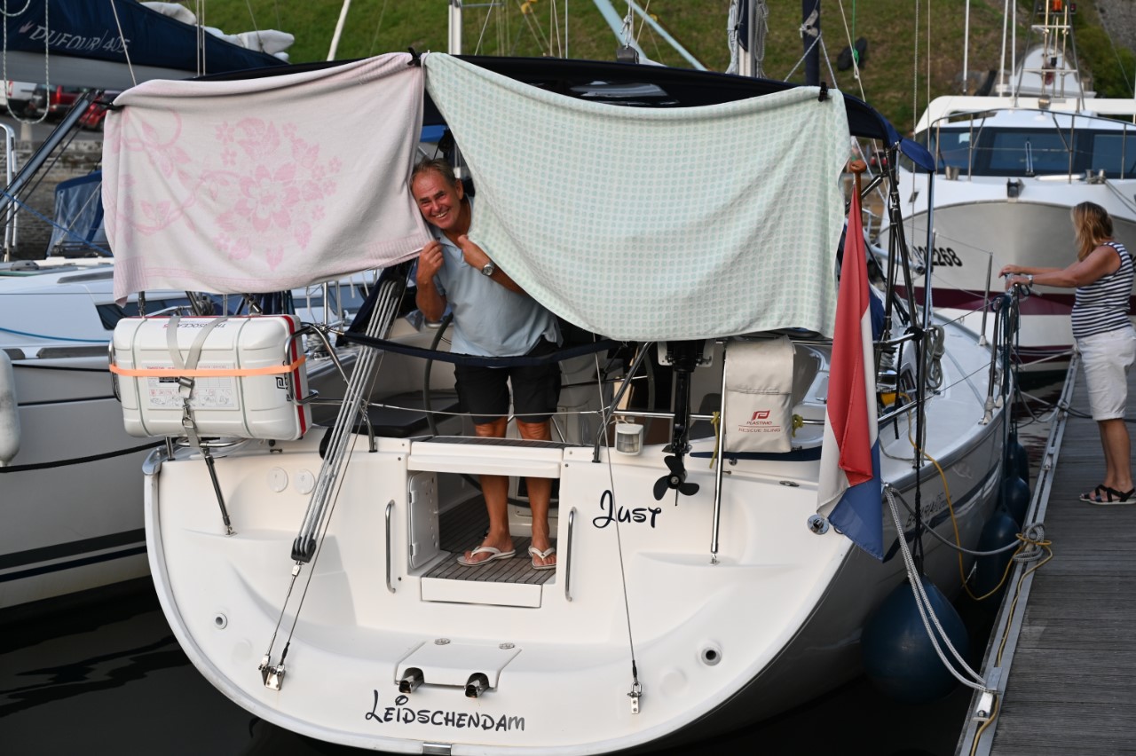 Nog voor het ontbijt was het een heel schouwspel in de haven van vertrekkende bootjes. De havenmeesters gebruikten hun rubberbootjes als veredelde boegschroef om de schippers een handje te helpen in de nauwe havenkom. De rust is weer gekeerd, dachten we, maar ook wij moesten verplaatsen naar een plekkie direct aan de kade. Eindelijk! We kunnen ontbijten in de kuip. We hebben daarna het stadje bezocht, weer langs alle babykledingshopjes en een heel klein Frans marktje. Met Mark heb ik het rondje na de lunch nogmaals gelopen om te kijken of we een leuk restaurantje konden ontdekken voor vanavond. Ondertussen zag Mark het ultieme maritieme babypakje voor zijn zoontje en heeft deze als verrassing voor de zwangere Marion meegenomen. We zijn daarna gestopt bij een ijssalon a la Blankenberge en met een 3 bollen groot ijsje zijn we richting de Just gegaan. We wandelden nogmaals rond de havenkom zonder een beslissing welk restaurant. De dames hebben een wandelroute op het douanepad bepaald. Via de ingang van de Citadel, het fort van Vauban, bereikten we het kustpad. We kwamen langs mooie rotspartijen, verborgen strandjes en volop mooie, paarse bramen die Marianne niet kon laten hangen. Rond 18:30 uur waren we terug op de Just en nog steeds was er geen plan voor onze maaltijd voor vandaag. De knoop is doorgehakt. We zoeken morgen een lekker restaurantje in Quiberon. En gaan nu wat halen bij de plaatselijke snackbar. Met een lekkere hamburger en een flinke portie Franse frietjes hadden we een lekkere vrijdagavond maaltijd. Als toetje namen we nog een ijsje, maar nu hielden we ons in. 2 bolletjes vonden we genoeg. Aan boord zitten we in spanning of het weer zo’n spektakel gaat worden als vanmorgen in de haven. Wij gaan dat spektakel morgenochtend zelf weer meemaken, als we om 10:00 uur vertrekken.