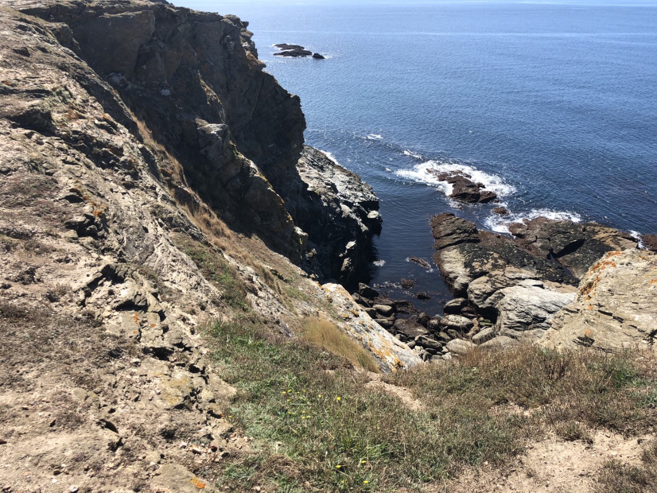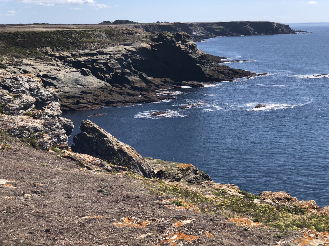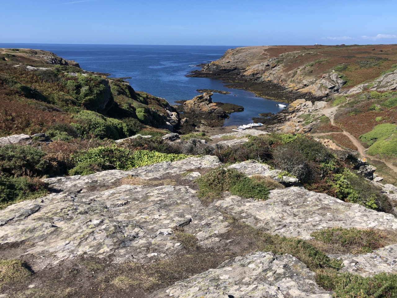 We kunnen toch nog geen afscheid nemen van de wateren bij Lorient/Ile De Groix. Dus tuffen we weer naar Ile De Groix toe. Het kwam ook een beetje door de weersvoorspellingen voor de komende week. Als het goed is vertrekken we morgen richting Baie De Quiberon. Wat het gaat worden is ook voor ons nog een vraagteken. We waren vroeg in Port Tudy en gingen gelijk naar het touristenburo voor een foldertje voor de bussen, want dat hadden we weggegooid. Maar gek genoeg, het buro is op maandag gesloten, onbegrijpelijk. Toen maar een fotootje gemaakt bij het busstation, want we hebben alleen het telefoonnummer nodig. De bussen rijden hier als er een veerboot aankomt en je moet bellen als je opgehaald wilt worden bij een halte ergens op het eiland. We hadden net een rugzakje ingepakt, toen we de scheepshoorn van de veerboot hoorden. Wij snel naar het busje. Er waren nog maar 4 plaatsen beschikbaar en de veerboot moest nog afmeren. De laatste 2 plaatsen waren ook snel gevuld en we waren op weg naar Quéhello. Vanaf daar namen we de Sentiers Côtiers, het pad langs de kust, beginnend bij Port Saint Nicolas. Maar eerst moesten we langs heel veel bramenstruiken vol met mooie paarse exemplaren, Marianne nam een vroege lunch en het vrijgekomen plasticzakje werd gevuld met bramen. We hadden even gekeken vanmorgen toen we naar Ile De Groix vaarden of we een mooi ankerplekje zouden nemen voor de nacht, maar de windrichting stond verkeerd en de haven was aantrekkelijker. Maar nu stonden we vlakbij een ankerplekje met laagwater en zagen toch veel gemene rotspuntjes. We liepen weer verder met af en toe een flinke klim en daalpartijen, dat alles met een mooi uitzicht. Op de terugweg hebben we het eiland doorkruist met als doel een paar boodschappen halen bij de Intermarché. Echter bij het invoeren van de route in Google Maps kregen we de melding “als u aankomt is de supermarkt gesloten”. Hebben ze daar ook al siesta? Ja dus, tussen 12:30-15:00 uur gooien ze de tent dicht. Raar volk, die Fransen. Het was nog maar een klein stukje naar de Just. We hebben met een drankje toen ook maar een siësta gehouden en zitten bijkomen van de wandeling. Morgen gaan we verder naar het zuiden.