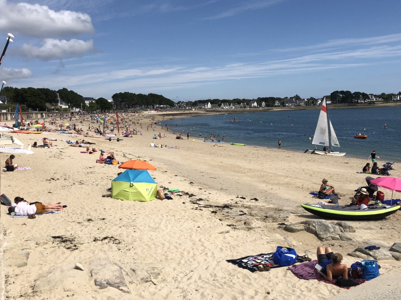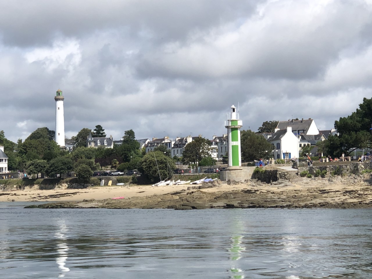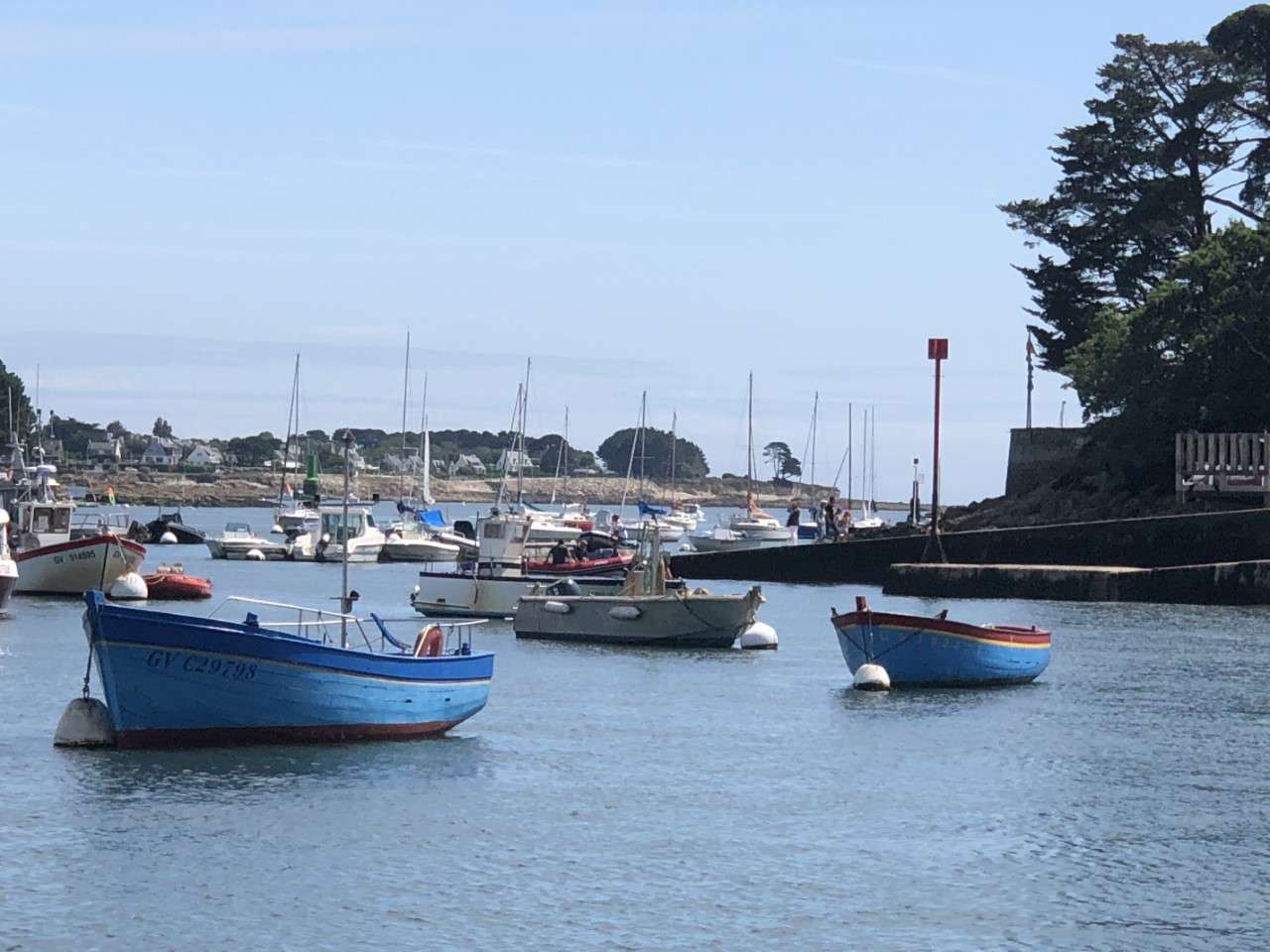 Wakker worden met regentikjes op het kajuitdak. Dat is niet wat we willen. En dan ook nog eens in de regen een Baguetje halen al helemaal niet. Maar tijdens het ontbijt werd het snel lichter. Tijdens het uitvaren hadden we ons inmiddels vertrouwde Franse zonnetje op onze bolletjes. Het was een heel klein tochtje van net een uurtje. Even voor de ingang van de Odet rivier zagen we aan de golven een flinke werveling van het water en ruim 2 knopen stroom tegen. Marianne had ineens een ingeving van wat ze had gelezen in de Reeds. De haven is het beste aan te varen met de kentering van het tij en vermijd invaren met stroming om schade in de havens te voorkomen. Maar alles ging goed en Marianne kon weer adem halen. We hebben gelijk de Just afgesloten om in Bénodet te gaan wandelen. Daarvoor moesten we met een veerpontje. Er is echter een heel streng beleid van hoeveel passagiers, dus wij moesten wachten. We vonden het erg toeristisch met een mooi strand en erg bosrijk. Via een gedeeltelijke wandelroute kwamen we weer bij het veerpontje en weer werden we gesommeerd te wachten. Op de Just gingen de beentjes lekker omhoog.