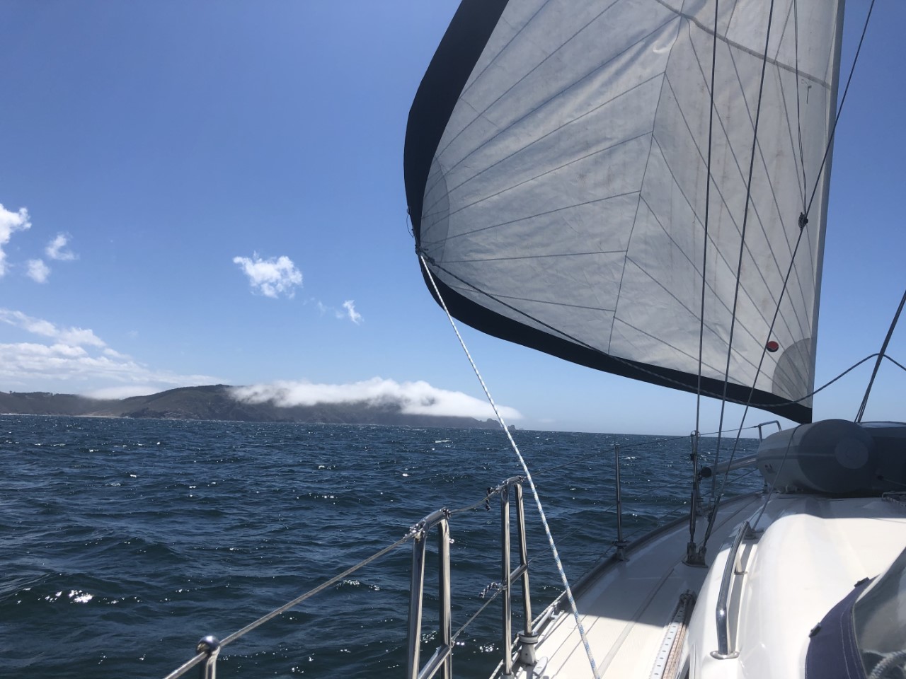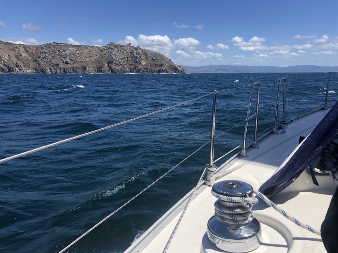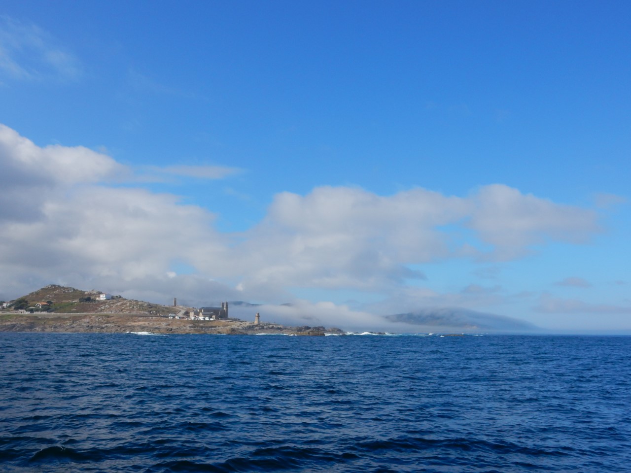 We hadden de bedoeling om vroeg te vertrekken. De bakker ging om 8:00 uur open en ik stond netjes voor de deur te wachten voor een deur die maar niet open ging. Marianne en Daniel zaten al achter de gedekte tafel te wachten. Ze moeten nog even geduld hebben, de supermarkt gaat pas om 9:00 uur open. Na een laat ontbijt hebben we voor ons vertrek met onze Nederlandse buren een praatje gemaakt. De buurman wilde solo in 3,5 jaar rond de wereld zeilen, maar vond het toch te saai zonder de buurvrouw. Ze waren nu samen onderweg terug naar Nederland. Bijna samen met de Pincoya en de Annie zijn we vertrokken verder naar het zuiden. Even buiten de Ria trok er een dikke mist op, die rondom een zicht gaf van 30 meter. Het gekke was, dat boven ons een strak blauwe hemel was met een lekker zonnetje. Als we naar de kust keken zagen we een grijze massa waar je nog net aan de bovenkant een wiek van een windmolen zag draaien. Na eerst even alleen met de fok te hebben gevaren, ging al snel het grootzeil bij. De snelheid was nog niet om over naar huis te schrijven, maar het was de juiste snelheid om te vissen. Daniel had alle vislijnen uitstaan achter de Just. De ene voor makreel en de andere voor tonijn. De mist bleef nog lang hangen. We zagen later prachtig hoe de mist in de bergen hing. Al gauw vaarden we in een fel zonnetje. De wind trok steeds iets meer aan en nadat we het meest westelijke puntje van Spanje hadden gerond gingen we dan echt zuidelijk varen met steeds meer snelheid. De zeilen stonden als melkmeisje, dat is niet mijn meest favoriete koers. Vooral bij de oceaandeining is het lastig als de giek helemaal uitstaat. Bij een hoge golfbeweging geeft deze steeds een klap, ondanks de bulletalie die ik had gemaakt. Ook de fok verliest zijn wind en vult zich weer met een klap. Bij Cabo Finisterre gingen we hoog aan de wind, met nog even een flinke windstoot en daarna zo diep mogelijk de Ria van Finisterre in. We gingen door tot Ensenada Del Sardineiro, waar we voor Playa Estorde een ankerplekje vonden. De windvoorspellingen zeggen, dat de wind voor de nacht niet veel gaat afnemen, maar we liggen stevig vast achter ons anker en golven zijn er nauwelijks. Ik denk dat we vannacht maar moeten dromen hoe lekker die tonijn had kunnen smaken, want we hebben weer niks gevangen.