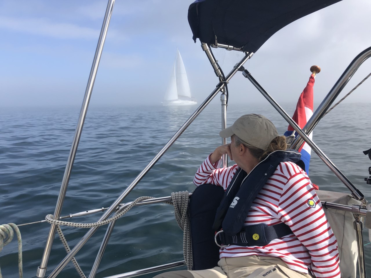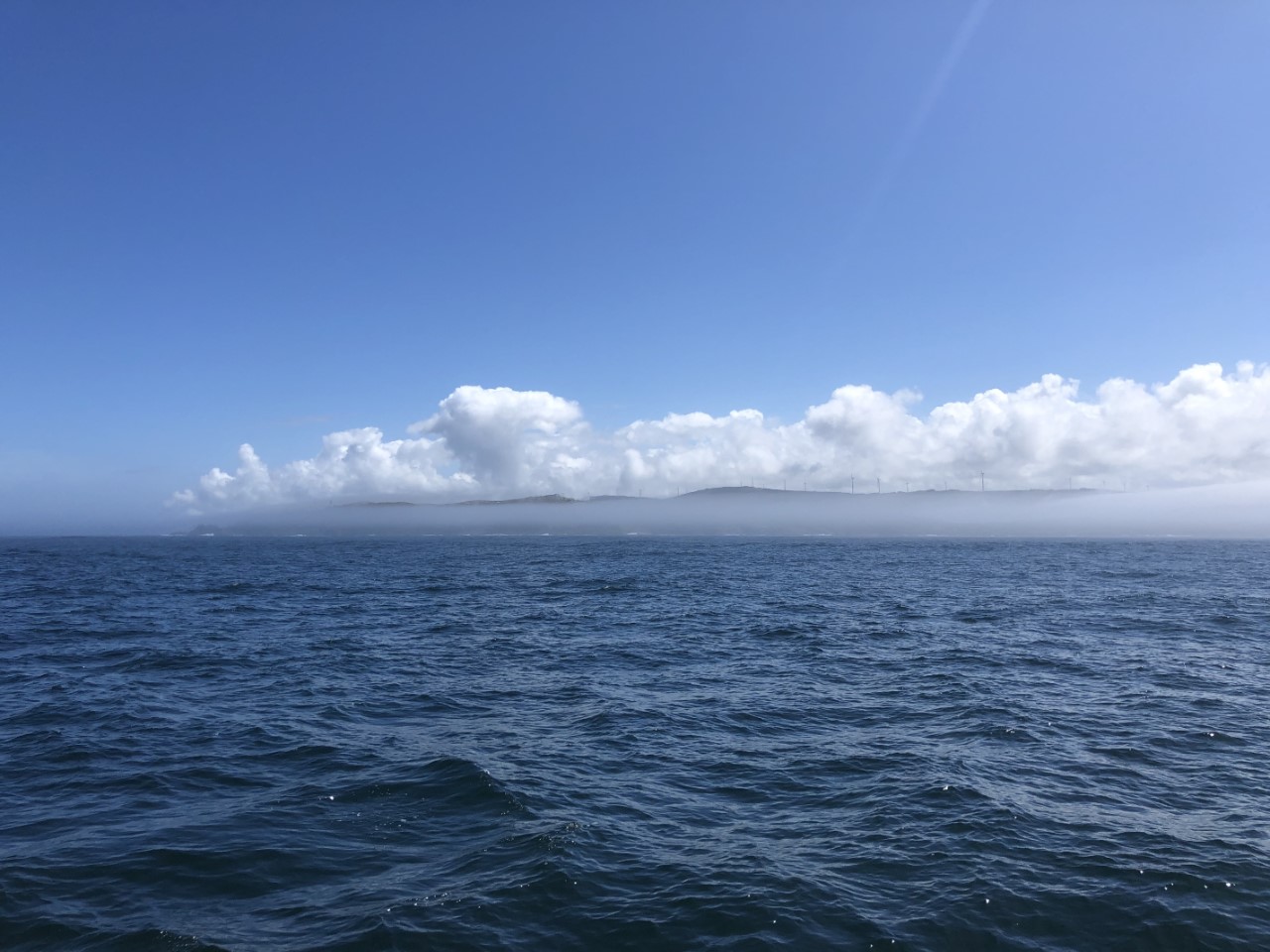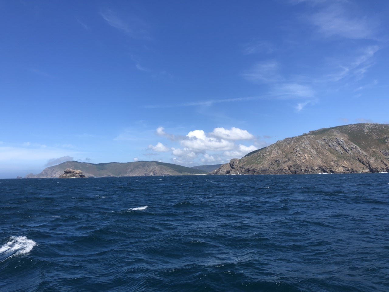 We hadden de bedoeling om vroeg te vertrekken. De bakker ging om 8:00 uur open en ik stond netjes voor de deur te wachten voor een deur die maar niet open ging. Marianne en Daniel zaten al achter de gedekte tafel te wachten. Ze moeten nog even geduld hebben, de supermarkt gaat pas om 9:00 uur open. Na een laat ontbijt hebben we voor ons vertrek met onze Nederlandse buren een praatje gemaakt. De buurman wilde solo in 3,5 jaar rond de wereld zeilen, maar vond het toch te saai zonder de buurvrouw. Ze waren nu samen onderweg terug naar Nederland. Bijna samen met de Pincoya en de Annie zijn we vertrokken verder naar het zuiden. Even buiten de Ria trok er een dikke mist op, die rondom een zicht gaf van 30 meter. Het gekke was, dat boven ons een strak blauwe hemel was met een lekker zonnetje. Als we naar de kust keken zagen we een grijze massa waar je nog net aan de bovenkant een wiek van een windmolen zag draaien. Na eerst even alleen met de fok te hebben gevaren, ging al snel het grootzeil bij. De snelheid was nog niet om over naar huis te schrijven, maar het was de juiste snelheid om te vissen. Daniel had alle vislijnen uitstaan achter de Just. De ene voor makreel en de andere voor tonijn. De mist bleef nog lang hangen. We zagen later prachtig hoe de mist in de bergen hing. Al gauw vaarden we in een fel zonnetje. De wind trok steeds iets meer aan en nadat we het meest westelijke puntje van Spanje hadden gerond gingen we dan echt zuidelijk varen met steeds meer snelheid. De zeilen stonden als melkmeisje, dat is niet mijn meest favoriete koers. Vooral bij de oceaandeining is het lastig als de giek helemaal uitstaat. Bij een hoge golfbeweging geeft deze steeds een klap, ondanks de bulletalie die ik had gemaakt. Ook de fok verliest zijn wind en vult zich weer met een klap. Bij Cabo Finisterre gingen we hoog aan de wind, met nog even een flinke windstoot en daarna zo diep mogelijk de Ria van Finisterre in. We gingen door tot Ensenada Del Sardineiro, waar we voor Playa Estorde een ankerplekje vonden. De windvoorspellingen zeggen, dat de wind voor de nacht niet veel gaat afnemen, maar we liggen stevig vast achter ons anker en golven zijn er nauwelijks. Ik denk dat we vannacht maar moeten dromen hoe lekker die tonijn had kunnen smaken, want we hebben weer niks gevangen.