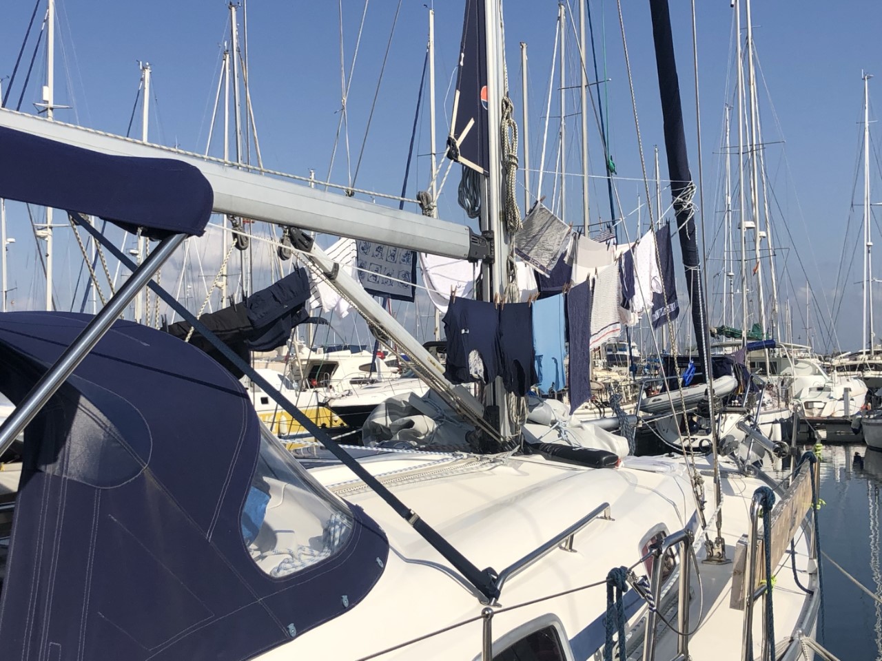 Vanmorgen hebben we gelijk alle was bij elkaar gezocht en de machine volgepropt. Al snel hing op de Just alles te drogen. De Primevere en de Anaïs vertrokken naar de volgende haven en we hebben ze uitgezwaaid.