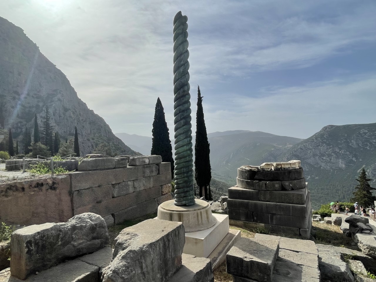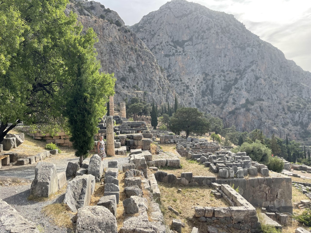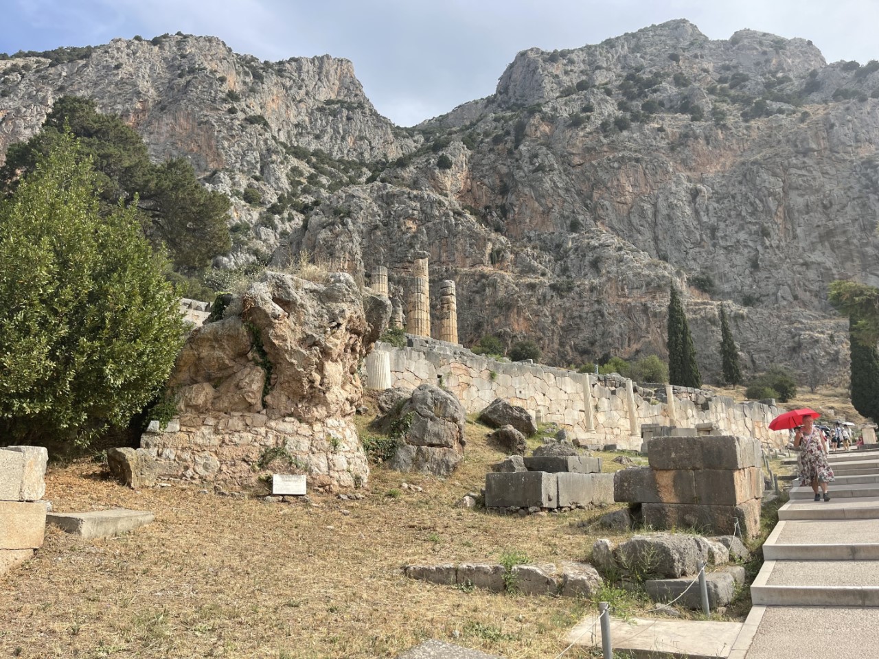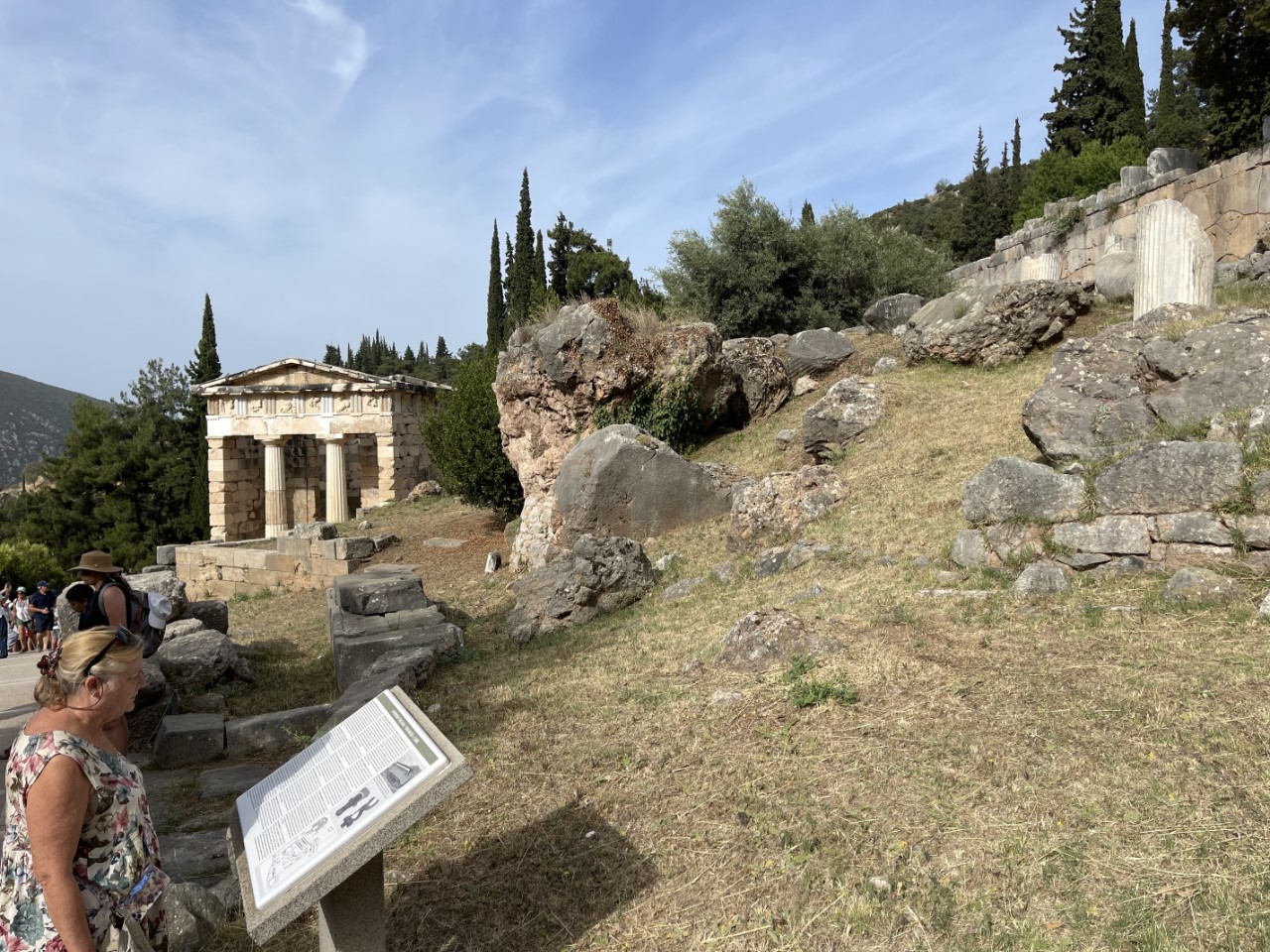 Het is even zoeken naar een parkeerplaatsje bij Delphi. Die zijn er namelijk weinig en veel auto’s stonden in de berm. Beetje raar voor zo’n toeristische trekpleister. Omdat het nog vroeg is, vinden we een mooi leeg plekje vlakbij het museum. Als eerste bekijken we alles buiten, om voor het heetst van de dag dat te hebben gedaan. We zien de tempel van Apollo waar het orakel was, het centrum van de Aarde volgens de oude Grieken, een groot altaar, een agora en heel veel treasuries (een soort pakhuis dat werd gevuld door de gelovigen met gouden, zilveren, bronzen en ivoren beeldjes). Op borden staat aangegeven wat er ooit verder te zien was, zoals de koets van de zonnegod, een stier en een flinke hoeveelheid beelden die nog wel zijn gevonden, zoals de wagenmenner en de sphinx, die in het museum staan.