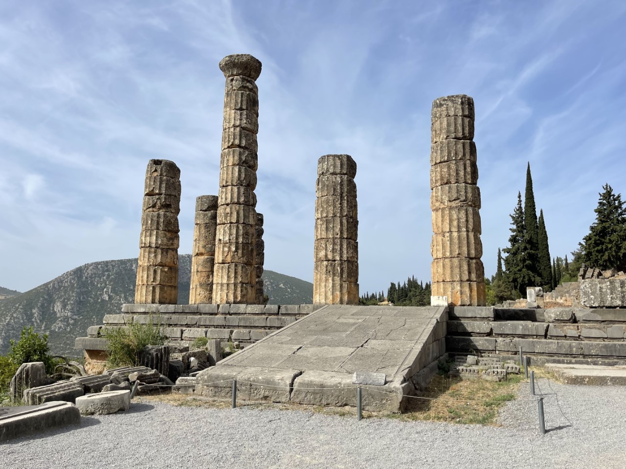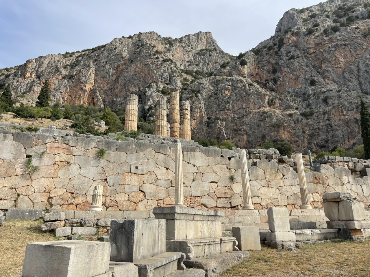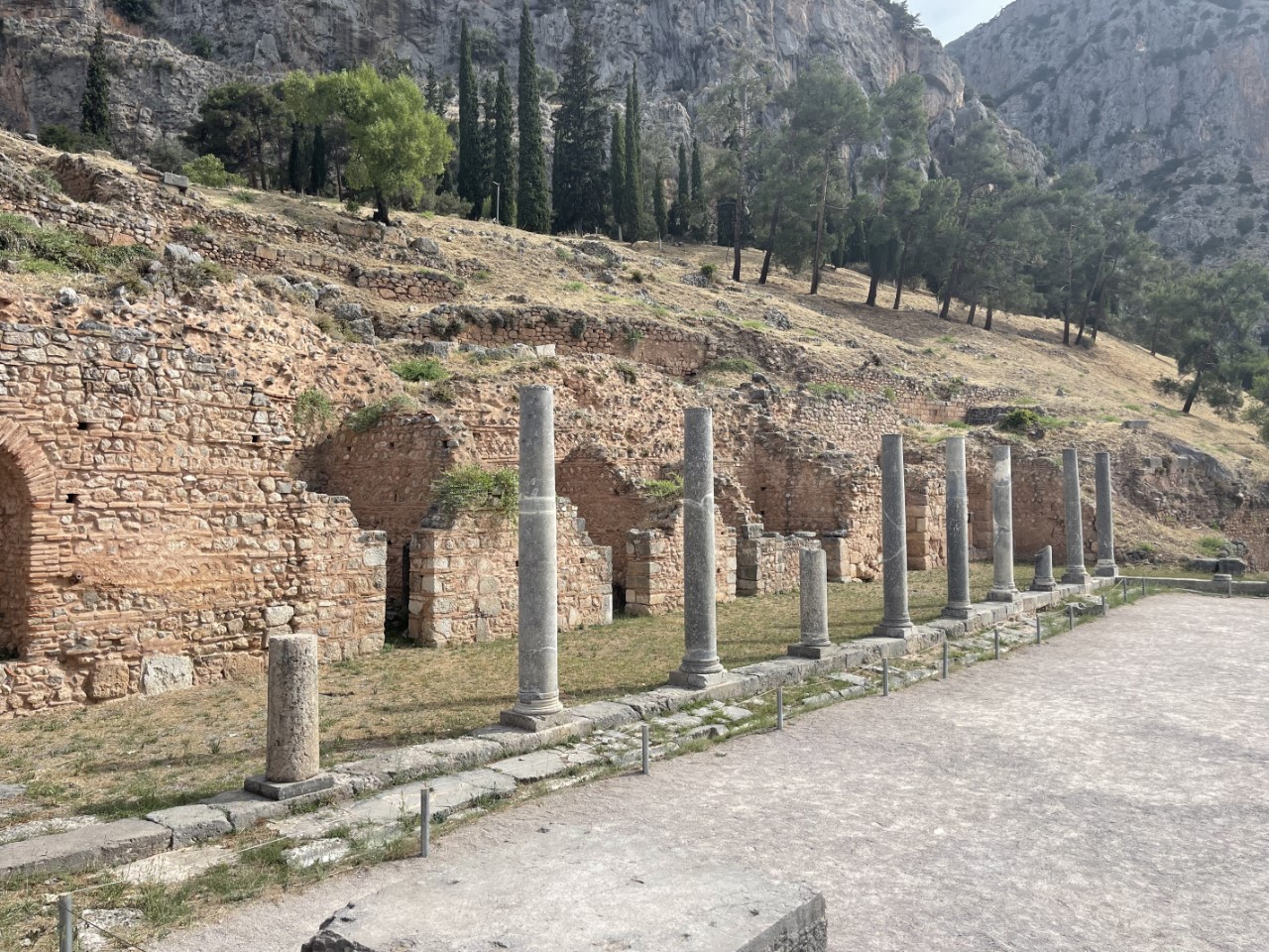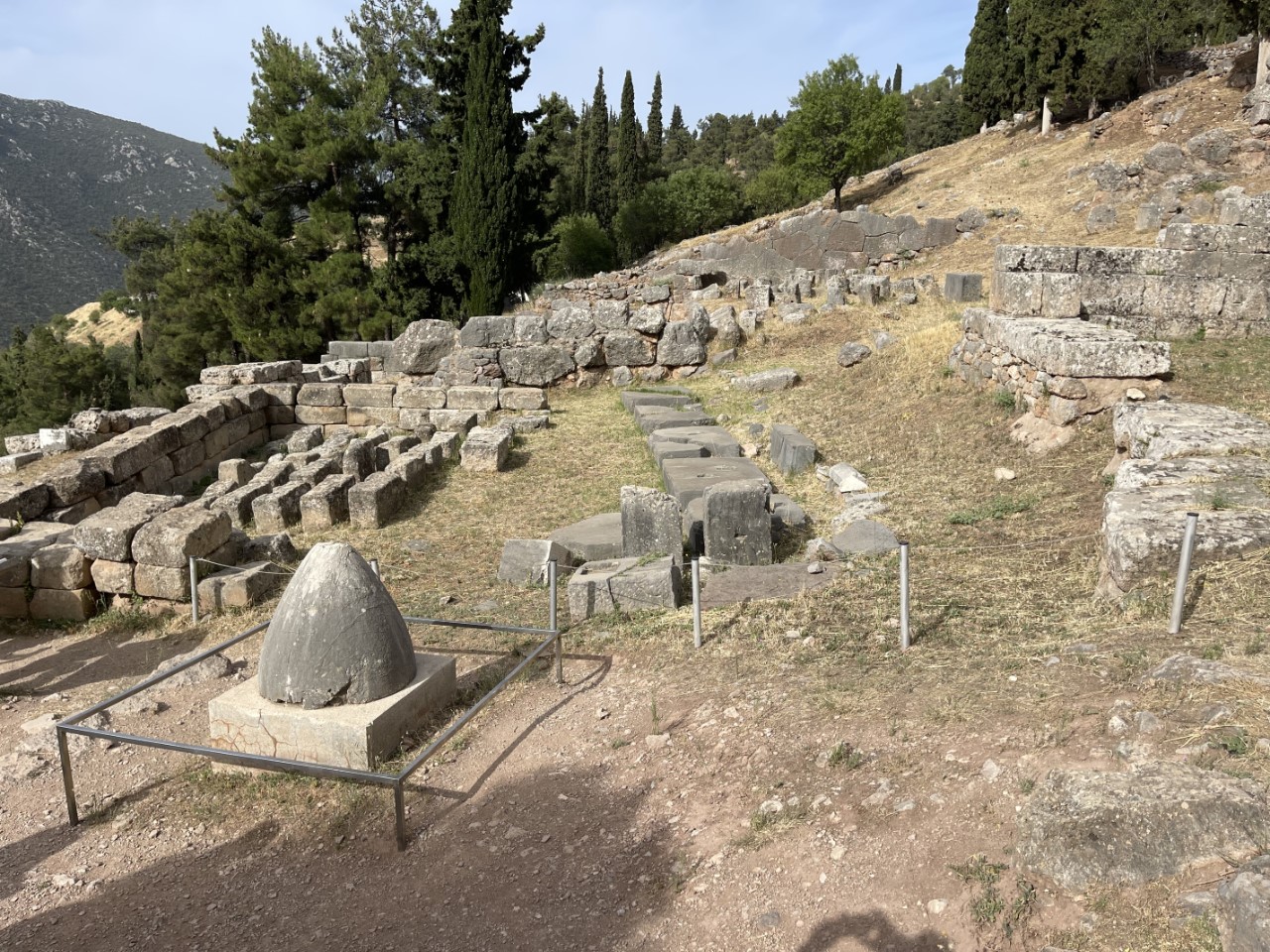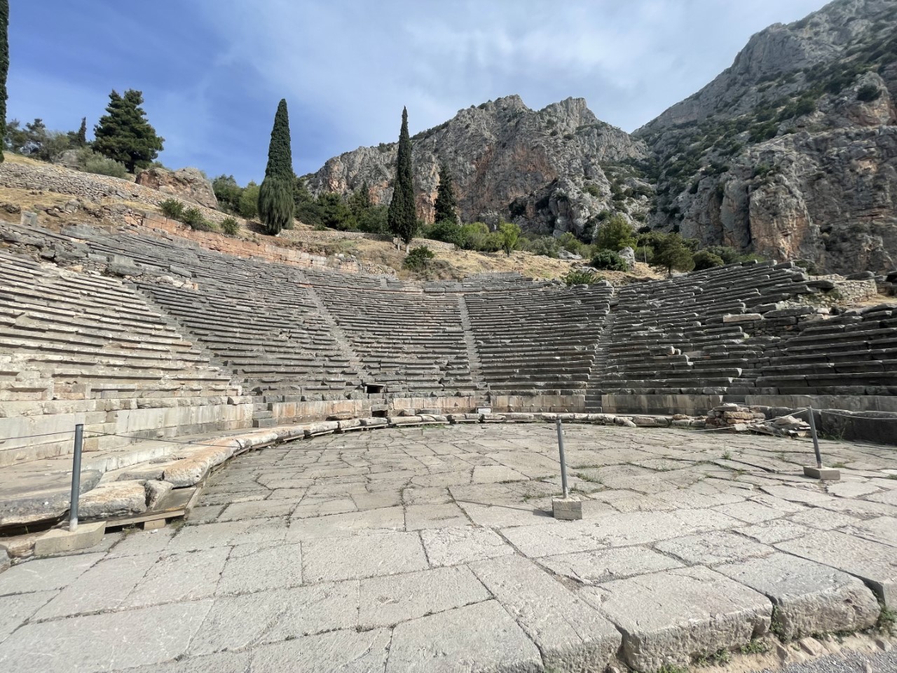 Het is even zoeken naar een parkeerplaatsje bij Delphi. Die zijn er namelijk weinig en veel auto’s stonden in de berm. Beetje raar voor zo’n toeristische trekpleister. Omdat het nog vroeg is, vinden we een mooi leeg plekje vlakbij het museum. Als eerste bekijken we alles buiten, om voor het heetst van de dag dat te hebben gedaan. We zien de tempel van Apollo waar het orakel was, het centrum van de Aarde volgens de oude Grieken, een groot altaar, een agora en heel veel treasuries (een soort pakhuis dat werd gevuld door de gelovigen met gouden, zilveren, bronzen en ivoren beeldjes). Op borden staat aangegeven wat er ooit verder te zien was, zoals de koets van de zonnegod, een stier en een flinke hoeveelheid beelden die nog wel zijn gevonden, zoals de wagenmenner en de sphinx, die in het museum staan.
