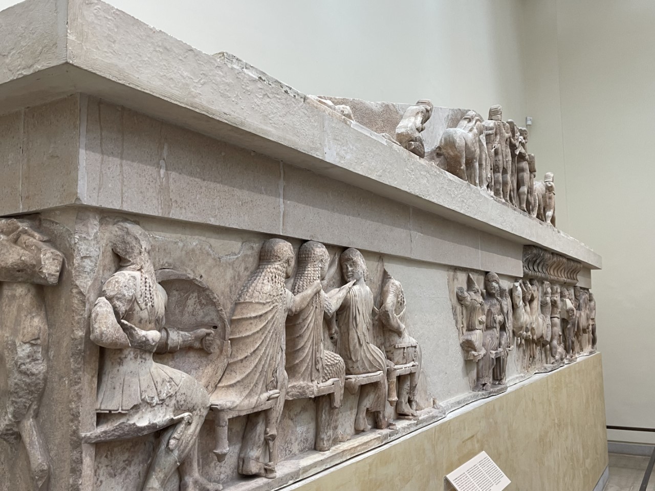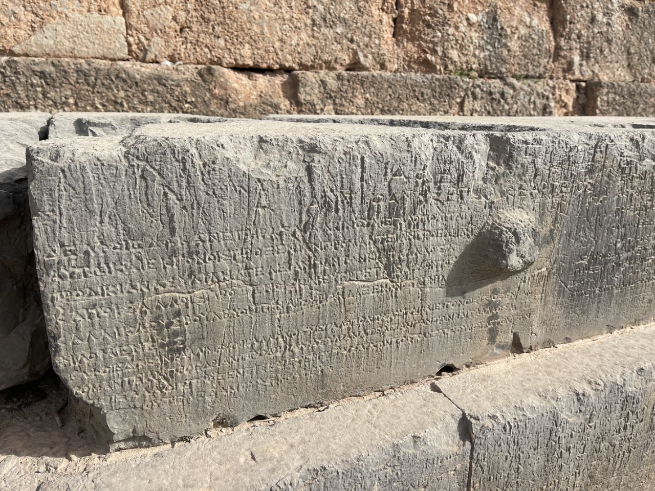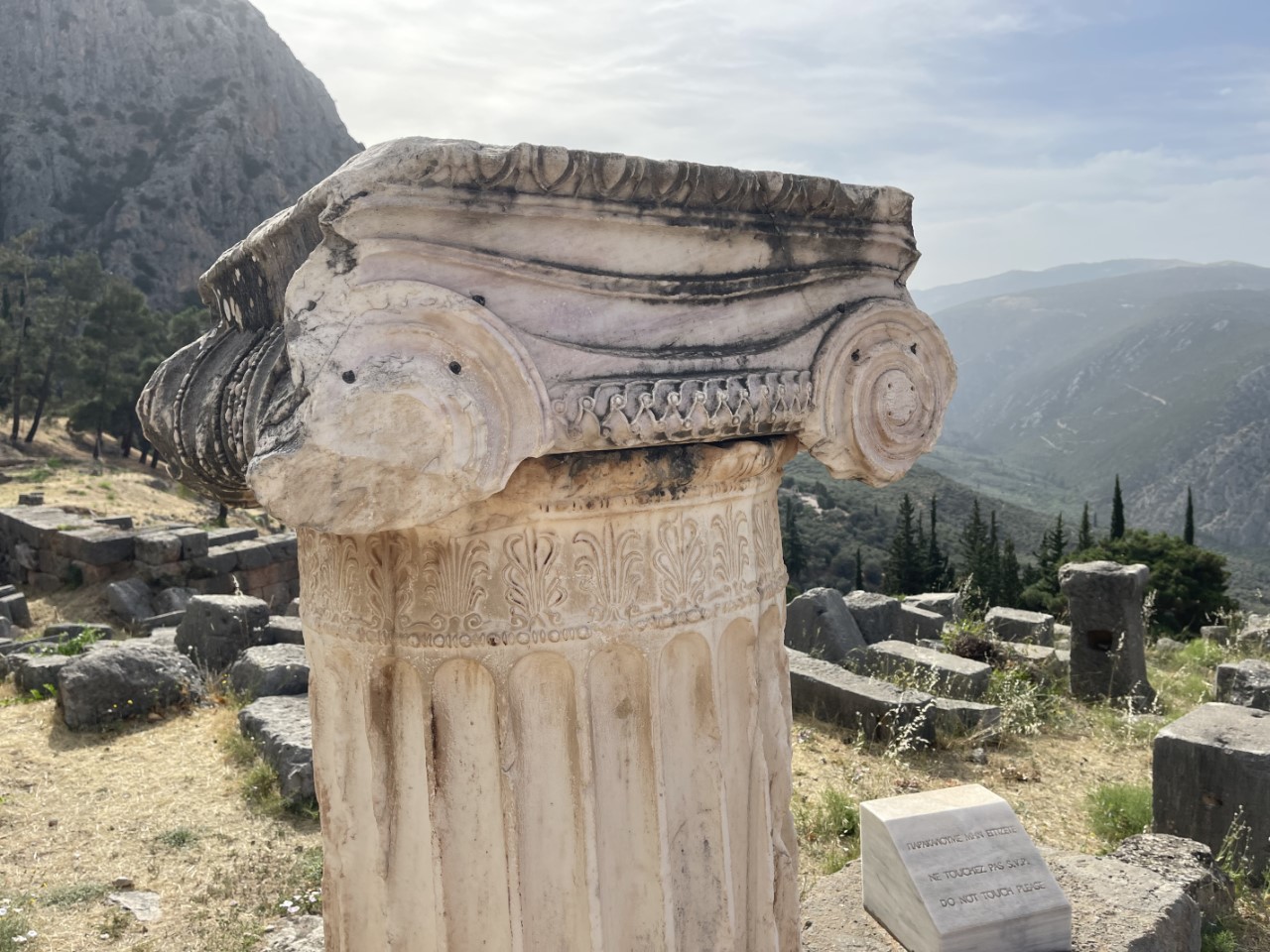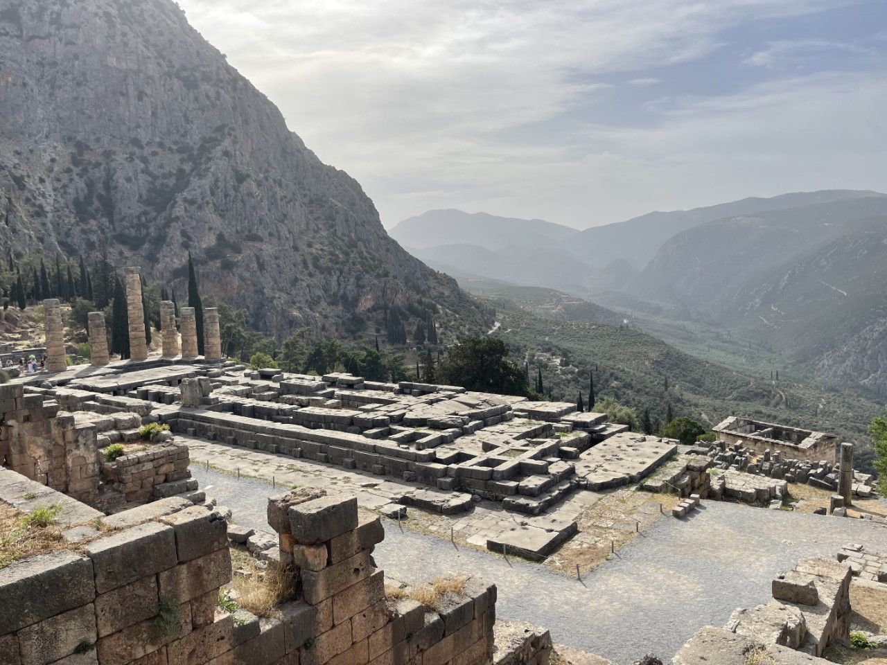 Het is even zoeken naar een parkeerplaatsje bij Delphi. Die zijn er namelijk weinig en veel auto’s stonden in de berm. Beetje raar voor zo’n toeristische trekpleister. Omdat het nog vroeg is, vinden we een mooi leeg plekje vlakbij het museum. Als eerste bekijken we alles buiten, om voor het heetst van de dag dat te hebben gedaan. We zien de tempel van Apollo waar het orakel was, het centrum van de Aarde volgens de oude Grieken, een groot altaar, een agora en heel veel treasuries (een soort pakhuis dat werd gevuld door de gelovigen met gouden, zilveren, bronzen en ivoren beeldjes). Op borden staat aangegeven wat er ooit verder te zien was, zoals de koets van de zonnegod, een stier en een flinke hoeveelheid beelden die nog wel zijn gevonden, zoals de wagenmenner en de sphinx, die in het museum staan.