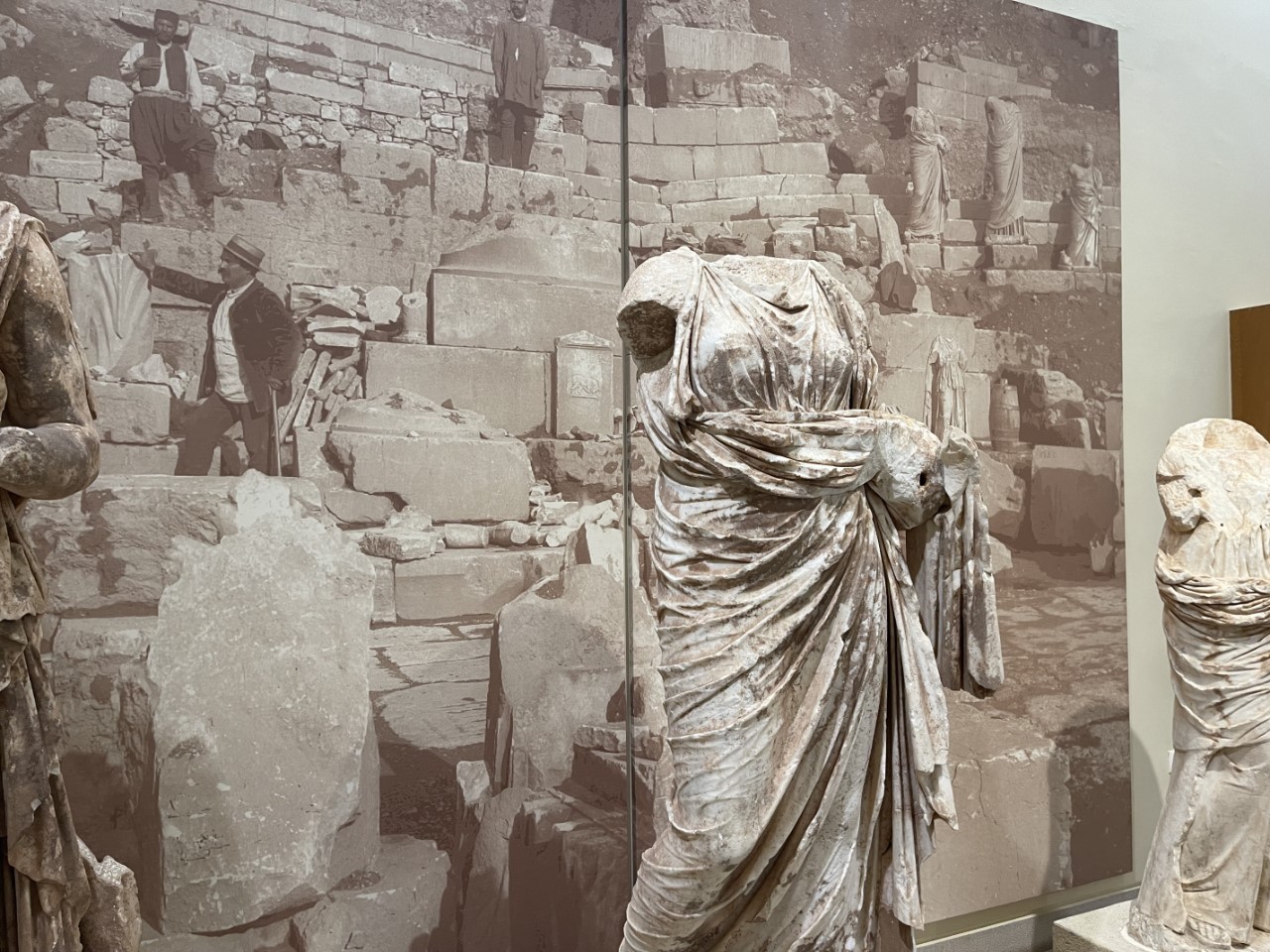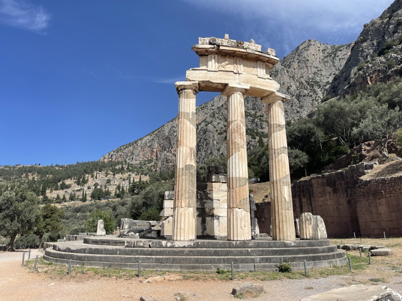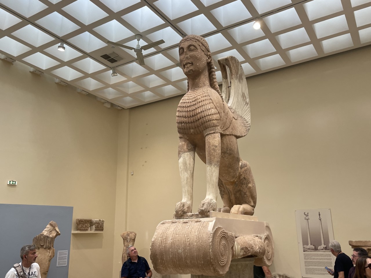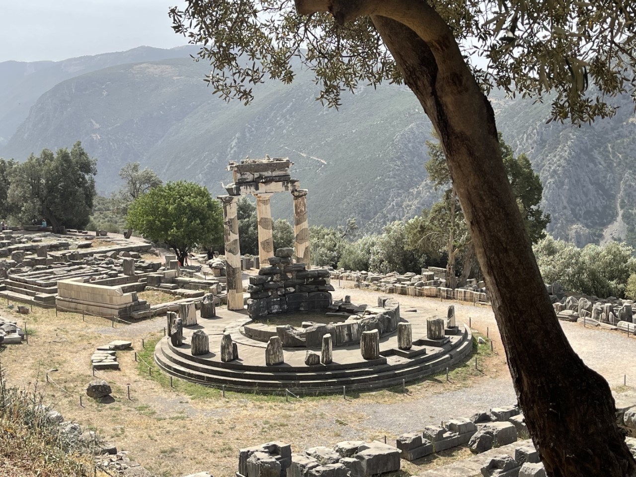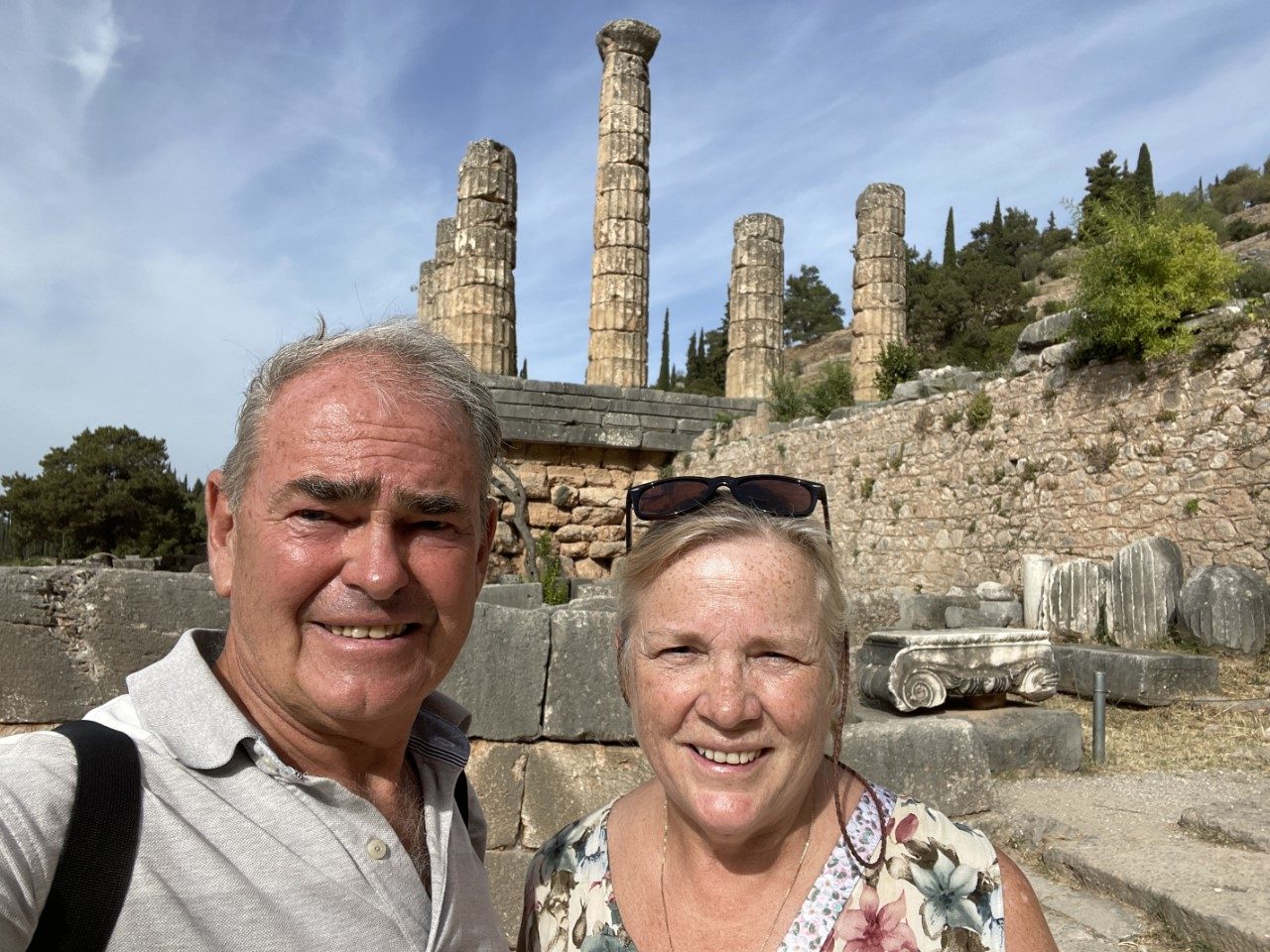 We bekijken alles uitgebreid en dan is het een warme wandeling naar het volgende Tempelcomplex met de tempel van Athene en de Tholos, wat een mooi overblijfsel is van een rond tempeltje met wat zuilen. Als laatste bezoeken we het museum. Daar is het erg druk met grote groepen toeristen, maar het is er lekker koel. We zien er de mooie standbeelden, die ooit bij Delphi hebben gestaan. Dan begrijp je hoe dat de voorbeelden zijn geweest voor de Romeinen en daarna voor Michelangelo en Leonardo da Vinci en allerlei renaissance kunstenaars. Ongelooflijk dat er zoveel vakmanschap was om dat in die tijd te maken.