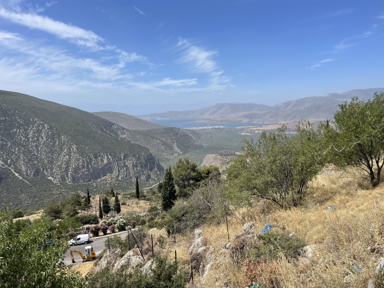 De auto staat klaar en gewapend met paraplu, sprayflesje water, ventilatortje en een flesje water zijn we klaar voor het bezoek aan Delphi. De rit naar Delphi is prachtig, veel vergezichten, haarspeldbochten, hoge stijgingen en dalingen, veel mooie struiken met kleurige bloemen (Oleander in wit en roze) en veel cipressen, pijnbomen en olijfbomen langs de weg. Griekenland blijkt voor het overgrote deel verrassend groen.