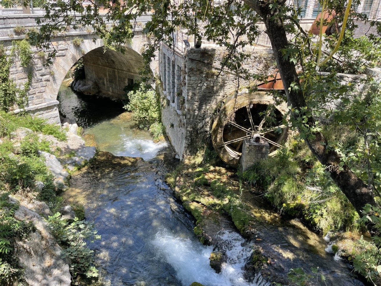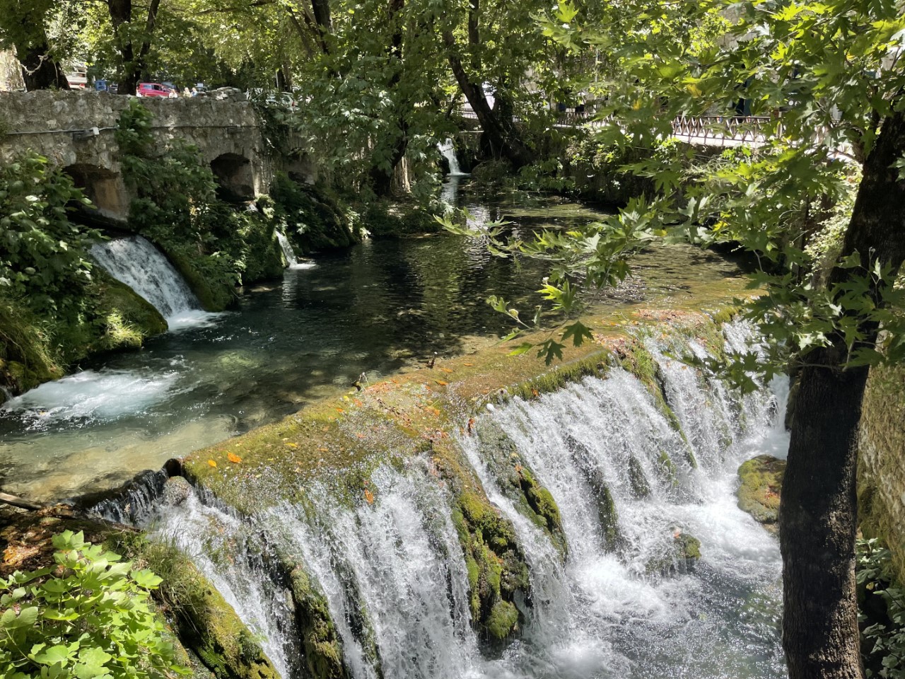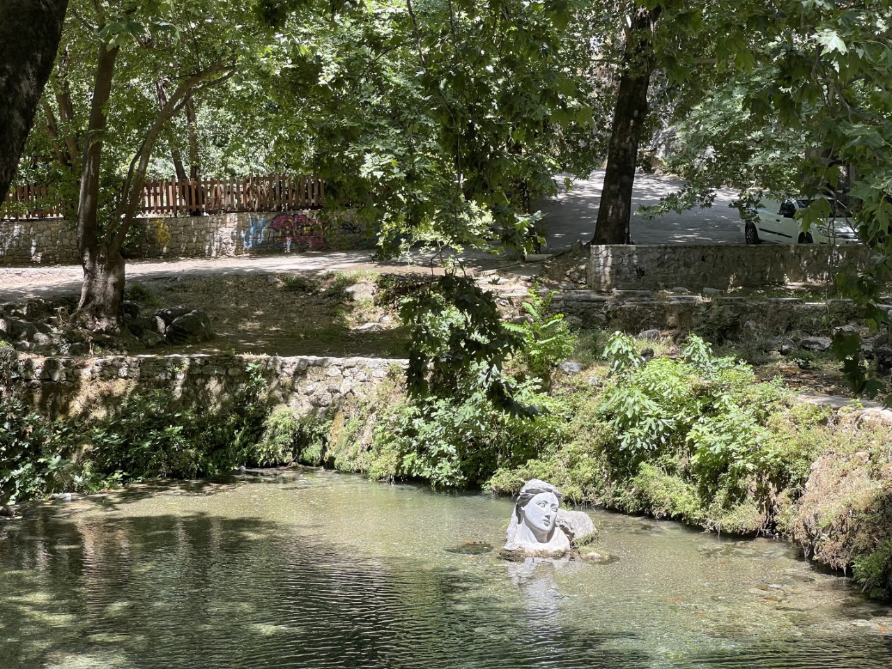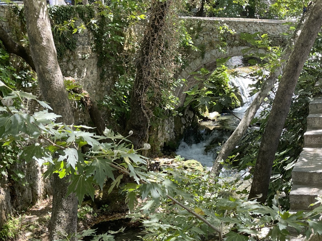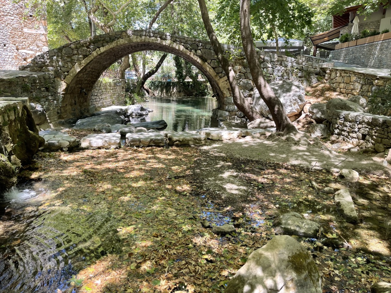 Bij het binnen rijden in Lavidia valt het wat tegen. We vinden het een beetje vervallen buitenwijkje. We parkeren de auto vlakbij een koffietentje, waar we een koude cappuccino nemen. We kijken wat er nou zo speciaal is aan dit plaatsje. We vinden het snel. Er is ook een oud theater, dat is niet het mooiste, maar de weg er naar toe is prachtig. We struinen langs een beekje met watervalletjes, oude boogbruggen en een paar watermolens, dat alles tussen hoge rotsen. En een gezellig restaurantje voor de lunch.