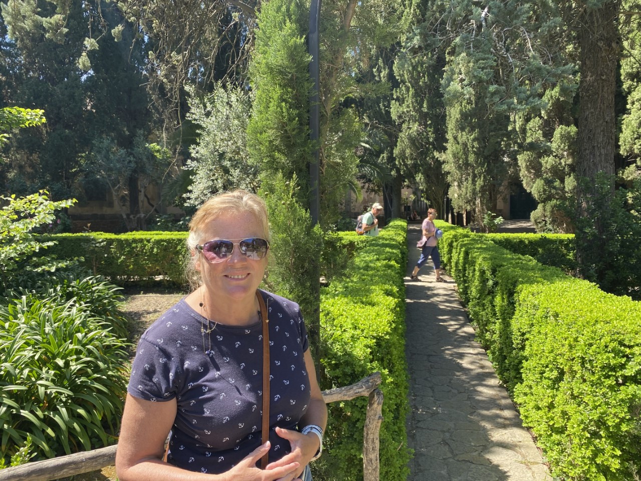 Na een gezellig praatje nemen Arno en Trudy afscheid. Zij gaan door de bergen terug wandelen naar Puerto de Soller, wij gaan een Chopin kloosterhutje bezoeken. Een drietal kamertjes met wat schilderijen en een piano en een mooie tuin. Dat is ook de enige kamer, die we in mogen, want voor de andere kamers hebben we niet het juiste ticket. Het is een beetje raar aangegeven en om zo veel drukte voor die paar kamers waar Chopin drie maanden in de winter van 1838 heeft doorgebracht, vinden we achteraf gezien een beetje onzin. Maar de omgeving en de leuke straatjes maken een hoop goed. We drinken nog even wat op een terrasje voordat we de bus terug nemen naar Soller.