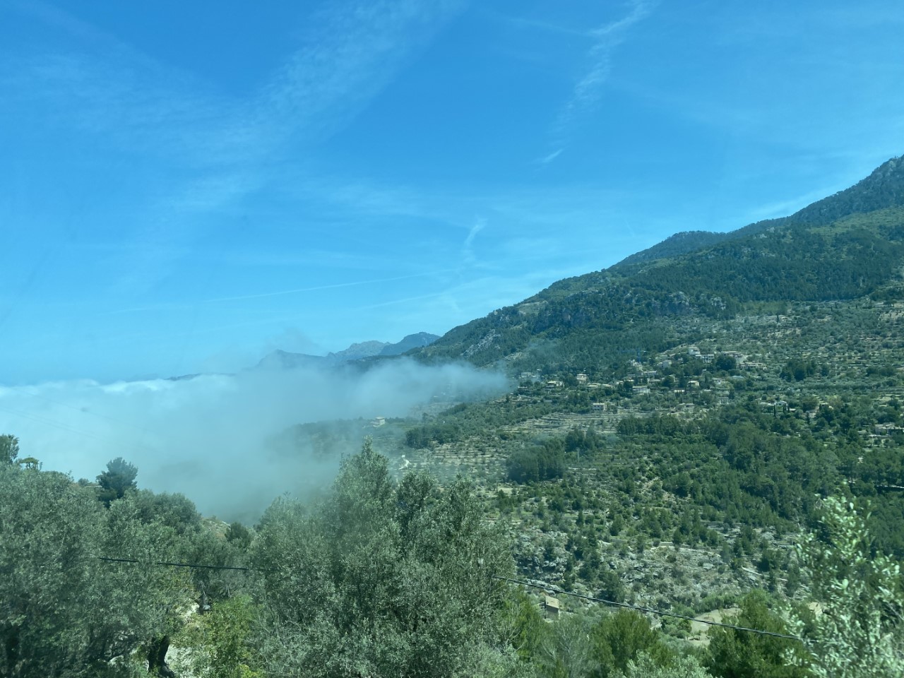 Het is weer druk bij de halte, maar de bus stopt precies met de deuren waar we staan, dus we kunnen een mooi plekje in de bus uitzoeken. De chauffeur is nog roekelozer en rijdt met een rotvaart de bergen op en af. De bergen zijn zo hoog, dat we af en toe boven de laag hangende bewolking rijden. Even later arriveren we in Soller en zijn we blij dat we mogen uitstappen. We hadden gisteren aan Wim en Ria verteld, dat we vanuit Soller zo’n mooie wandeling over de berg hadden gemaakt en dat willen zij ook wel meemaken. Maar eerst gaan we een hapje eten bij hetzelfde restaurantje waar we gisteren ook hadden gegeten. Gelukkig is er weer een ander menu del dia en het smaakt ook deze keer heerlijk.