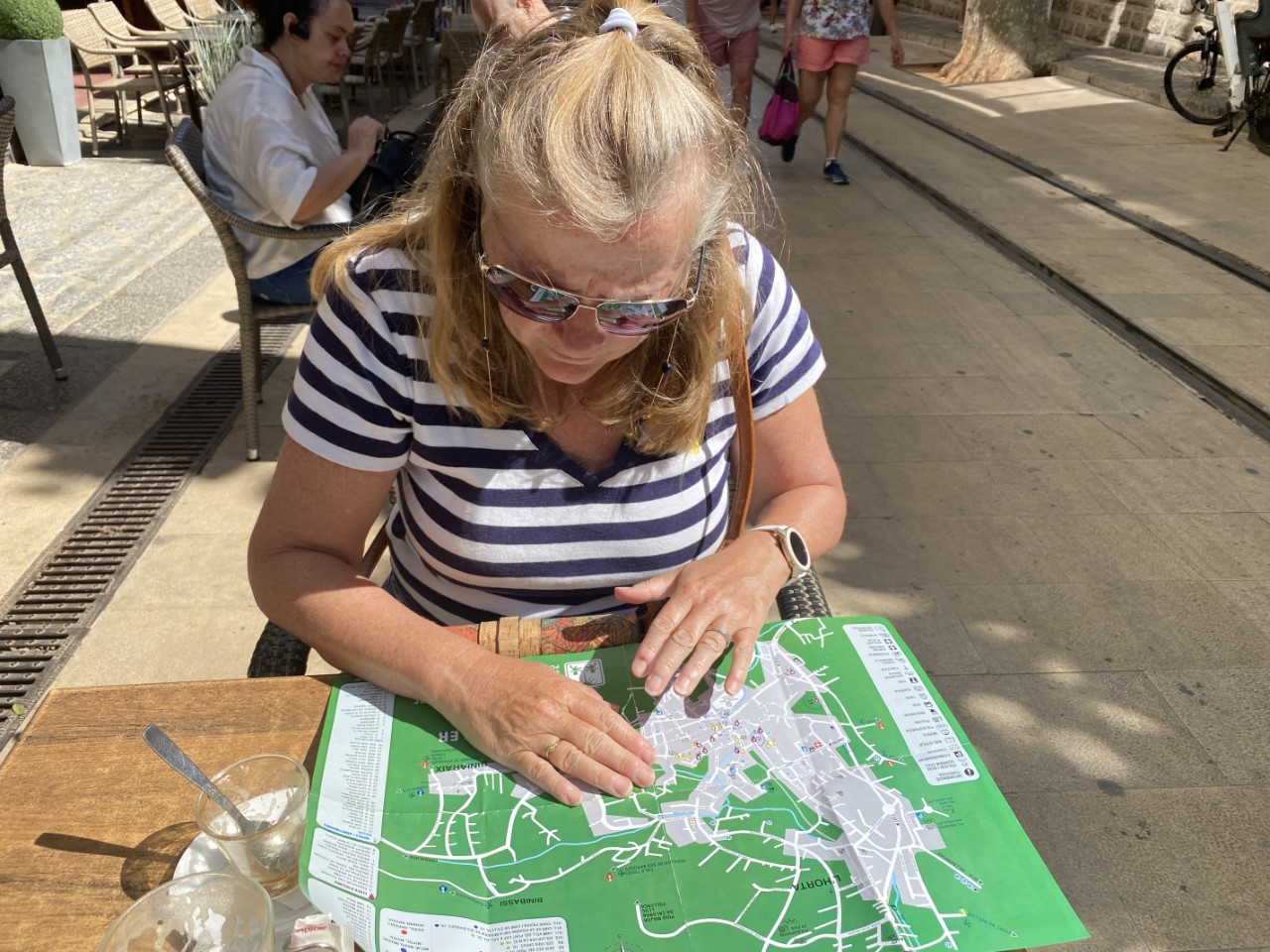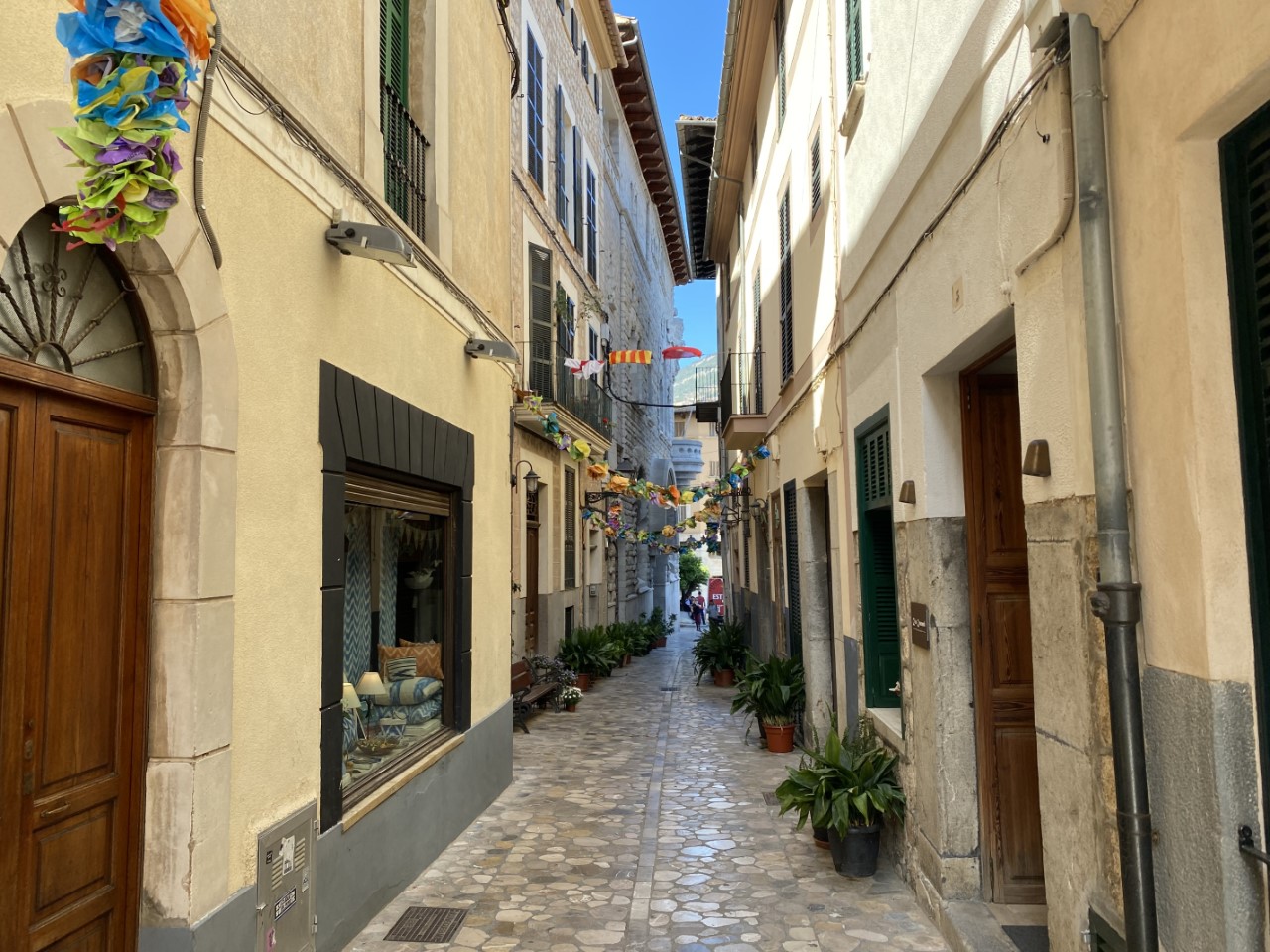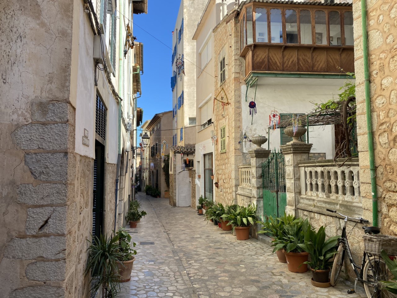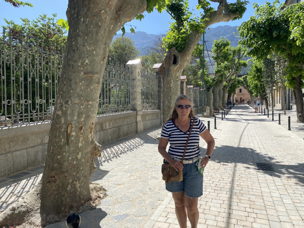 In Soller halen we eerst wat informatie bij het toerist office. Met de kaart in de hand wandelen we door veel leuke, smalle straatjes met mooie gebouwen. Veel van de gebouwen hebben uitgehouwen gevels en mooi bewerkte ijzeren balkonnen. Er is een straatje met winkeltjes met snuisterijen en er zit ook een Spaanse slager. We wandelen over leuke pleintjes met terrassen en een mooie, gesloten kerk. Bij een Spaans koffietentje met weinig toeristen drinken we een bakkie en bestuderen we de kaart goed. We zien dat er een wandelroute is voor de terugweg.