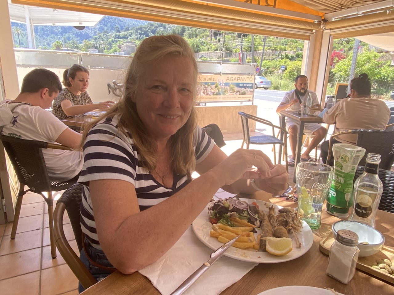 Op de Just gaan de voetjes omhoog met een lekker koud drankje. Het strand ligt bijna voor de Just, dus daar gaan we heen om nog een paar uurtjes te bakken om aan ons Mediterraanse kleurtje te werken. Morgen gaan we met de bus de bergen in.