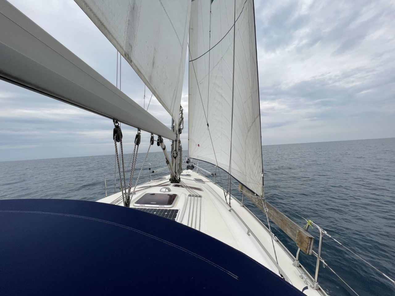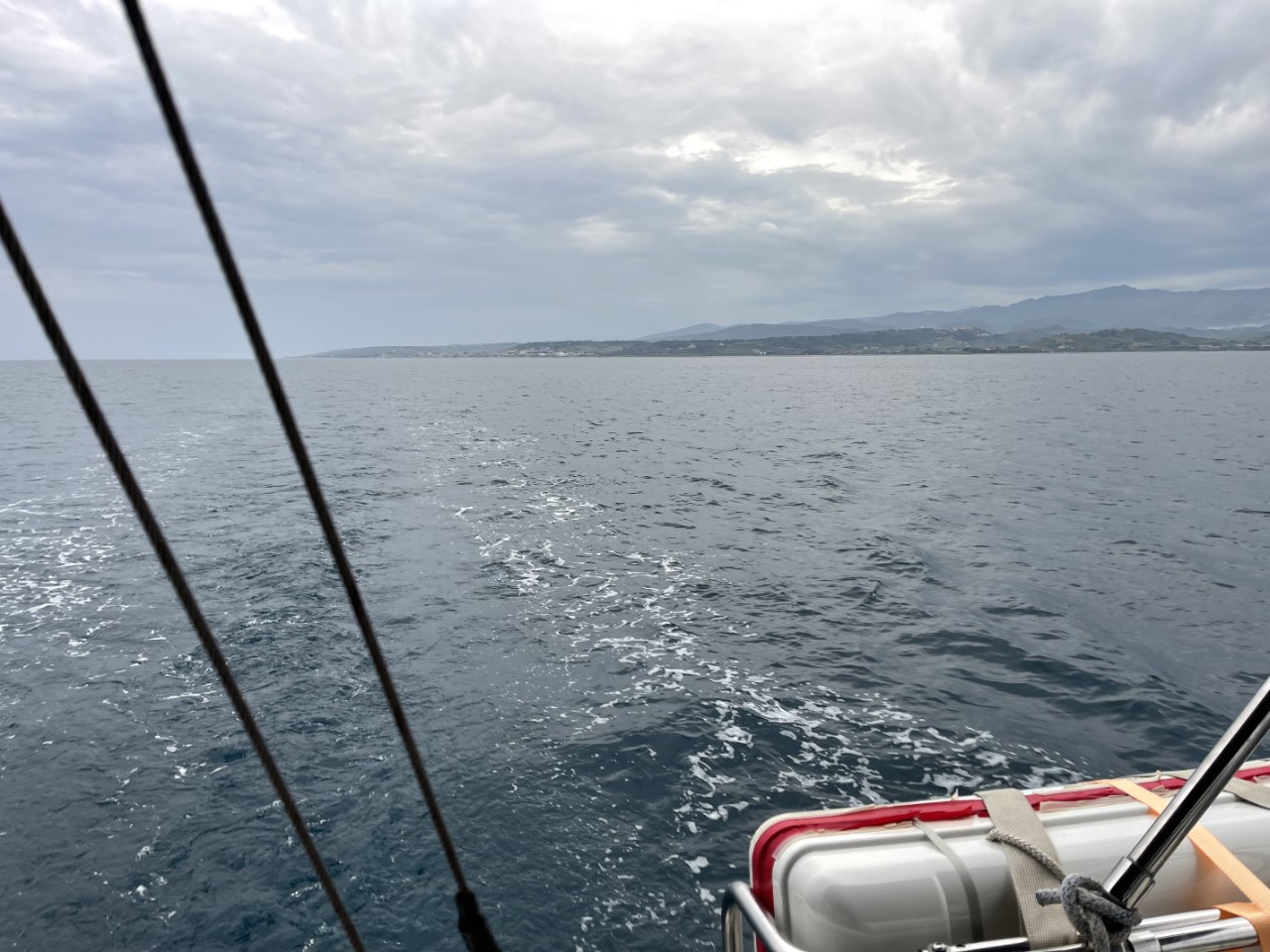 Alweer vroeg vertrekken. We willen voor de avond aankomen in Crotone. Het weer is hetzelfde als gisteren, bewolkt, af en toe een buitje en bijna windstil, dus weer op de motor.