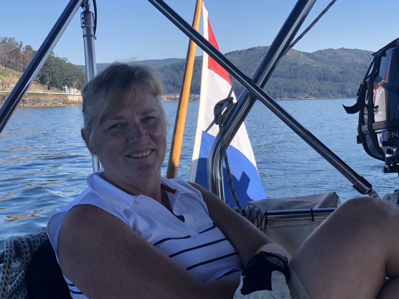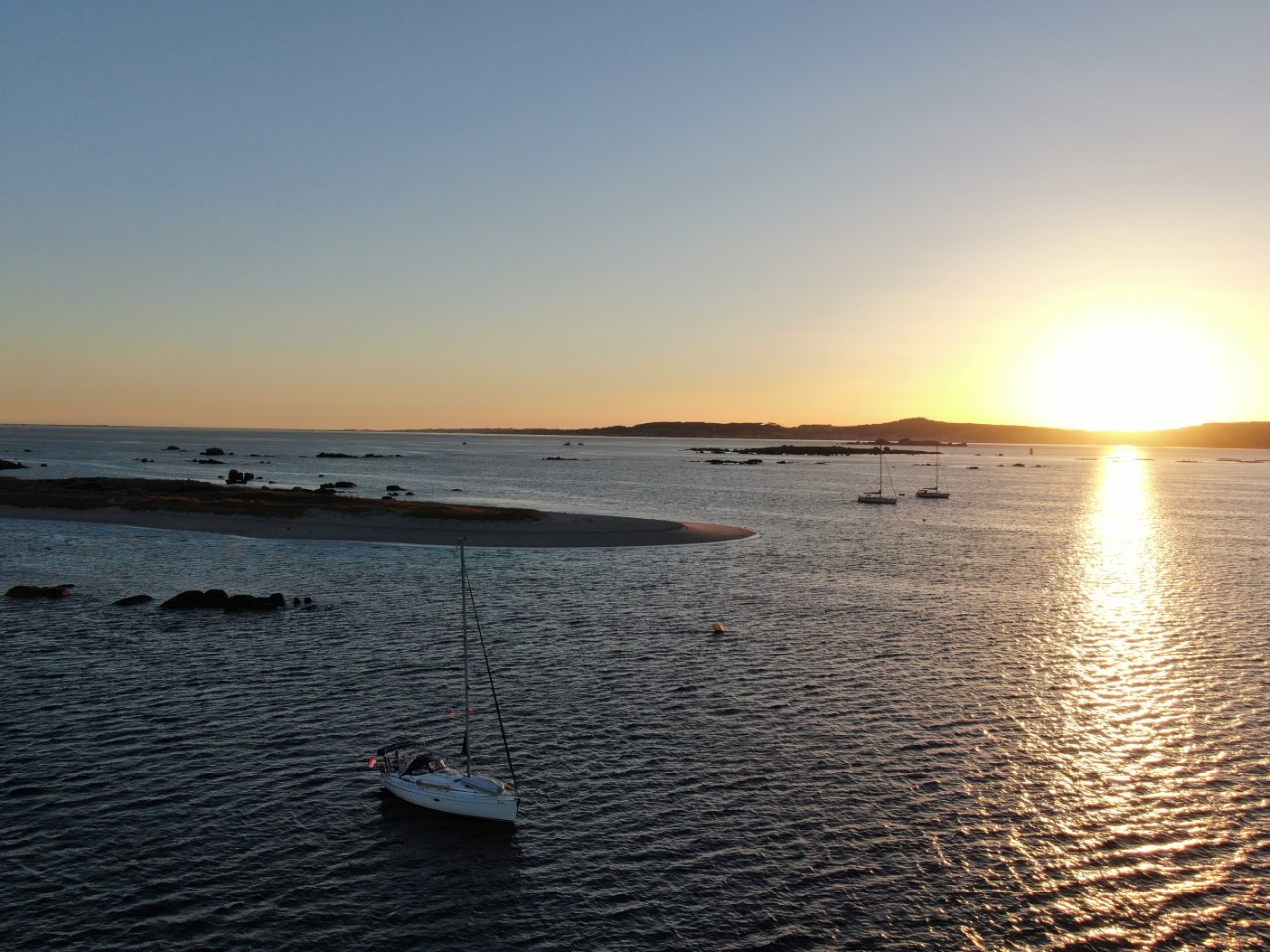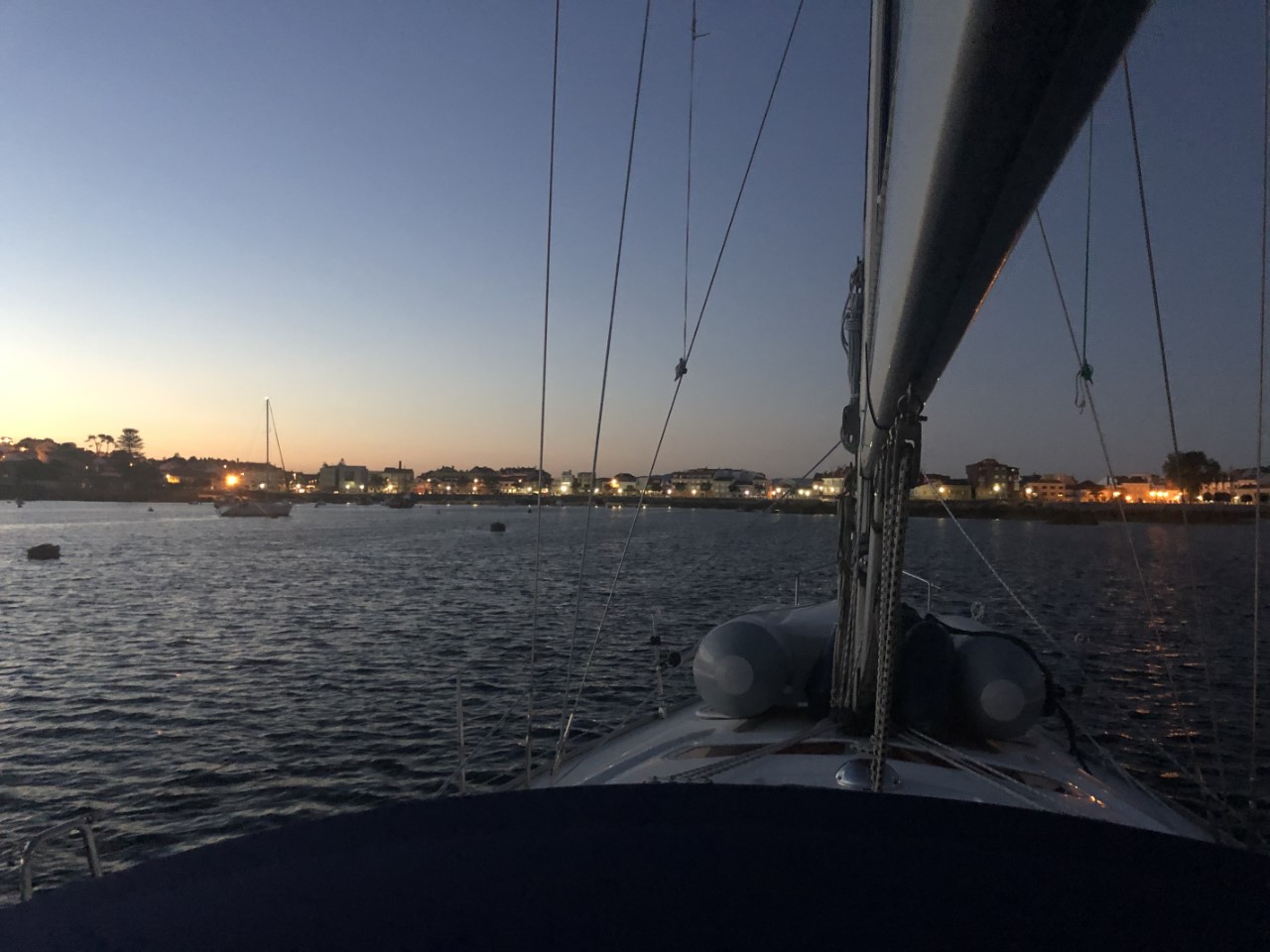 We willen nog even snel de boodschappen halen bij de supermarkt en dat is voor mij lang wachten, want de openingstijden zijn in Spanje laat, om 9:30 uur kunnen we pas terecht. We willen gaan ankeren en dan hebben we toch wat proviand nodig. Het is weer een spiegelgladde zee en geen wind. Met de motor aan en het fokje bij voor de show glijden we de Ria van Muros op vissnelheid uit. De Ria is zo groot, dat je er ruim een uur over doet om op zee te komen. Op volle zee neemt de wind toe en de motor kan uit. Met een prettige 4,5 knopen ronden we de Cabo Corrubedo. De zee blijft kalm, bijna vlak en Marianne vindt het zo prettig varen. We zijn de Ria de Arousa tussen de gevaarlijk aandoende rotsen in gevaren, alles voor de visvangst. We hebben het grootzeil ingedraaid en met het fokje hebben we helemaal tot Islote Jidoira Arenosa gezeild. De snelheid is goed, want Daniel haalt een makreel naar binnen. Ik mag aan de slag als visboer voor het onthoofden en schoonmaken. Hij ging de koelbox in, lekker voor de lunch van morgen. Bij het eilandje begon het twijfelen. Is dit een goed plekje? Hoe ligt het op de wind? En gaat de wind vannacht draaien? Na al die afwegingen hebben we na een half uur het anker maar laten zakken waar de meeste boten lagen. Zo, wij liggen goed stevig in 18 meter diep water met heel veel ankerketting uit. Vlakbij een mooi strandje met vóór ons heel veel Spaanse zeilboten. De kajakverhuurder doet goede zaken hier, want het is een constante stroom van vermoeide kajakkers. Ze zijn tegen de stroming en wind aan het peddelen om het eiland te bereiken om daar lekker wat te kunnen zwemmen en zonnen. Wij hebben de rest van de middag en avond gekeken naar de ankerende zeilboten en hun werkwijze en later naar de vertrekkende zeilboten. Toen we aankwamen lagen er rond de 40 boten voor anker, om 20:30 uur nog maar 2 boten. We zijn benieuwd of die nog gaan vertrekken, zodat we hier alleen overblijven. Het is al stil hier. De zon zakt, we hebben lekkere vissoep gemaakt op zonne-energie en maken nog een filmpje met de drone. Toch nog laat zijn we vertrokken van dit mooie eiland. De wind stak meer op, dan we hadden verwacht en we lagen lagerwal met een flinke rotspartij achter ons. We hebben nu een ankerplekje gevonden diep in de baai van Con Retallado. Nu kunnen we gerust slapen.