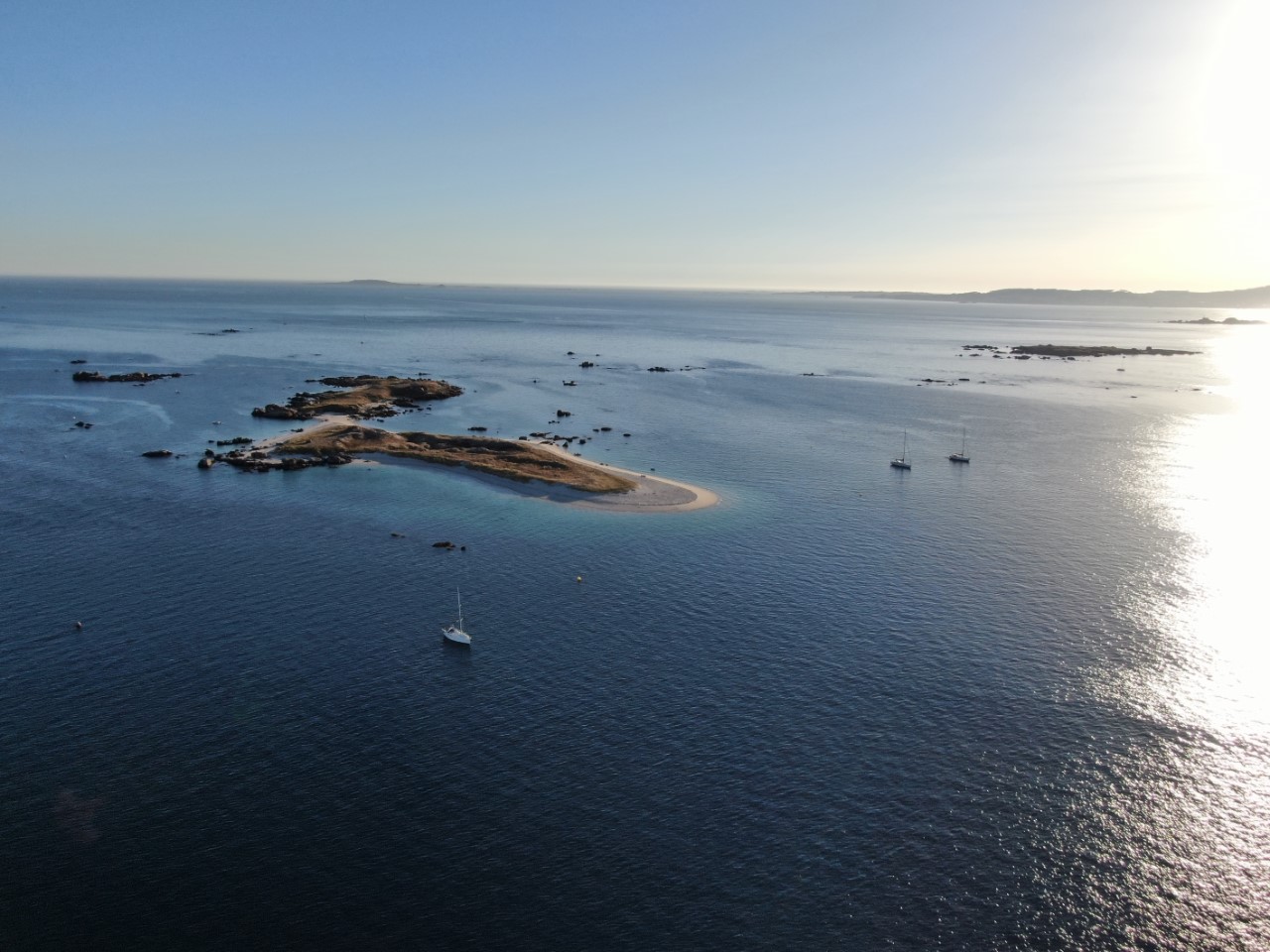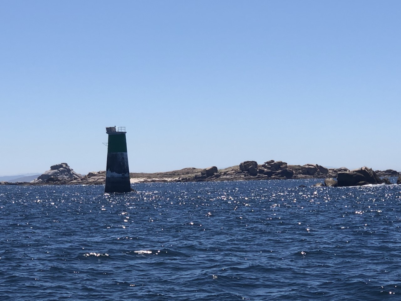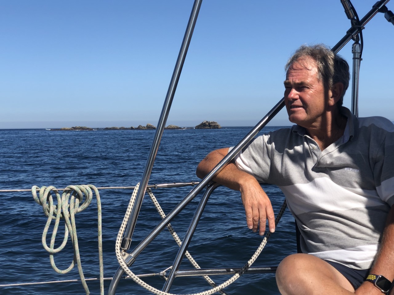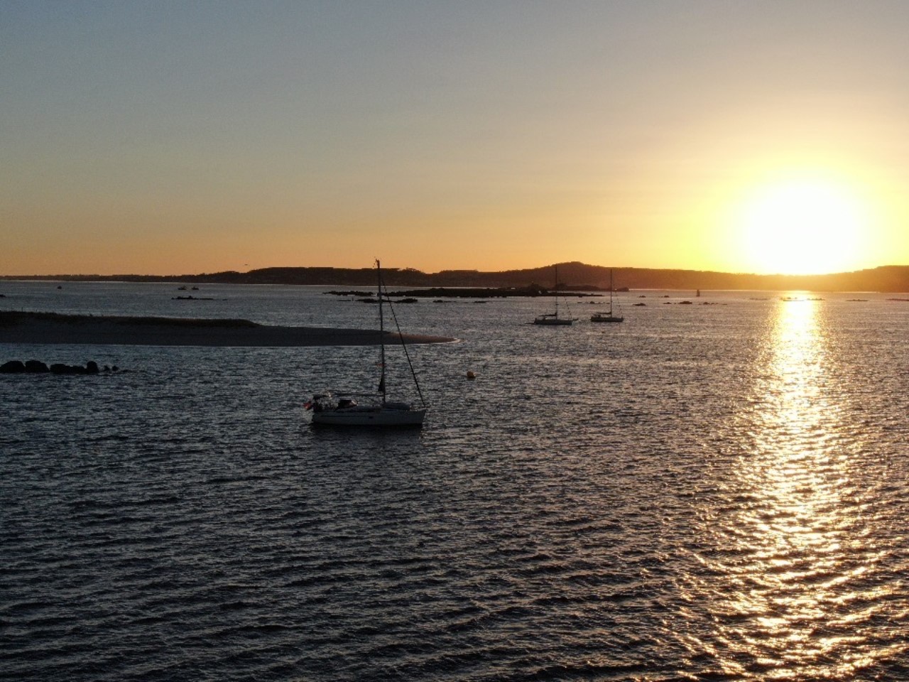 We willen nog even snel de boodschappen halen bij de supermarkt en dat is voor mij lang wachten, want de openingstijden zijn in Spanje laat, om 9:30 uur kunnen we pas terecht. We willen gaan ankeren en dan hebben we toch wat proviand nodig. Het is weer een spiegelgladde zee en geen wind. Met de motor aan en het fokje bij voor de show glijden we de Ria van Muros op vissnelheid uit. De Ria is zo groot, dat je er ruim een uur over doet om op zee te komen. Op volle zee neemt de wind toe en de motor kan uit. Met een prettige 4,5 knopen ronden we de Cabo Corrubedo. De zee blijft kalm, bijna vlak en Marianne vindt het zo prettig varen. We zijn de Ria de Arousa tussen de gevaarlijk aandoende rotsen in gevaren, alles voor de visvangst. We hebben het grootzeil ingedraaid en met het fokje hebben we helemaal tot Islote Jidoira Arenosa gezeild. De snelheid is goed, want Daniel haalt een makreel naar binnen. Ik mag aan de slag als visboer voor het onthoofden en schoonmaken. Hij ging de koelbox in, lekker voor de lunch van morgen. Bij het eilandje begon het twijfelen. Is dit een goed plekje? Hoe ligt het op de wind? En gaat de wind vannacht draaien? Na al die afwegingen hebben we na een half uur het anker maar laten zakken waar de meeste boten lagen. Zo, wij liggen goed stevig in 18 meter diep water met heel veel ankerketting uit. Vlakbij een mooi strandje met vóór ons heel veel Spaanse zeilboten. De kajakverhuurder doet goede zaken hier, want het is een constante stroom van vermoeide kajakkers. Ze zijn tegen de stroming en wind aan het peddelen om het eiland te bereiken om daar lekker wat te kunnen zwemmen en zonnen. Wij hebben de rest van de middag en avond gekeken naar de ankerende zeilboten en hun werkwijze en later naar de vertrekkende zeilboten. Toen we aankwamen lagen er rond de 40 boten voor anker, om 20:30 uur nog maar 2 boten. We zijn benieuwd of die nog gaan vertrekken, zodat we hier alleen overblijven. Het is al stil hier. De zon zakt, we hebben lekkere vissoep gemaakt op zonne-energie en maken nog een filmpje met de drone. Toch nog laat zijn we vertrokken van dit mooie eiland. De wind stak meer op, dan we hadden verwacht en we lagen lagerwal met een flinke rotspartij achter ons. We hebben nu een ankerplekje gevonden diep in de baai van Con Retallado. Nu kunnen we gerust slapen.
