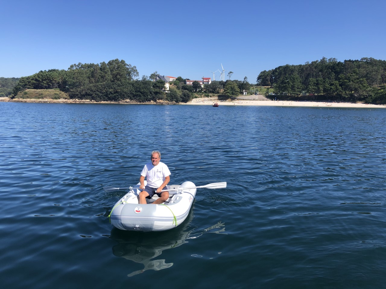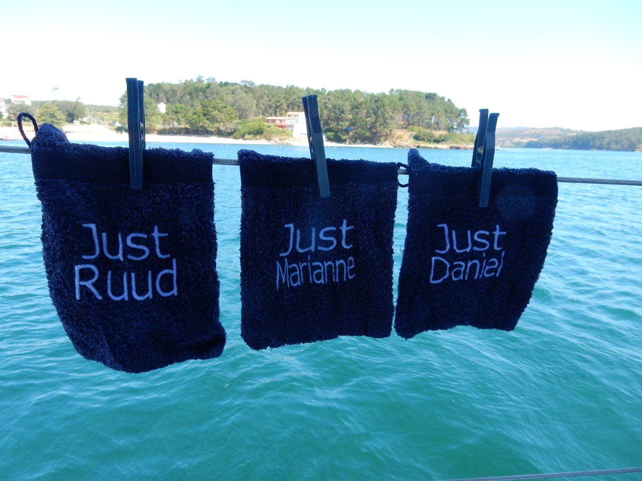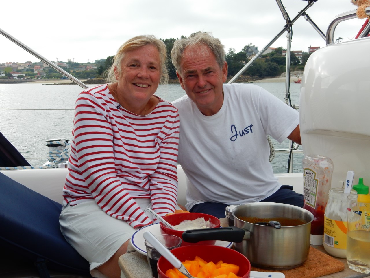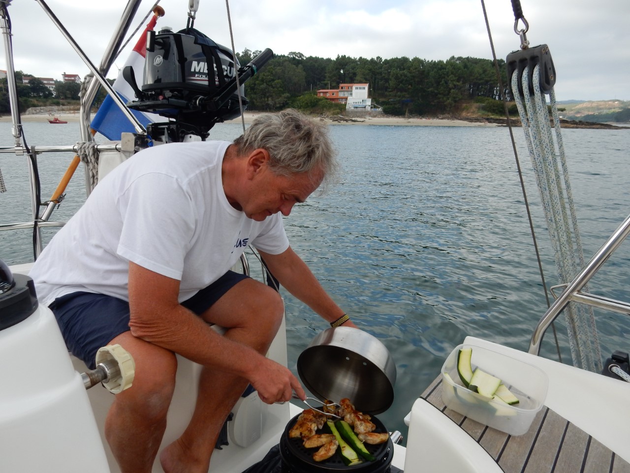 Laat vertrek uit Muxia. We gaan voor een klein tochtje de Ria overvaren. Maar waar is het beste ankerplekje en met welke wind moeten we rekening houden? Marianne had een strandje vlakbij Muxia op het oog en ik wilde graag naar de overkant. Op de Navily app stond dat bij het strandje van Marianne de bodem uit rotsen en zand bestaat en aan de overkant alleen uit zand. Dus de overkant kreeg onze voorkeur. We zijn er naartoe gevaren en hebben een mooi plekje uitgezocht, vlakbij het kleine strandje. Er staan wat bomen omheen en er zaten al mensen op het strand. Er stond nagenoeg geen wind. Ik heb de rubberboot met behulp van de genakerval te water gelaten. Ik ging even roeien en was al aardig op weg naar het haventje. Ik had echter de stroming tegen en na driekwart hield ik het voor gezien. Langzaam roeiend en deels door de stroming ging ik terug dobberend naar de Just. De crew lag al in een relaxhouding en die houding heb ik ook maar aangenomen voor de rest van de middag. In de middag trok de wind aan. Het werd ruim tegen 26 knopen en de golven klotsten tegen de Just. Wij zaten lekker achter de buiskap uit het windje en het anker hield het goed. Tegen de avond nam de wind zoals voorspeld was weer af en hebben we de Cobb aangestoken op het achterdek. Daniel dekte de kuiptafel, Marianne zorgde voor de gebakken aardappeltjes en salade en ik gooide de eerste stukjes vlees op de Cobb. We hebben nu al meer gebruik gemaakt van de Cobb dan het hele vorige jaar met de Weber BBQ. Het was een prima vaderdagkadootje van Mark en Marion. We zitten nu om 22:00 uur nog heerlijk in het kuipje in deze mooie Ria.