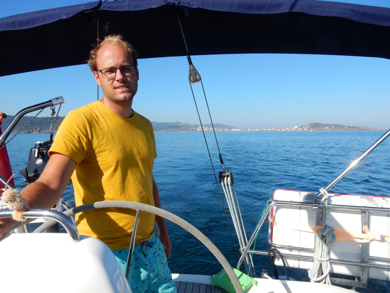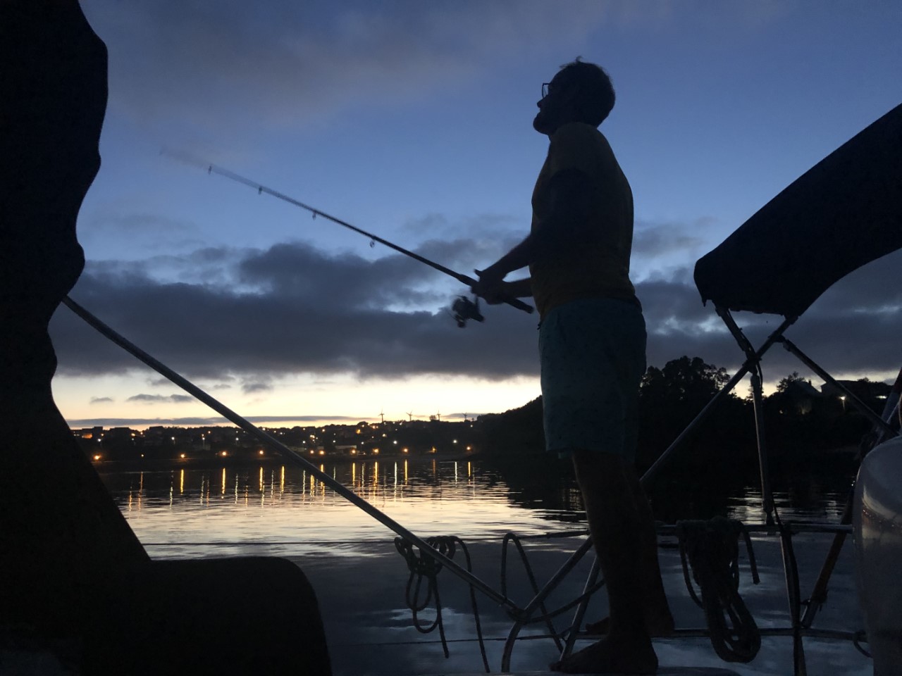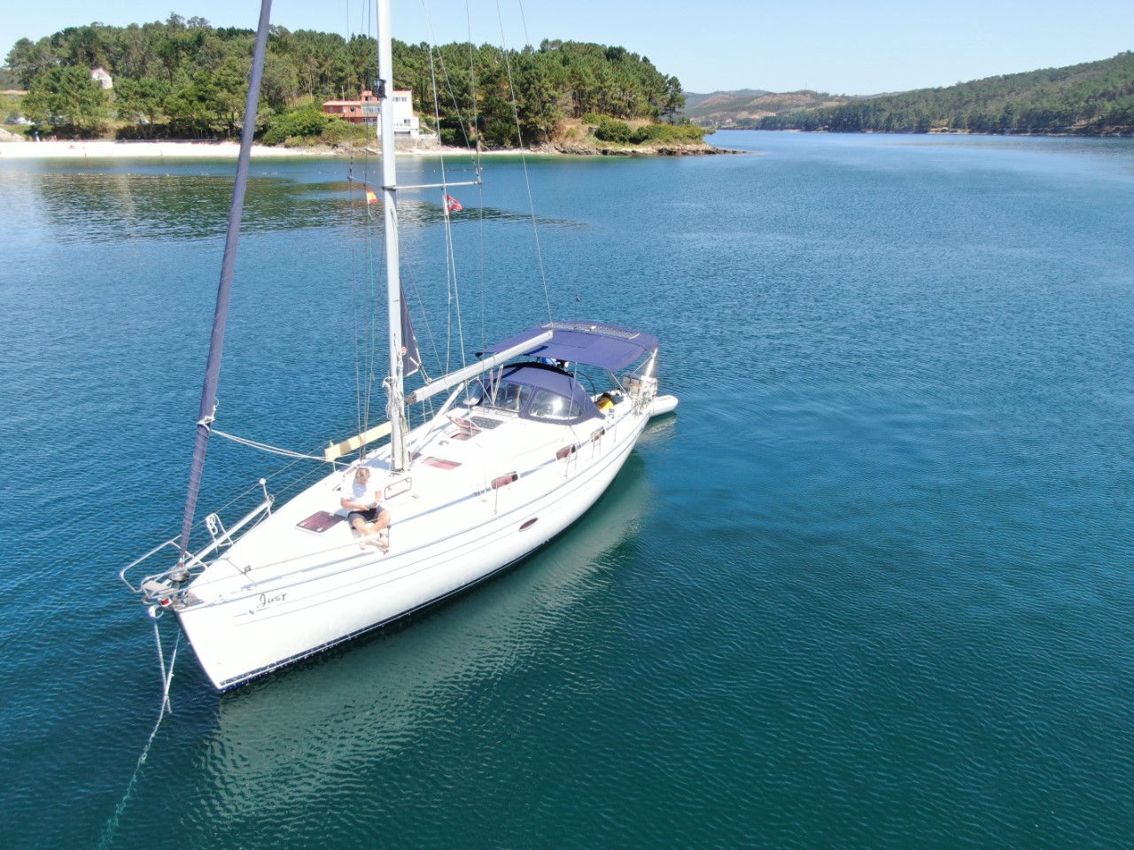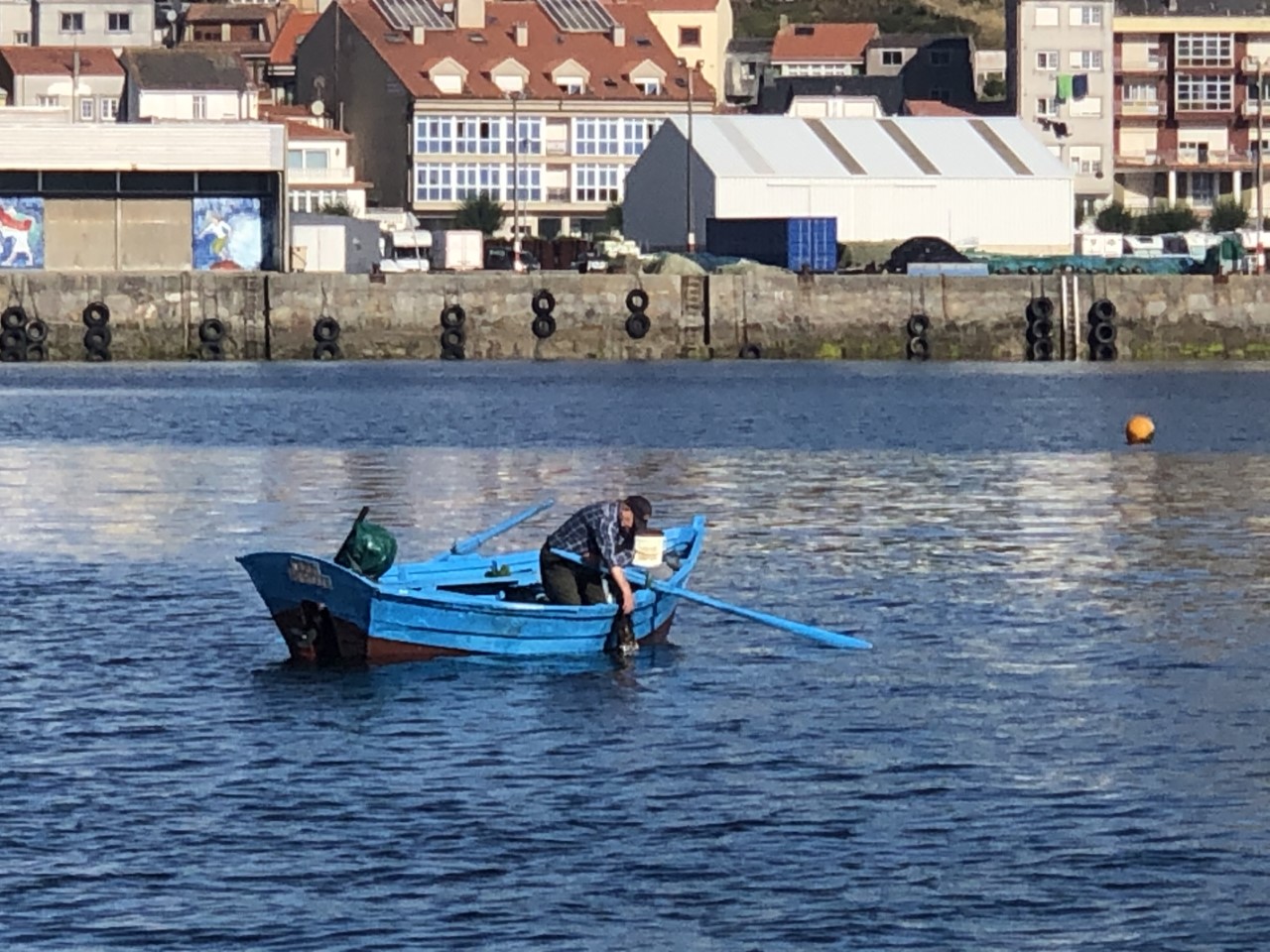 Laat vertrek uit Muxia. We gaan voor een klein tochtje de Ria overvaren. Maar waar is het beste ankerplekje en met welke wind moeten we rekening houden? Marianne had een strandje vlakbij Muxia op het oog en ik wilde graag naar de overkant. Op de Navily app stond dat bij het strandje van Marianne de bodem uit rotsen en zand bestaat en aan de overkant alleen uit zand. Dus de overkant kreeg onze voorkeur. We zijn er naartoe gevaren en hebben een mooi plekje uitgezocht, vlakbij het kleine strandje. Er staan wat bomen omheen en er zaten al mensen op het strand. Er stond nagenoeg geen wind. Ik heb de rubberboot met behulp van de genakerval te water gelaten. Ik ging even roeien en was al aardig op weg naar het haventje. Ik had echter de stroming tegen en na driekwart hield ik het voor gezien. Langzaam roeiend en deels door de stroming ging ik terug dobberend naar de Just. De crew lag al in een relaxhouding en die houding heb ik ook maar aangenomen voor de rest van de middag. In de middag trok de wind aan. Het werd ruim tegen 26 knopen en de golven klotsten tegen de Just. Wij zaten lekker achter de buiskap uit het windje en het anker hield het goed. Tegen de avond nam de wind zoals voorspeld was weer af en hebben we de Cobb aangestoken op het achterdek. Daniel dekte de kuiptafel, Marianne zorgde voor de gebakken aardappeltjes en salade en ik gooide de eerste stukjes vlees op de Cobb. We hebben nu al meer gebruik gemaakt van de Cobb dan het hele vorige jaar met de Weber BBQ. Het was een prima vaderdagkadootje van Mark en Marion. We zitten nu om 22:00 uur nog heerlijk in het kuipje in deze mooie Ria.