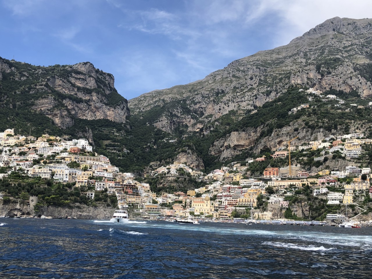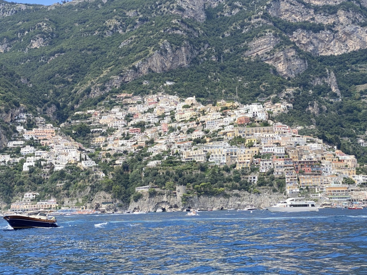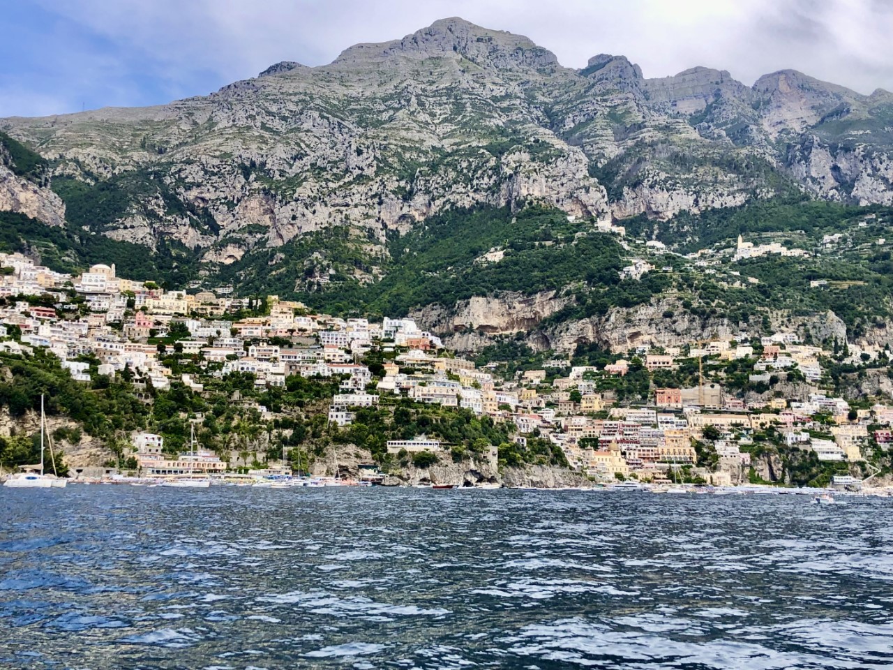 We varen weer op de motor door gebrek aan wind. Aangekomen bij Positano vinden we het er erg druk met passerende speedbootjes, veerboten en toeristenboten. Het water is daar één kolkende massa. Het is niet erg aantrekkelijk om er te ankeren. We besluiten snel om verder te varen naar Salerno, 15 mijl verder. Wel nemen we wat foto’s van het kleurrijke dorpje, alleen jammer dat het licht bewolkt is.