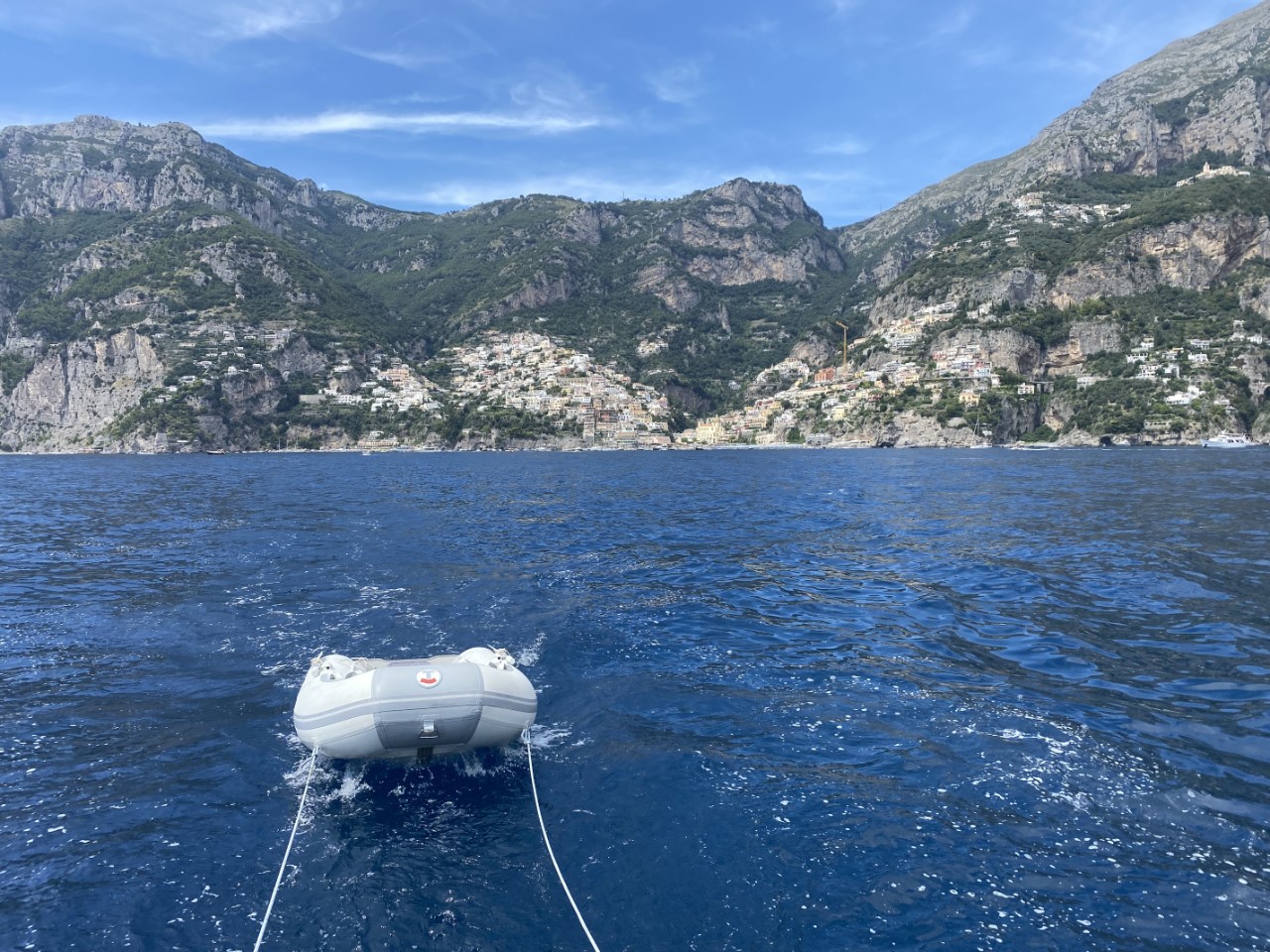 We zitten vroeg aan het ontbijt, want Daniel moet een vliegtuig halen. Marianne neemt aan boord afscheid van Daniel en ik breng hem naar de kant, dichtbij de Just. Daniel gaat een stukje wandelen naar het station voor de Alibus, die tussen Napels en de luchthaven een shuttledienst heeft. Wij halen het anker op en gaan richting Positano, een mooi kleurrijk, tegen de bergwand gelegen dorp.