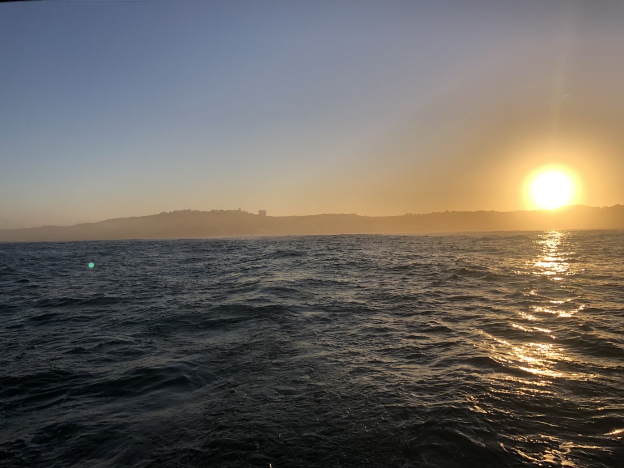Het was nog donker toen we opstonden. Eerst maar even snel ontbijten. Het moment tussen donker, schemerlicht en daglicht gaat hier heel snel, dus met het broodje tussen de kiezen zijn we uitgevaren. Daniel had een koers recht over de hoge golven voor de havenmond en was van plan om de diepe kloof van 300 meter over te varen. Volgens Daniel zaten daar de tonijnen. Ik wilde zo snel mogelijk richting Lissabon.