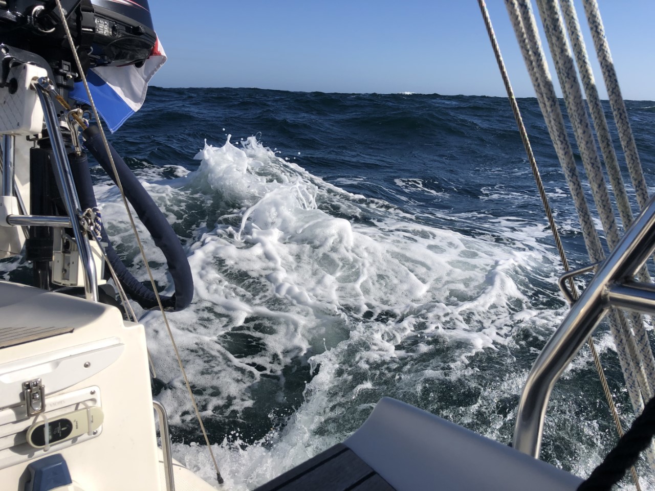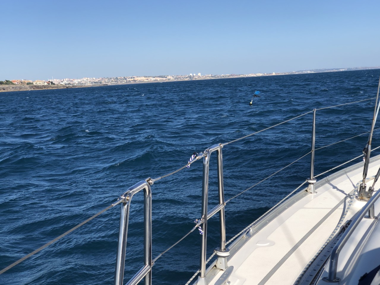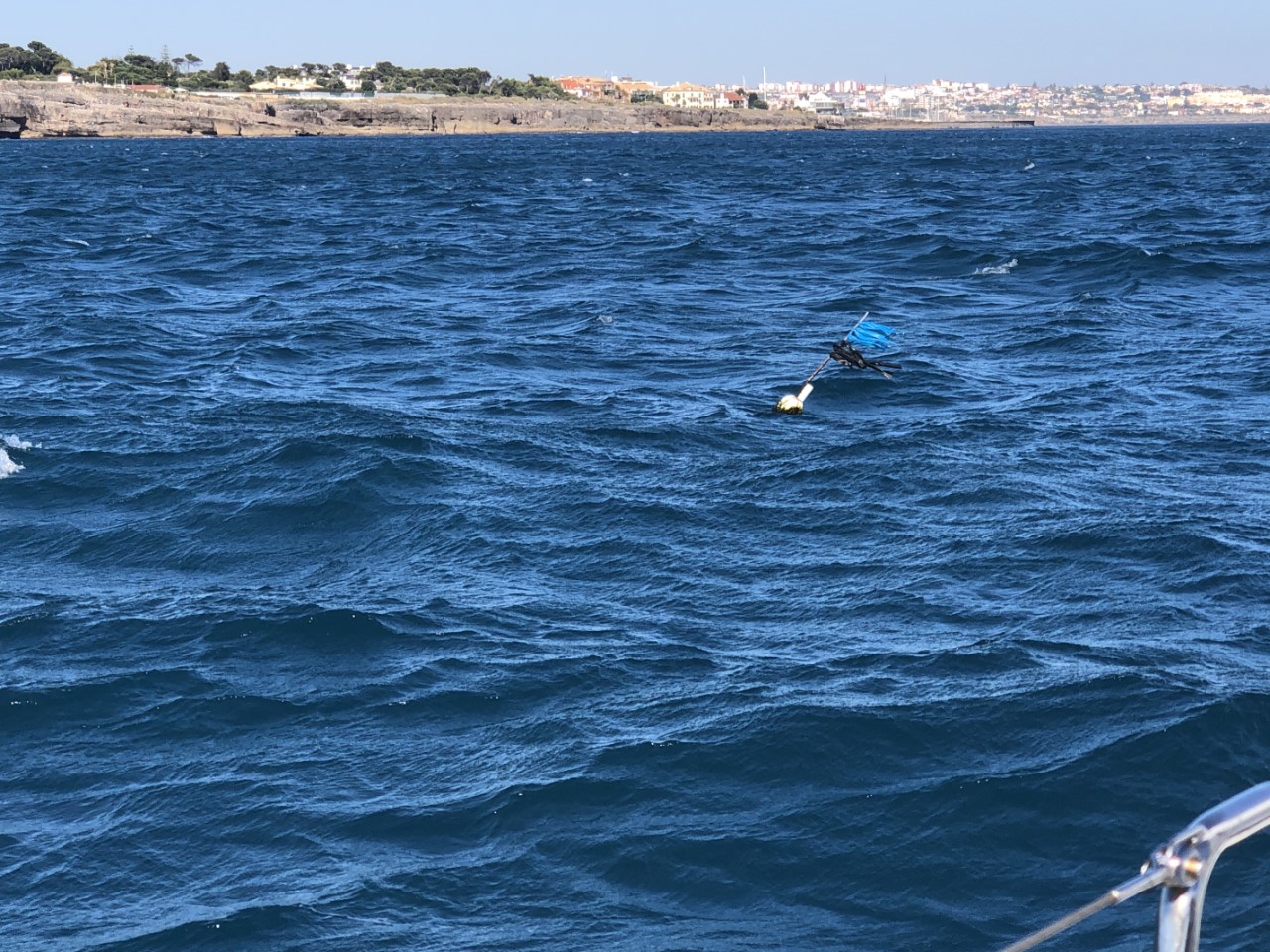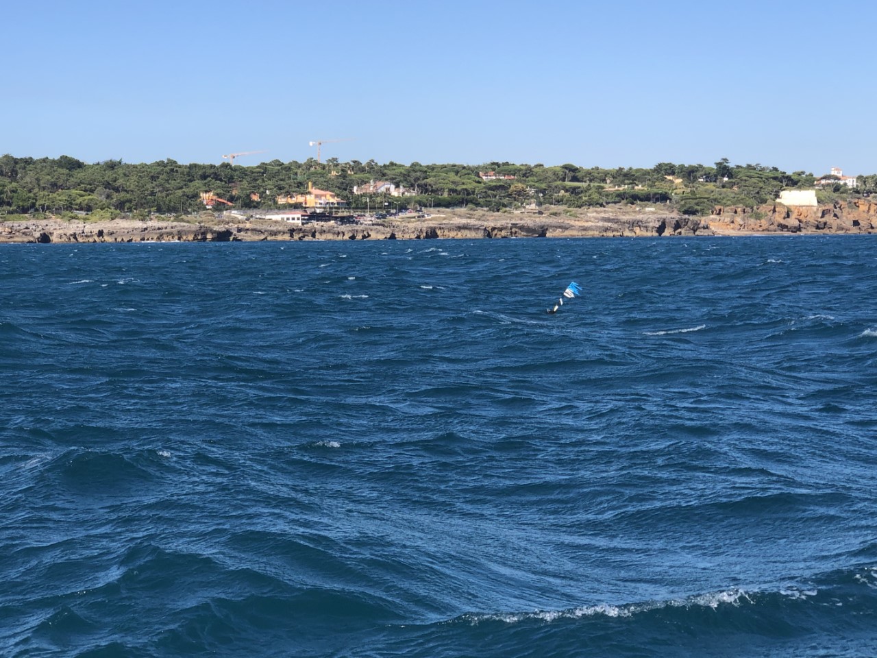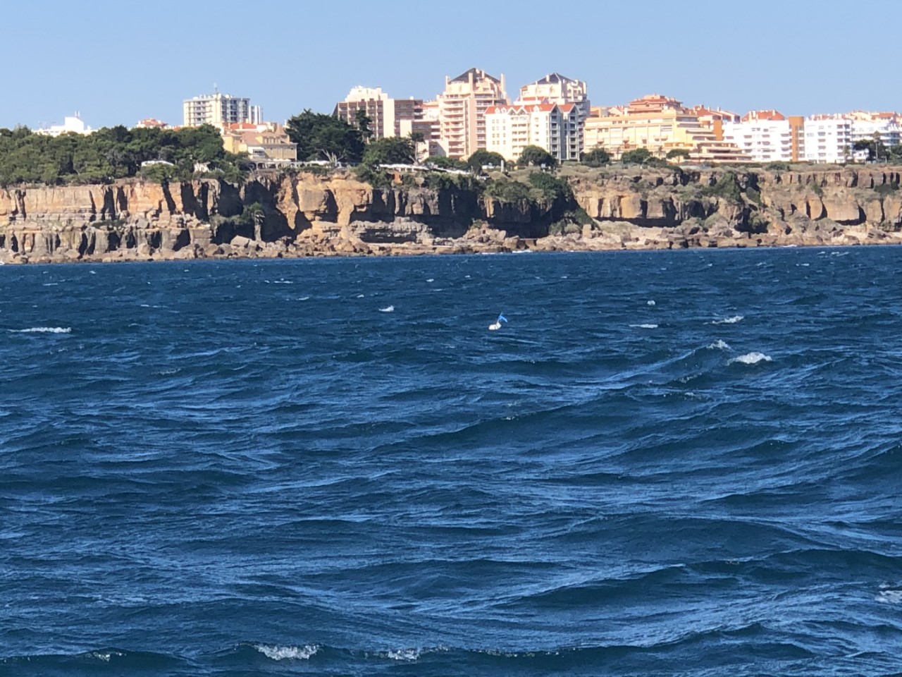 Tijdens de koers naar Cabo Carvoeiro hadden we van stuurboord huizen hoge golven, waar we met bewondering naar keken. Na de Cabo werd de koers stukken beter. We gingen nu surfend richting Lissabon. Maar het was nu heel goed opletten op de kleine fuikvlaggetjes, die hier wel lijken te jongen, ze werden steeds kleiner. Om beurten deden we ons middagnapje om een beetje fris aan te komen in Oeiras. De harde 30+wind en stroming was aardig in ons voordeel en twee uur eerder dan de planning, waren we bijna bij de haven. Volgens de berekening ging de stroming richting de rivier de Taag om 20:00 uur kenteren. Maar nu we zoveel eerder waren, hadden we flink de stroming tegen, met maar 3 knopen voortgang.
