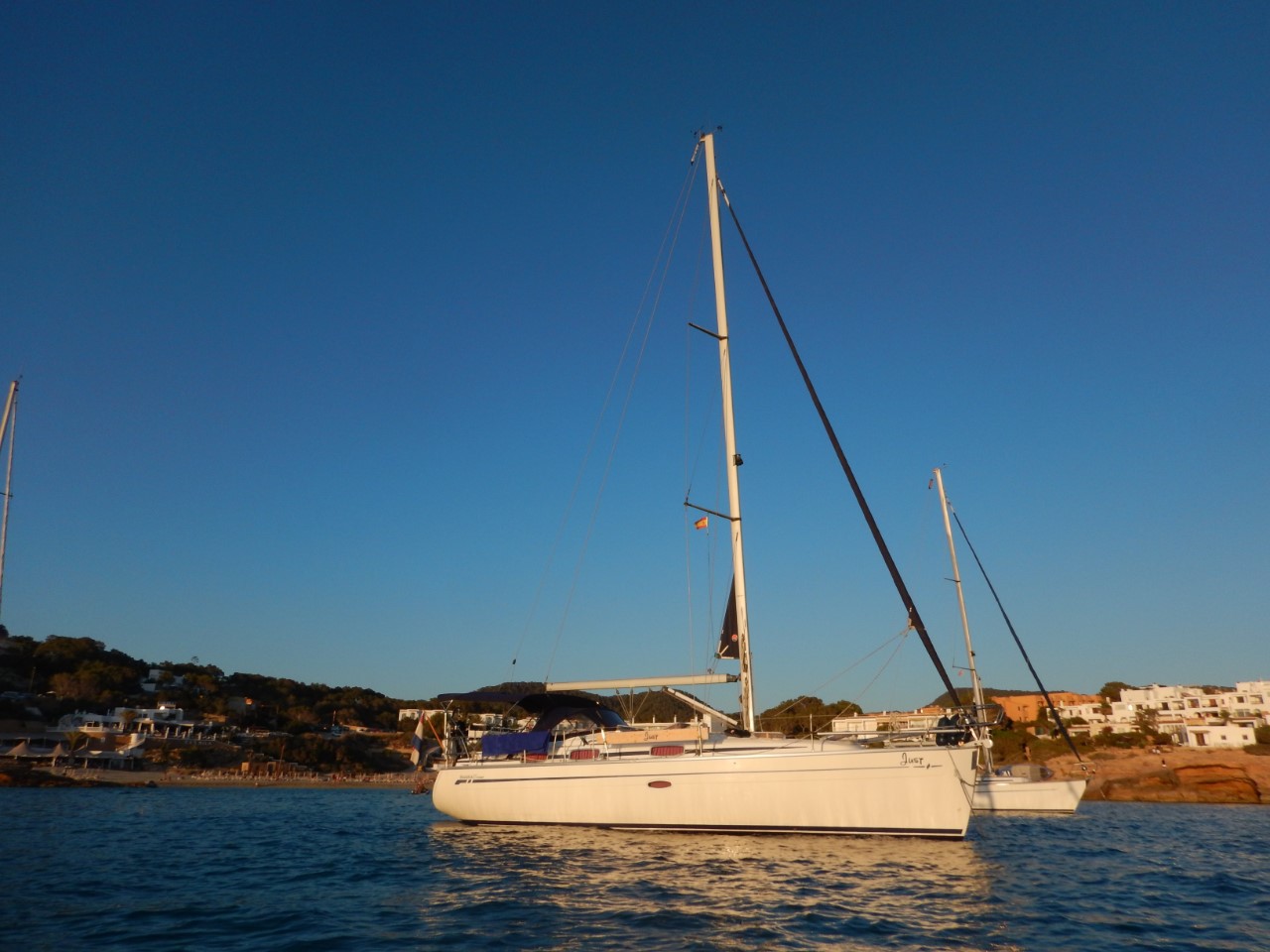 De ochtendduik werd een middagduik en we hebben gesnorkeld. Het was een heerlijke relaxdag. Morgen gaan we met het bijbootje het strand op om het stadje te bezoeken. We zagen het vandaag al verschillende andere boten doen. Toen we een rondje om de Just aan het roeien waren om wat foto’s te maken zagen we dat de vlag er als een vaatdoekje bij hing, touwtje gebroken. Dus vandaag toch nog een reparatieklusje.