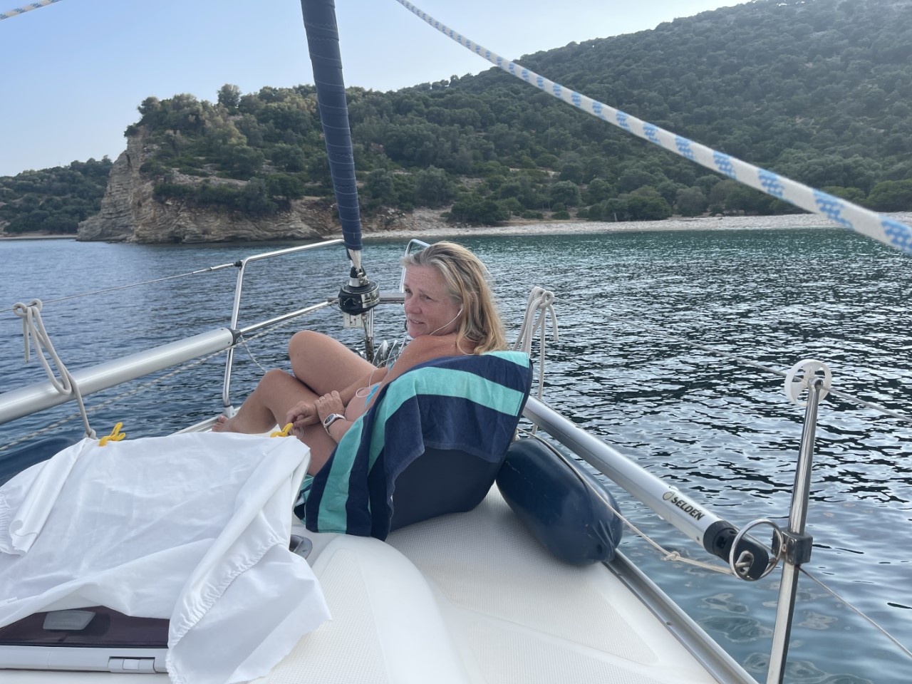 Na alle overlegjes nemen we een duik. De rest van de dag is lui, de hoogtepuntjes zijn toch nog steeds de aankomende zeilboten, die op zoek zijn naar hun ideale ankerplekje. Zo zien we een Griekse zeilboot, die tussen ons en het strandje dicht langs de vloedlijn vaart. Hij blijft dat doen als het strandje overgaat in een rotspartij. Die loopt onder water door en er wordt door de boot een paar maal de bodem op niet zachtzinnige manier gekust. Of een Zweedse zeilboot die 20 meter van de rotsen zijn anker laat zakken en z’n vrouw naar de rotsen laat roeien om daar een lijn aan vast te maken. Vervolgens komt hij erachter, dat z’n anker geen grip heeft op de bodem. De tweede poging is niet veel beter. Heel ver van de rotsen laat hij het anker zakken en komt erachter dat hij niet meer ketting heeft en z’n vrouw, die met het lijntje naar de rots wil, er ook achter komt dat haar lijntje te kort is. De derde poging laat hij het anker waar het is en besluit geen lijntje naar achteren te zetten. Het blijft leuk om al deze leerlessen mee te maken.