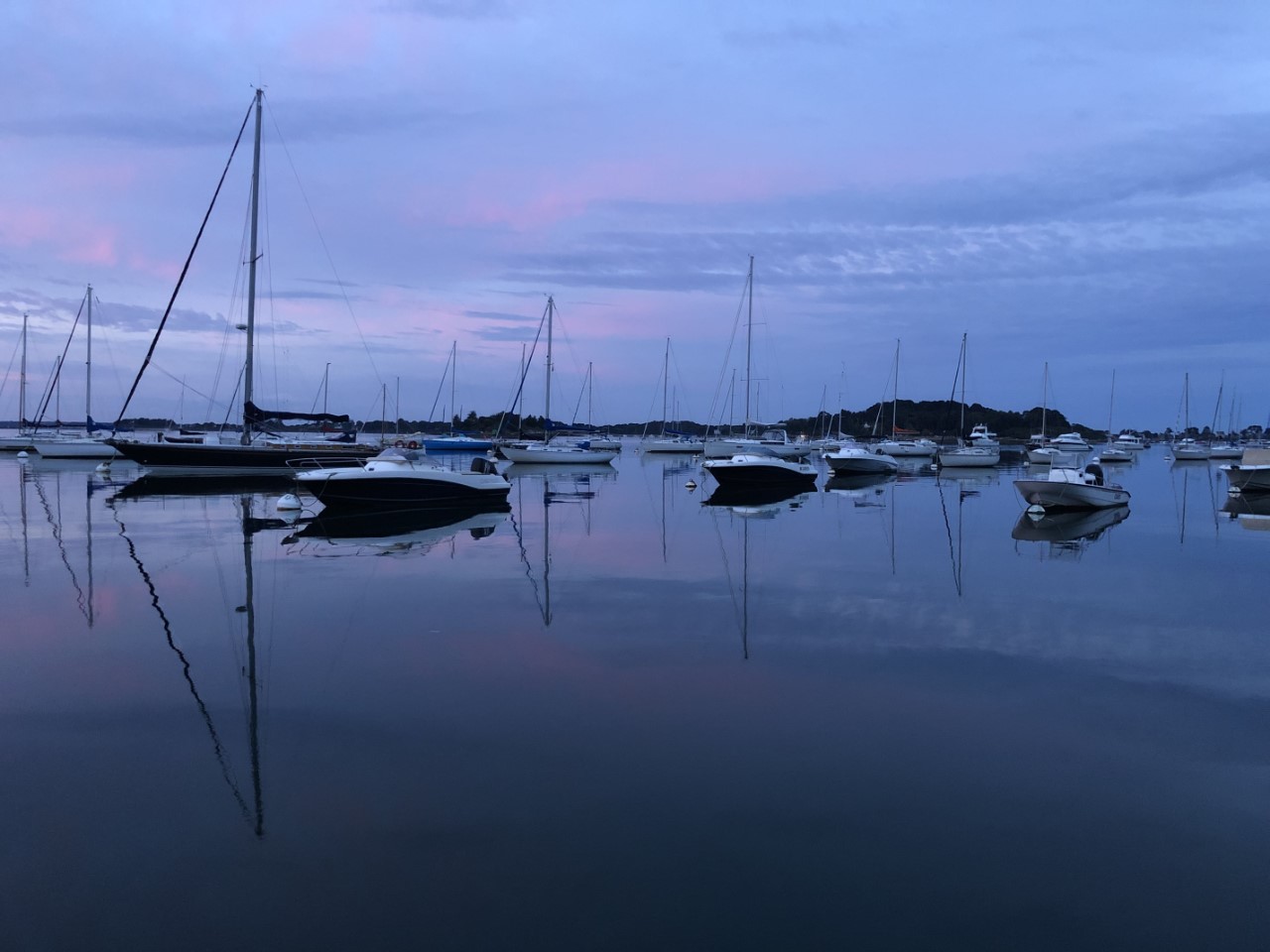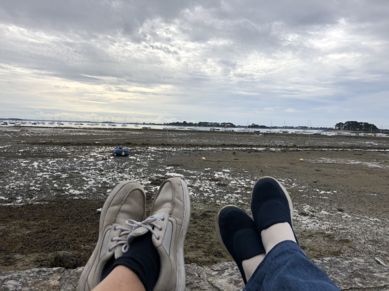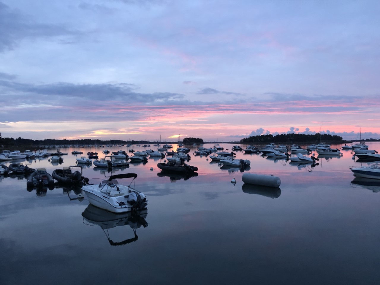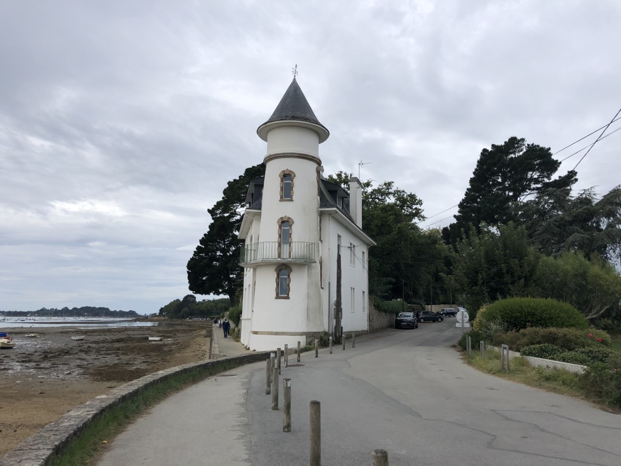 Wat een mooie nacht. De zee was spiegelglad. Een fel schijnende, bijna volle maan en een heldere hemel. Maar vanmorgen was het bewolkt, een verstopt zonnetje en de veerpontjes vaarden weer heen en weer. Wij gingen een strandwandeling maken, het is laag water en dan is er een mooie wandeling langs de kustlijn van het schiereiland waar Arradon op ligt. Bij vloed is het niet begaanbaar. Je loopt langs een hoge, oude stenen muur, waar achter mooie huizen staan. Wij kijken over de Golf waar veel oester- of mosselkweekvelden waren. Op het strand vond Marianne nog een paar mooie schelpen voor haar collectie. We waren begonnen met de wandeling bij het havenkantoor en daar eindigden we ook weer. Daar hebben we fietsen geleend en zijn naar het centrum van Arradon gefietst. Het was een wat saai dorpje met een paar winkeltjes rond de kerk. We waren er snel klaar mee en gingen terug naar de Just. Daar begon het getwijfel, gaan we vandaag naar Vannes of niet. Het was inmiddels zachtjes aan het regenen en de wind zou nog aantrekken. We konden pas tegen 15:00 uur vertrekken in verband met de waterstand. Marianne opperde om nog een dagje hier te blijven en morgenmiddag te gaan, want dan komen we droog over. Goed plan, ik ging onderuit met een filmpje en Marianne keek naar de proviand, die we hoognodig moeten opmaken voordat we naar huis gaan. We namen gelijk maar een noodlesoepje, dat scheelt al iets. We hebben een goed besluit genomen, want als we naar Vannes waren gevaren, hadden we als verzopen katjes aangekomen. Nu zitten we lekker droog in de Just te luisteren naar een gierende wind, klotsende golfjes en zachtjes tikkende regen op het kajuitdak. Wij komen de nacht wel weer door.