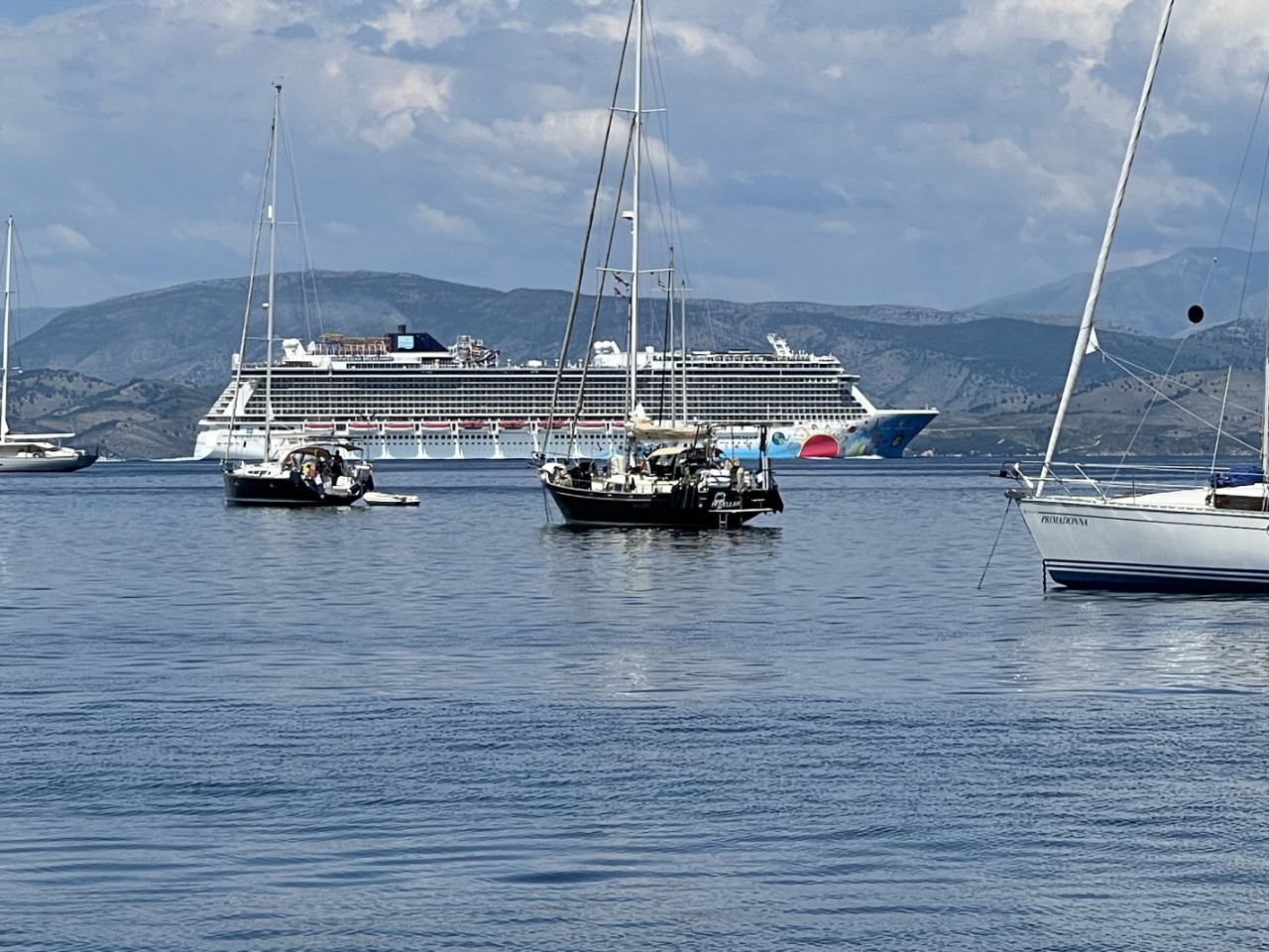 We zagen gisteravond, dat de Norwegian Breakaway, het cruiseschip waar Bettina en Fred een weekje op rondvaren over de Middellandse zee, ook Corfu-stad gaat aandoen. Het was nog wel iets te vroeg om het schip langs ons ankerplekje te zien varen. Rond 10:00 uur gaan we aan wal en kuieren we door de gezellige winkelstraatjes van de oude stad richting de terminal, waar het cruiseschip is aangemeerd. We hebben telefonisch contact. We lopen net op een vrij ongezellig stukje kade, als we Bettina en Fred van de andere richting zien aankomen. We duiken de gezellige straatjes weer in en niet veel later pakken we een terrasje voor een bakkie koffie. We wisselen onze beider cruiseverhalen uit, wij primitief op ons zeilbootje en zij iedere dag vijf-sterren topservice, wat een verschil. Verder wisselen we de gezinsverhalen en kleinkinderverhalen uit.