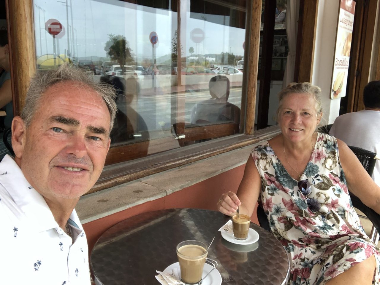 Ik heb de Just weer schoongespoten. Toen hij z’n kleur weer terug had, zijn we richting de overdekte groente-, fruit- en vismarkt gelopen. Wat is dat een troosteloos covid-gebeuren. Er was één viskraam en een kraampje met diverse soorten thee. Verder alle rolluiken dicht en verlichting uit. We hebben het heel snel bekeken en zoeken een koffietent op. We komen bij een tent, die werd bezocht door heel veel Spanjaarden, waar ze een prima bakkie serveerden. Zoals gewoonlijk neem ik een café con leche con tres azucar en Marianne een cortado. We hebben nog wat boodschappen gehaald bij de Mercadona.