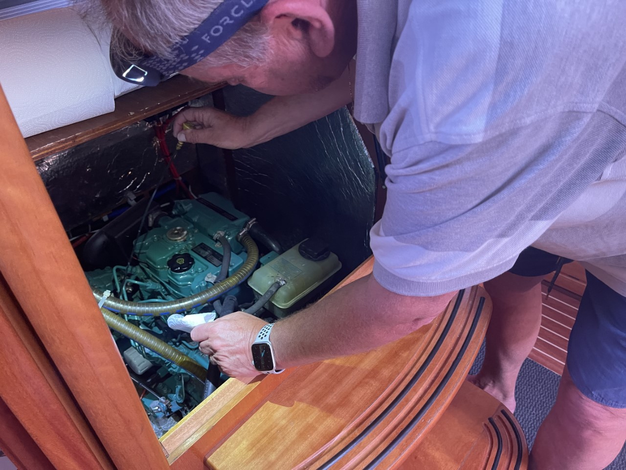 Eindelijk worden we wakker met een stralend blauwe lucht. Ik ben er vroeg uit, want het wordt een klusdag. Als eerste verhelp ik de kleine lekkage van het bijbootje. Langs het ventiel van de bodem ontsnapt een beetje lucht. Met een speciale sleutel en wat Butyl dichtband heb ik hopelijk het lekje kunnen dichten.