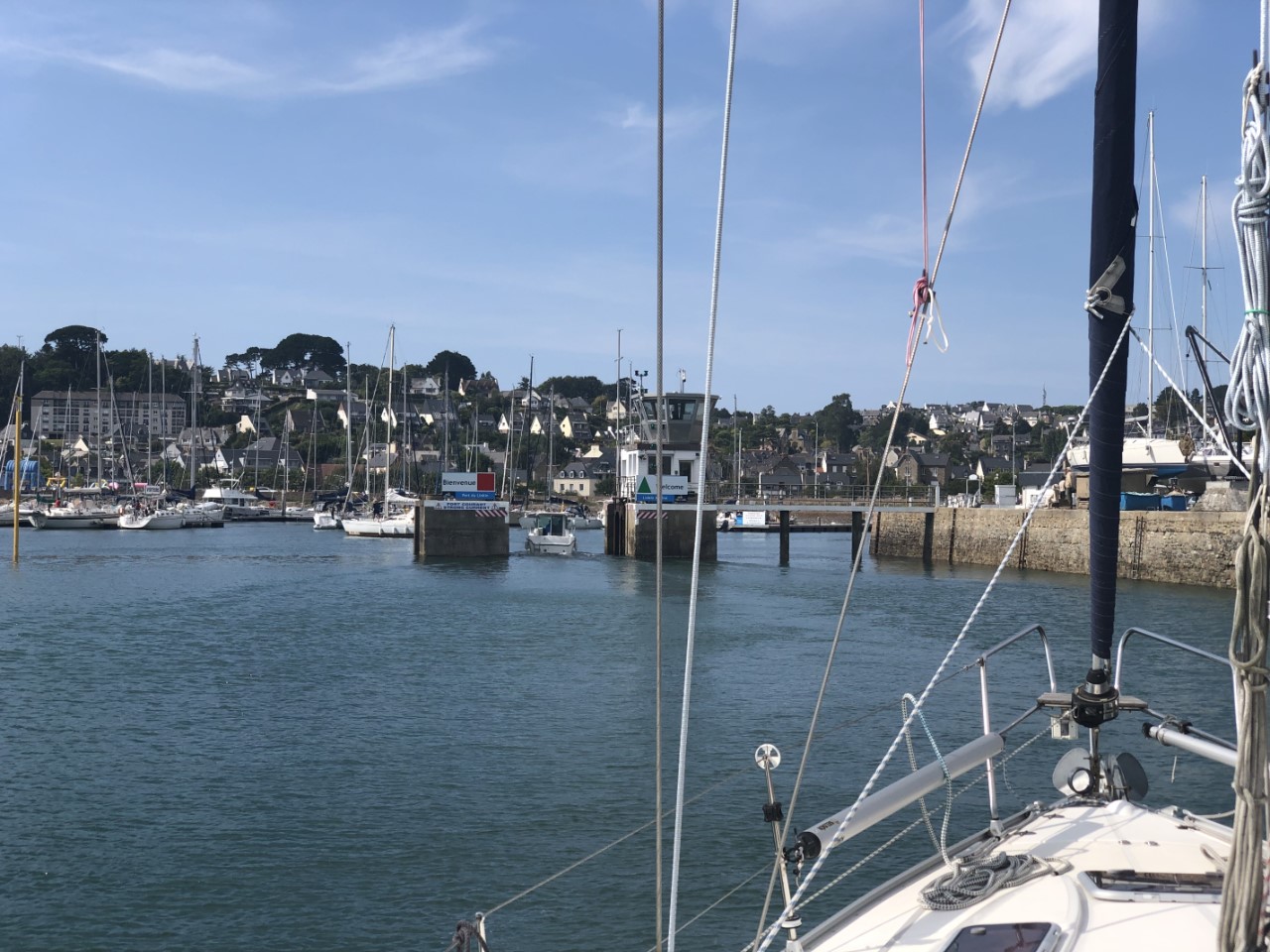 We varen even voor laag water het sluisje van Paimpol uit. Het was spannend, want hebben we alles goed berekend? En halen we het naar diepwater? Het valt zeker 3 mijl uit de kust droog. Toch wel een half uurtje varen. We laten de motor extra toeren draaien om zo snel mogelijk over dit droogstaand gebied te varen. Pffff, gelukt. We zetten de koers uit en ronden, behalve een heleboel rotsen, ook Ile de Bréhat, waar we gisteren hebben rond gekuierd. Ook varen we de langs La Rivière Du Trieux, die naar de haven van Lezardrieux gaat. Dit is onze verste haven ooit in onze vakanties bereikt. Dit record gaan we vandaag breken en dat gebeurd vanaf vandaag dagelijks. We hebben de eerste paar uur met het fokje gevaren, maar de wind liet het weer afweten. We werden alleen met 2.5 knopen stroom naar onze bestemming gestuwd. We wisten al dat het een dobbertochtje zal worden, maar zo langzaam was ook niet de bedoeling. Marianne heeft gebeld met de haven voor de openingstijden van de drempel. We kregen 17:30 uur door en dat er wachtmoorings waren voor de haveningang. Na een paar rosten draaien we de baai in. Er waren 2 vrije moorings. Marianne stuurde er netjes op af, zodat ik met ons Hook & Moor aan de mooring kon vastleggen. Dan is het 2 uurtjes te wachten op hoger water om de haven in te kunnen. Heerlijk relax zitten kijken naar anderen die aankwamen varen en ook de mooring probeerden op te pakken. Altijd leuk om naar anderen te kijken. We hadden al gelezen dat het lock hier heel erg smal is en dat er sterke stroming staat, dus wij besloten achter andere bootjes aan te varen om de situatie aan te kijken. Oeps, dat is zeker heel smal, maar we vaarden netjes binnen. Er stond een Française naar ons te zwaaien, die ons een box aanwees en ook werden de lijntjes aangepakt, wat een luxe. Ik mocht gelijk wat boodschappen halen. De supermarkten aan de kade waren niet veel, dus ik een steile berg op naar de Carrefour. Na weer een lekkere pastamaaltijd gingen we een stukje langs de haven lopen en wat informatie halen, wat er hier te doen is. Genoeg te ontdekken, Obelix heeft hier ergens een steen laten staan en dat is een hele attractie, het moet niet gekker worden. Het internet in deze haven is perfect, dus heb ik in de avond de Grand Prix race van afgelopen zondag nog even bekeken.