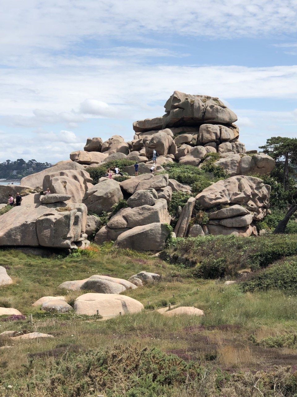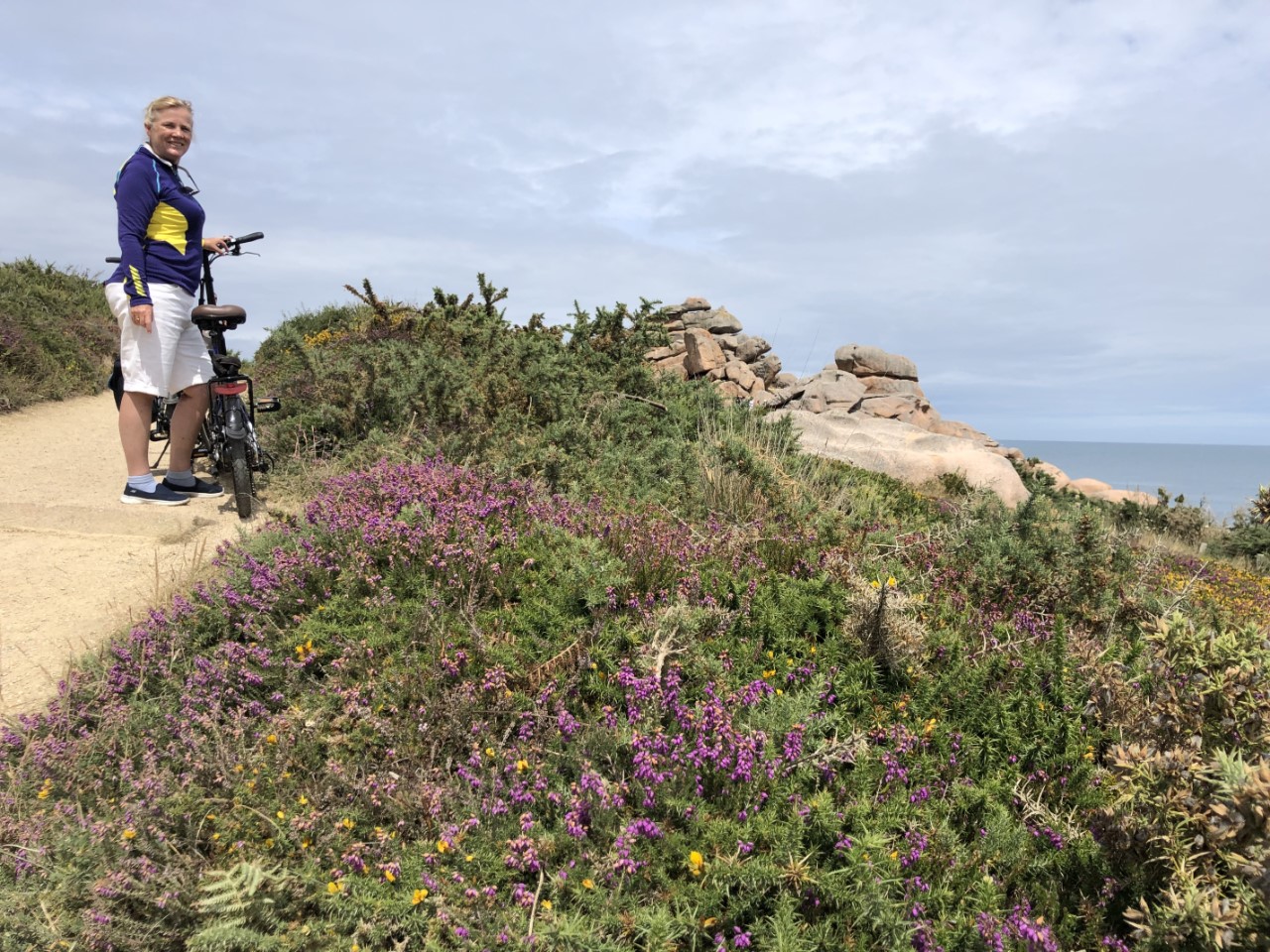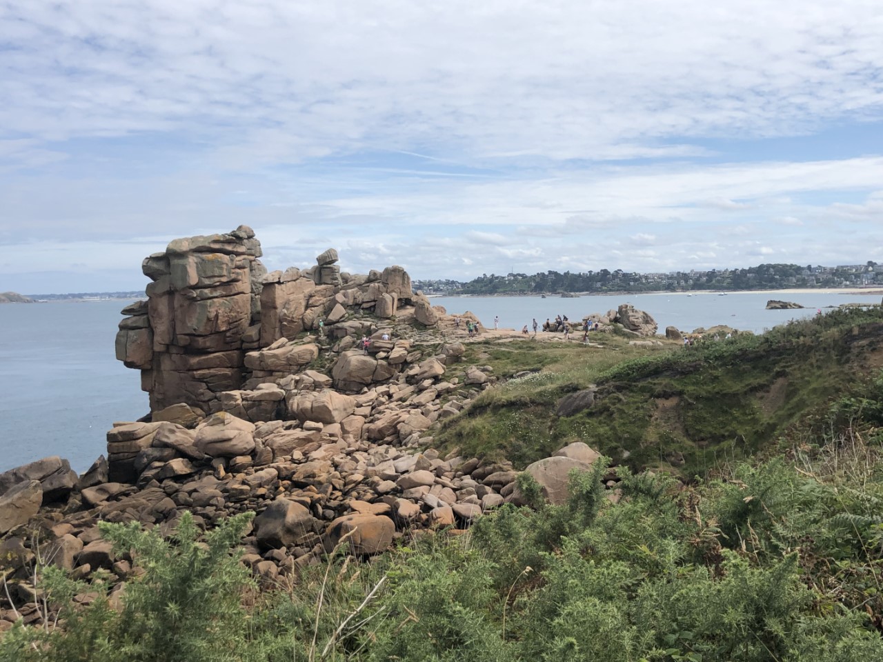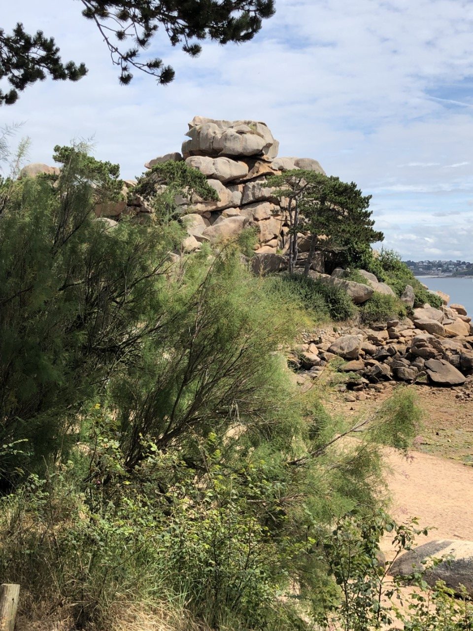 We hebben er een luie ochtend van gemaakt, alleen een pastasalade gemaakt voor vanavond. En een beetje kijken waar we vandaag heen gaan fietsen. We zijn er uit, die steen van Obelix komt nog wel. We gaan naar de indrukwekkende rotspartijen: Rochers de Ploumanac’h. We hadden een fietsroute van het toeristenbureau, alleen de schaal was niet op straatniveau. Google Maps stuurde ons over snelwegen en de bordjes, die een route moesten aangeven stonden overal en nergens. Maar na wat zoeken en puzzelen kwamen we bij een hele mooi baai en strandje met er om heen luxe huizen. Wij de fietsroute bordjes weer volgen en even later waren we weer vlak bij ons startpunt: de haven. Wij weer geprobeerd de fietsroute bordjes op te pakken en met behulp van de kaart en Google Maps kwamen in Ploumanac’h, waar we via een zooi gesteenhouwde beelden per toeval op het douanepad kwamen wat we zochten. Via het pad kwamen we langs de een na de andere kunstzinnig opgestapelde roze rotsen. Wij vroegen ons af met wat voor natuurgeweld zo iets moois heeft kunnen ontstaan. De rotspartijen in Dartmoor waren heel mooi, maar hier hebben we geen woorden voor. Op de terug weg hebben we even Ploumanac’h bezocht, waar ook een mooi strandje was. Na een ijsje hebben we bijna de zelfde weg terug genomen naar de haven. In de avond hebben we nog een wandelingetje gemaakt bergop naar een kerkje, waar allemaal wandtekening zouden staan van King Arthur, maar helaas we waren een uurtje te laat. Dan maar terug naar de Just en de route voor morgen in de plotter zetten. Het wekkertje gaat om 6:00 uur.