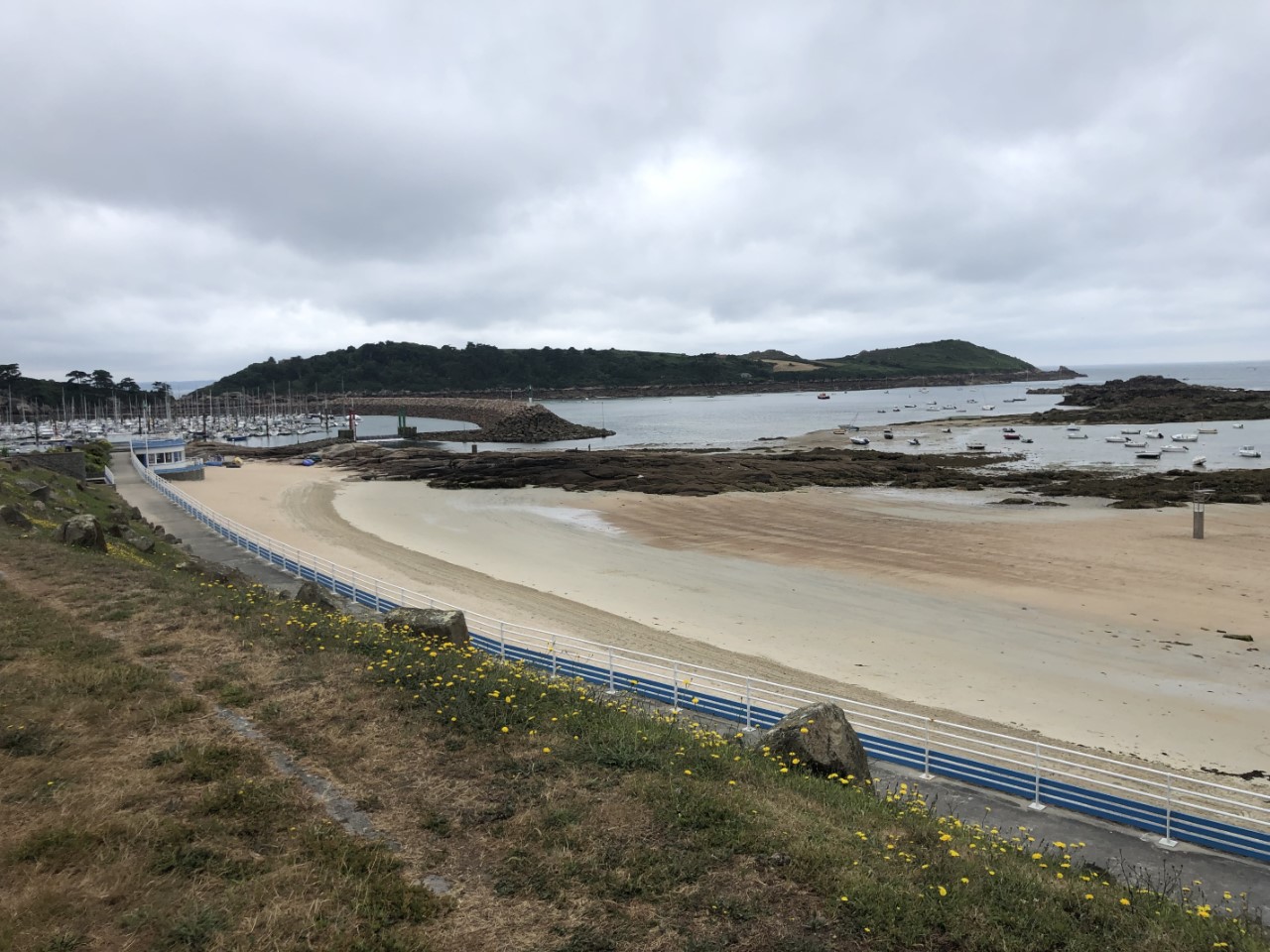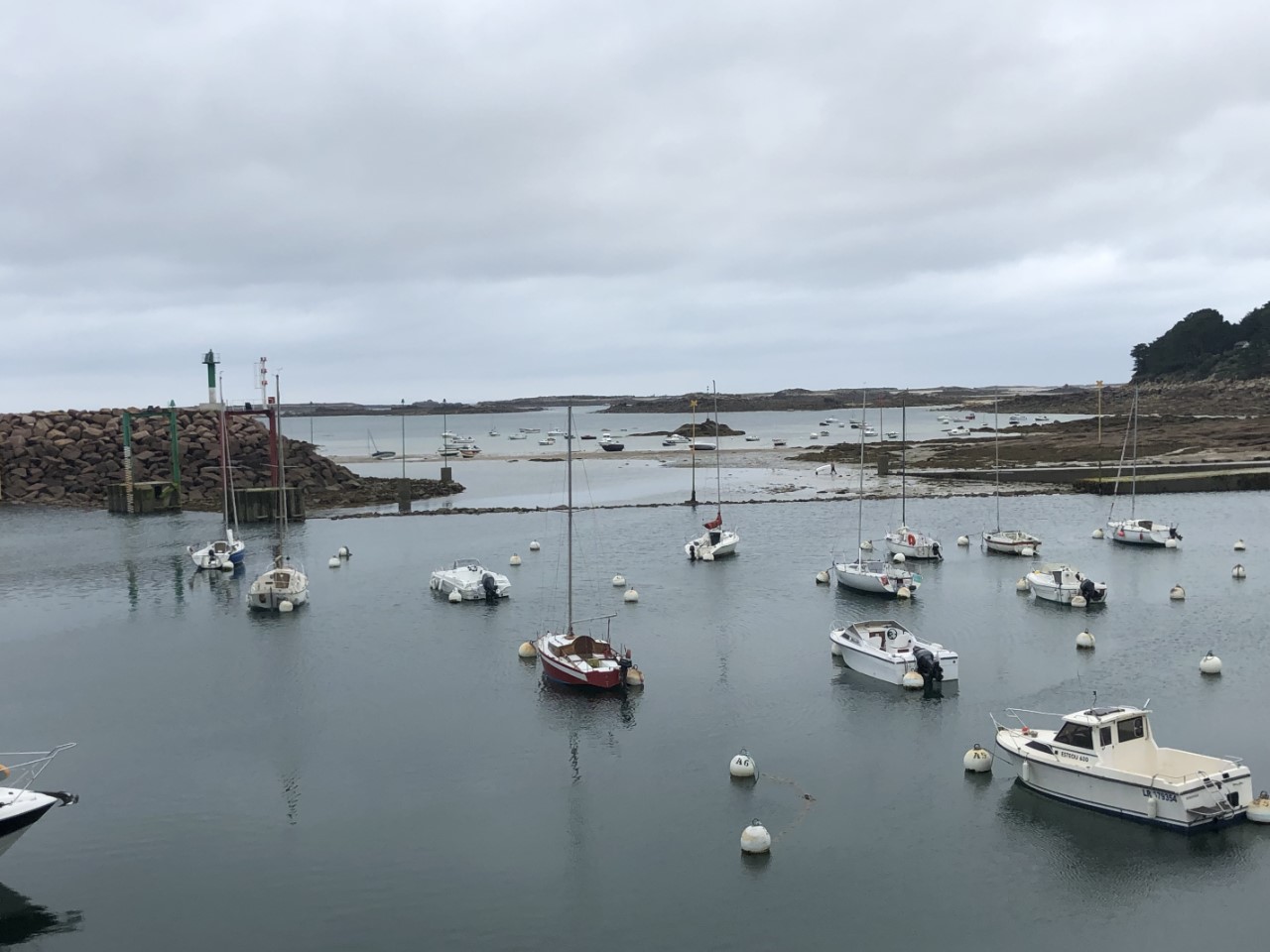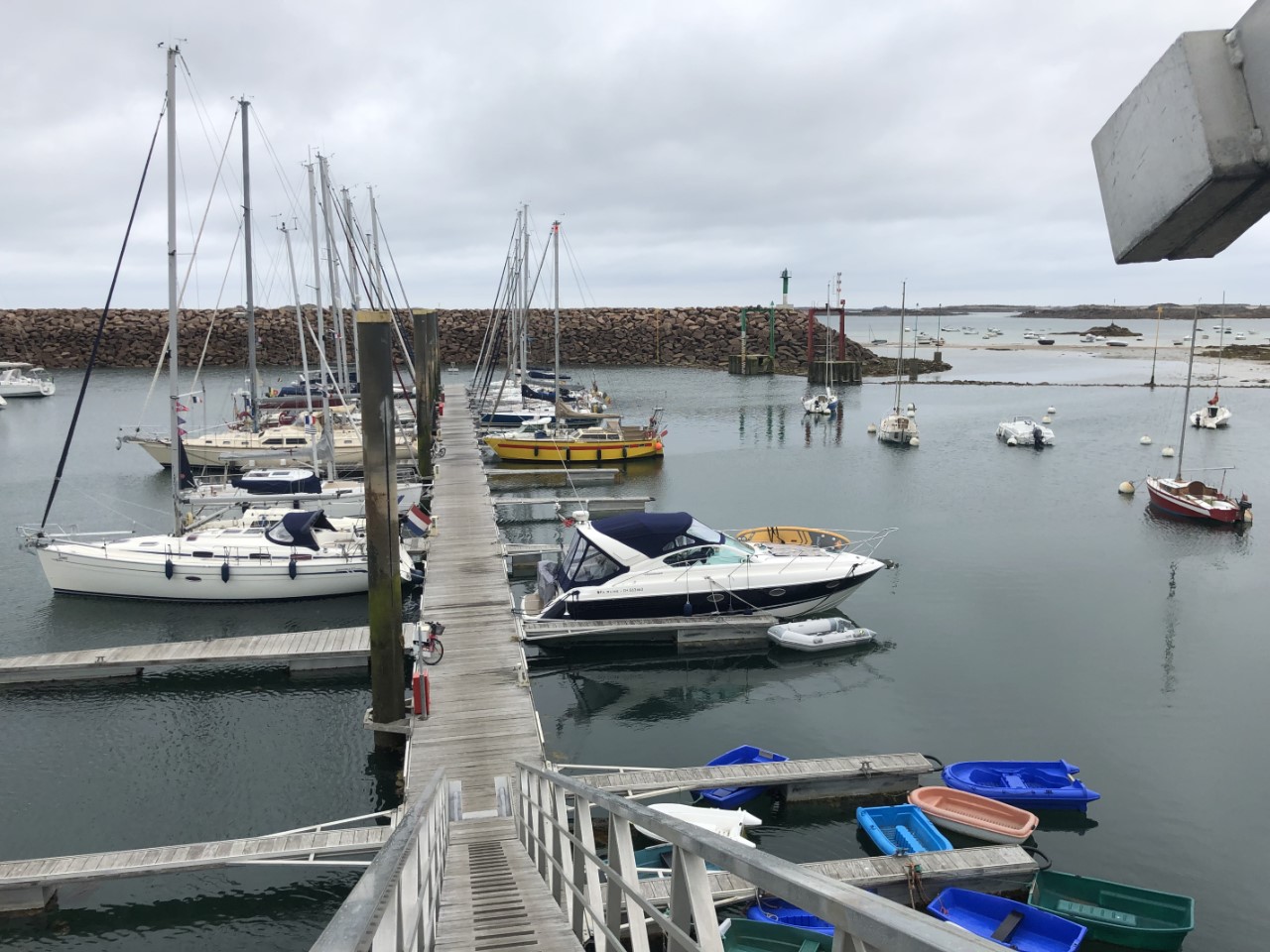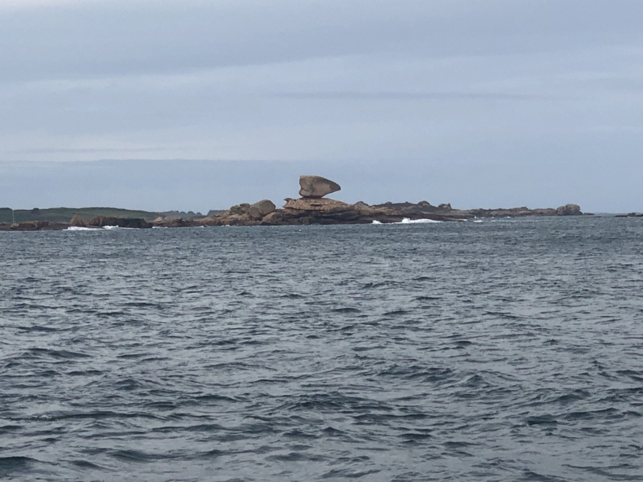 Vroeg op. Om 7:00 uur gingen de sluisdeuren open en wij waren de enige zeilboot die uitvaarden. We hebben ruim 4 uur om in Trébeurden te komen, want ook daar hebben ze een lock. We wisten al, dat we bijna 3 knopen stroom tegen hebben. Met weinig wind gedurende het eerste uurtje hebben we alleen op de motor gevaren. Plotseling kwam er wind en de zeilen ging op. Ondanks de stroom tegen gingen we bijna 7 knopen hoog aan de wind. Maar we moesten meer naar bakboord koersen en hoger konden we niet varen. Met de rotsen links en rechts was laveren ook geen optie, ook in verband met de tijd. We hebben de zeilen ingerold en op de motor werd het tegen de wind en de stroom inhakken. Ruim op tijd draaiden we de haven in en werden opgevangen bij een box. Na de lunch hebben we bij ons aan boord ook maar een siësta uurtje ingevoerd, want voor 14:00 uur is er toch niks te beleven. Bovendien is het ook geen strandweer. We gaan op pad, via alweer een steile weg omhoog. Na een saaie weg met mooie en vervallen huizen was er eindelijk een bakkertje en een heel stuk verder een grote supermarkt. Maar eerst even naar het kerkje, omdat daar meestal rondom winkeltjes zijn, maar niet hier. Een kapper en een makelaar. Dan maar naar de supermarkt voor onze bootvoorraad. Met een volle zware tas met wijntjes voor Marianne gingen we nu gelukkig bergaf naar de Just. In Yachting Monthly staat over dit plaatsje: Trébeurden has a rather nostalgic atmosphere of holidays by the sea. The small town of Trébeurden has everything you might need in the way of shops. Wij vinden het voorlopig wel heel erg nostalgisch en de shops zijn niet te vinden. Maar misschien morgen met een zonnetje ziet het er heel anders uit. Ook is er een avondmarkt in een parkje bij de haven, dus na ons maaltje hebben daar even rondgelopen. Langs de 6 marktkraampjes, dus we waren snel weer terug, ook omdat het een beetje begon te regenen. We zijn benieuwd als we hier gewend zijn, hoe we het morgen ervaren.