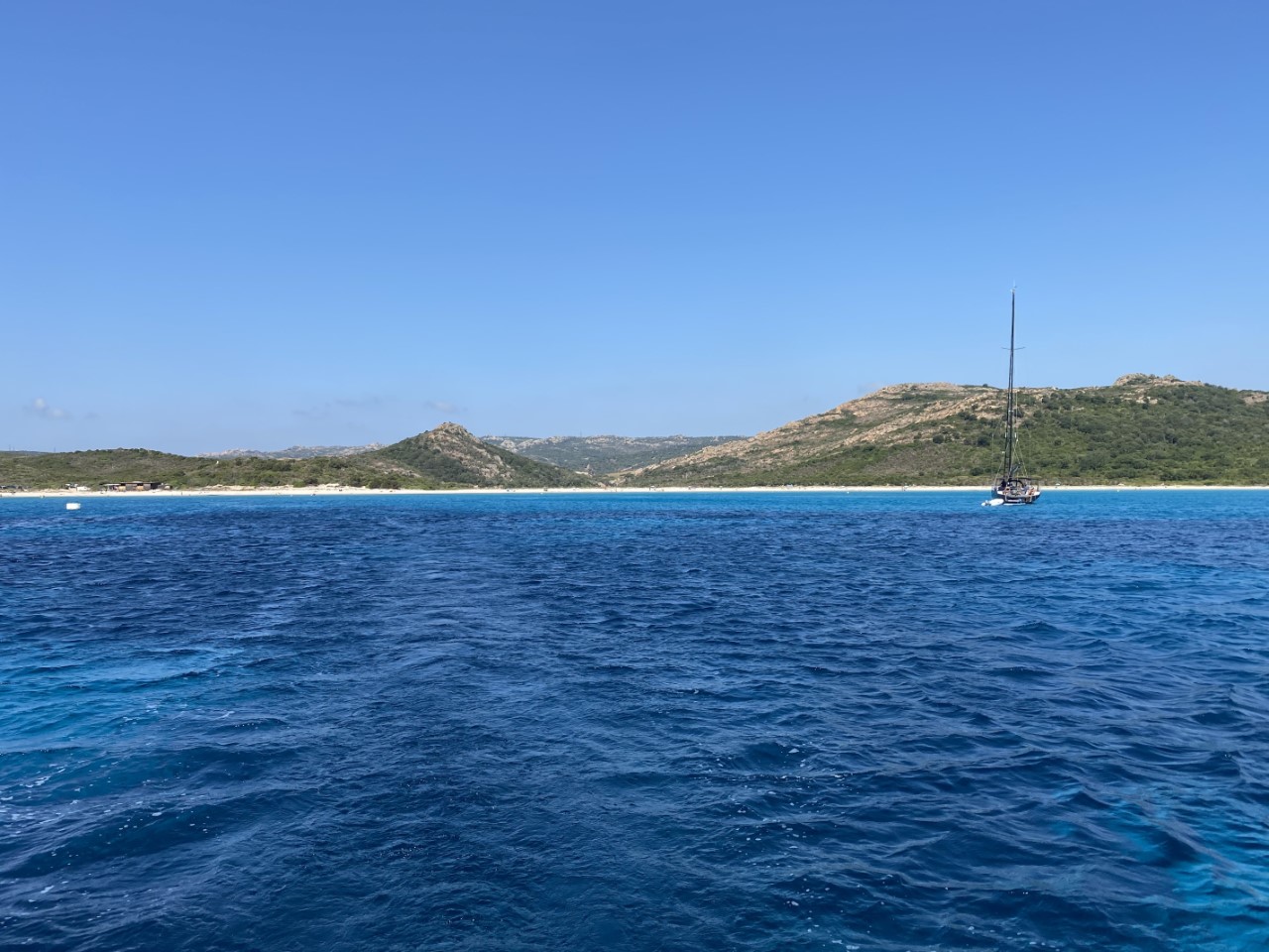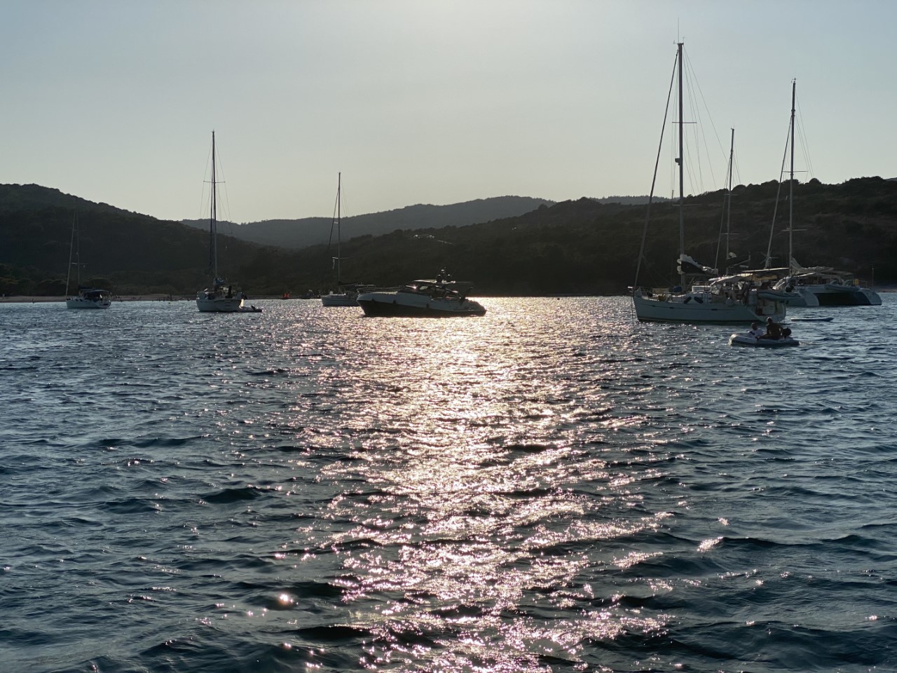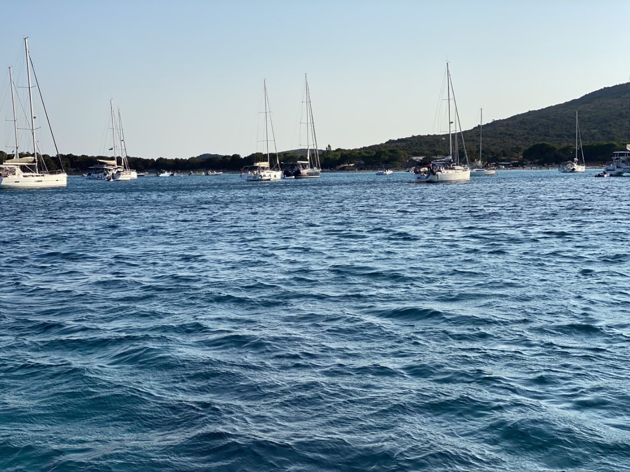 Met het fokje uitgerold zeilen we voor de wind met een rustig gangetje naar de Golfo de Rondinara, weer een toppertje volgens Navily. En dat vinden meer bootjesmensen. De gehele baai ligt vol. Het is een hoefijzervormige baai met veel beschutting en een mooi, maar wel vrij druk strand met een strandtent. Wij kiezen voor een ruime plek en gooien achter de massa ons anker in een zandbedje. Zo we liggen weer, maar het is nog geen ideaal plekje. Marianne probeert wat slaap in te halen en ik houd een oogje in het zeil of er een mooi plekje vrij komt. Voor ons jammer, elke keer als er een bootje vertrekt, komen er twee boten de baai binnenvaren. Na een uurtje komt er toch een plekje vrij en verplaatsen we de Just.