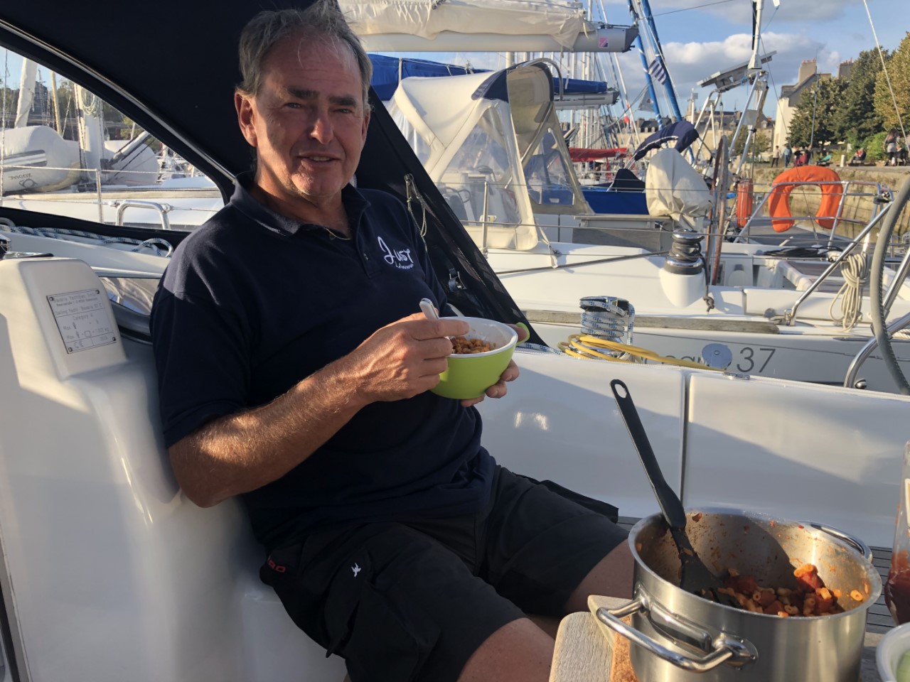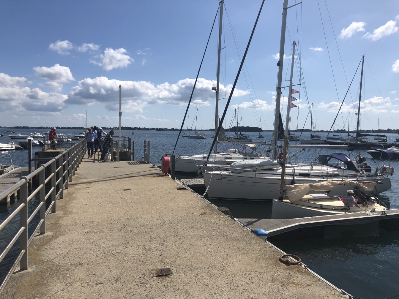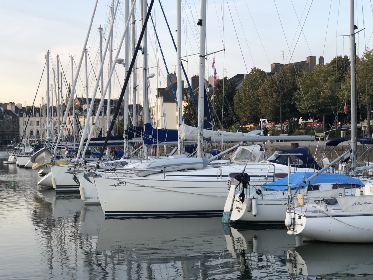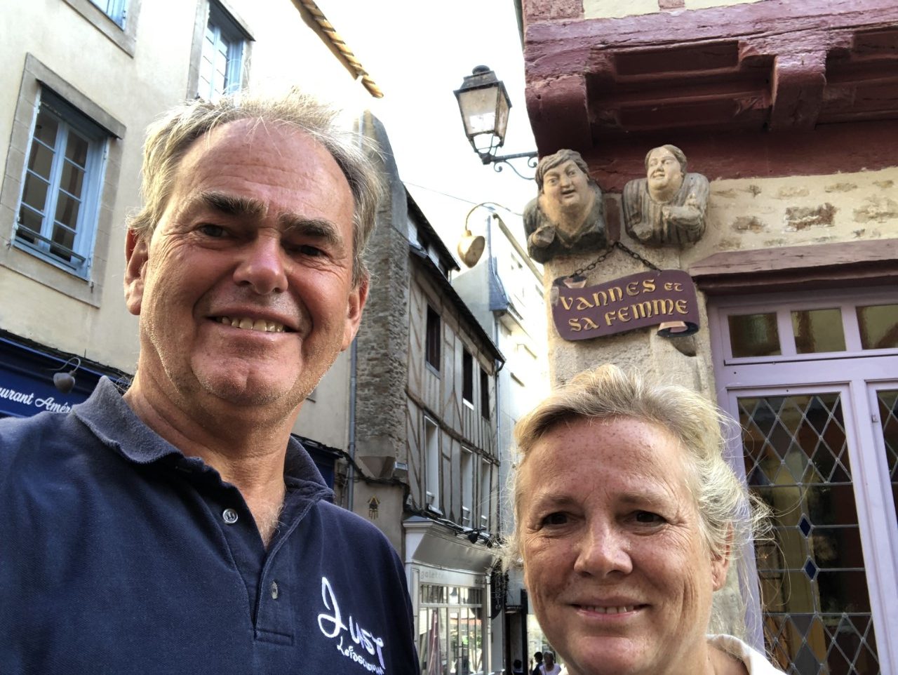 Het weer laat weer z’n zonnige kant zien, volop zon en weinig wind. We kijken uit op de plas en genieten van het mooie uitzicht. De pier waaraan de ligplaatsen zijn, is volgens ons het toeristisch hoogtepunt van dit plaatsje, want iedereen komt hier even een kijkje nemen en ook worden foto’s genomen. De Just komt zo in heel wat vakantiefotoboeken. Wij wachten op hoogwater. Marianne is aan het schilderen en ik kijk in de kuip een filmpje. Ik ging ook nog even met de drone vliegen, maar een National Park opzichter van Morbihan vertelde, dat in de gehele Golf niet met drones gevlogen mag worden. Hij vond het best, maar waarschuwde me voor de politie. Ik had m’n foto’s al gemaakt en ruimde de drone op. Eindelijk 15:15 uur, we kunnen vertrekken. De brug in Vannes staat vanaf 15:30 uur open en het is voor ons ongeveer 45 minuten varen. We hadden flink de stroom mee, dus de motor draaide op een heel laag toerental. We waren niet de enigen die richting Vannes vaarden. Een kleine optocht van boten ging ons voor. Maar er kwamen ons ook boten tegemoet en opvallend veel Engelsen. Bij de brug lag de havenmeester met z’n rubberboot en kregen we te horen, aan de steiger kunt u aanleggen. Op onze vraag, “is er ook box beschikbaar”, zei hij, dat onze boot te groot was? Dan maar langszij. Het was tot onze verrassing erg druk in de haven en meerdere boten lagen dubbel. Wij vonden een mooi plekkie tegen een Duitse boot. Eenmaal aangelegen raakten we aan de praat en hoorden dat ze ongeveer hetzelfde plan hadden als wij. Alleen varen zij door naar La Coruña. Toen wij onze plannen aan het uitwisselen waren, kwam de havenmeester langs met de mededeling u mag naar een box. We hebben nog even kaartjes uitgewisseld en afscheid genomen. We liggen nu in een perfecte box en hebben nog even de benen gestrekt om even door het centrum van Vannes te wandelen en langs het toeristenburo voor wat info. Morgen worden we nog actiever, maar hoe en wat gaan we vanavond uitzoeken.