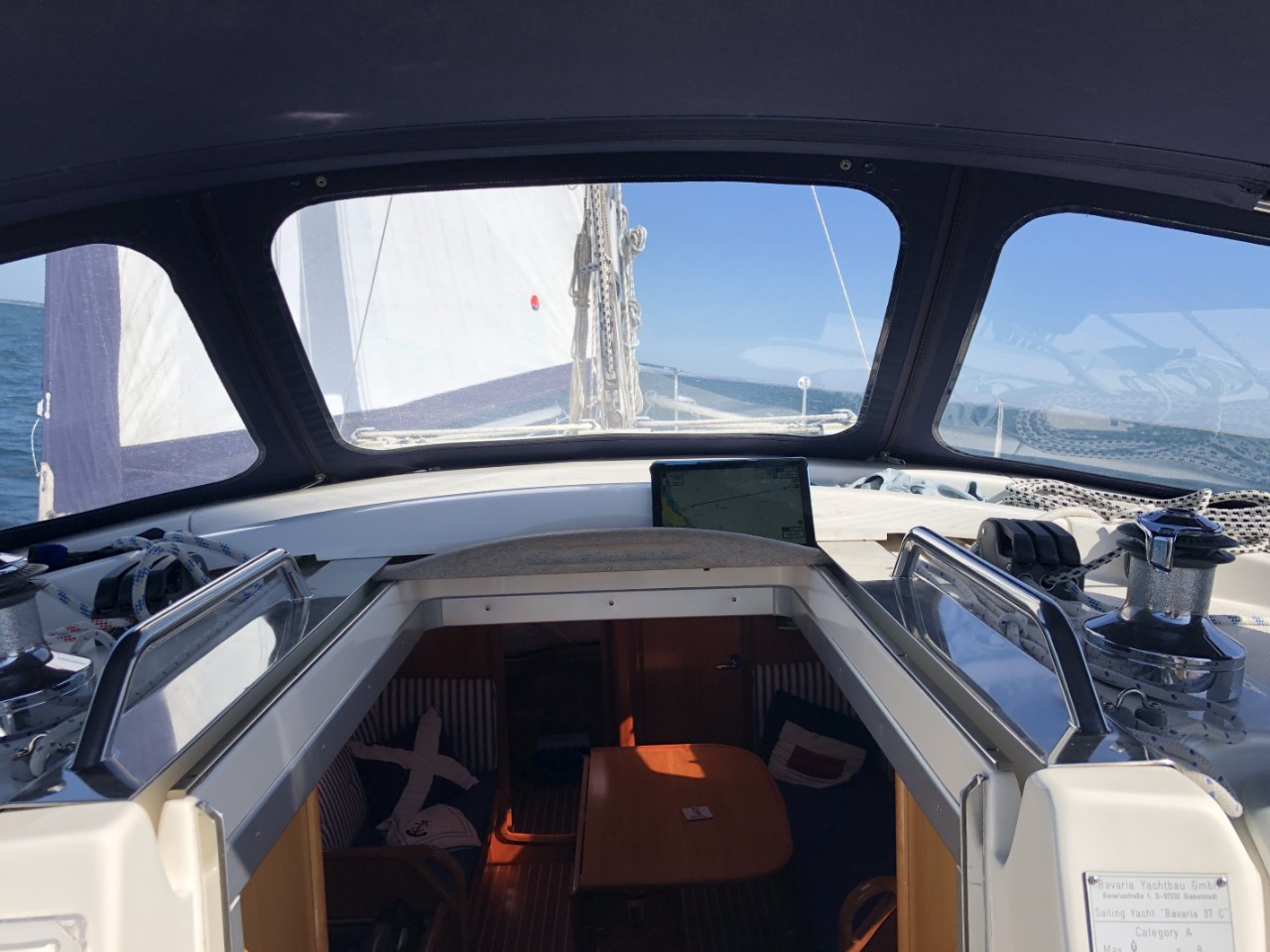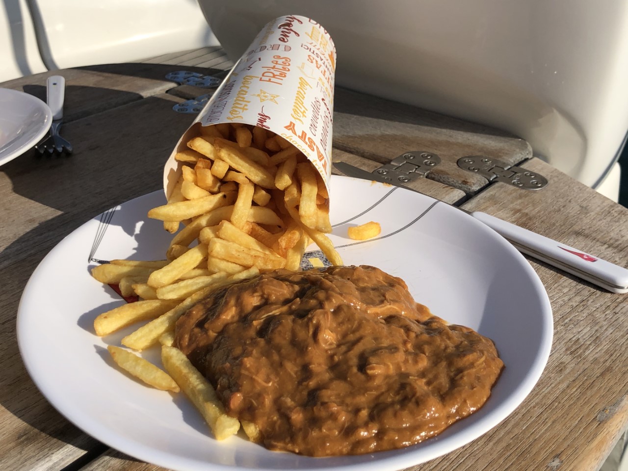 Na een hele ochtend wikken en wegen en veel weersberichten te hebben bekeken, bleef het hard waaien. Een paar zeilboten vaarden wel uit, maar ze hadden allemaal veel moeite om van de steiger los te komen. Wij keken het aan met een boekje en wat internetten. Maar rond 13:00 uur gierde de wind iets minder hard door de mast. En volgens de voorspellingen zou het rond 14:00 uur nog minder gaan waaien. Na een kort praatje met onze Franse buurman, natuurlijk over het weer, gooide hij zijn lijntjes los voor een voordewinds koersje richting Lorient. Wij gingen een half uurtje later om laverend tegen de wind naar Le Crouesty te gaan. We waren niet de enigen in de haven die losgooiden. Het was een optocht van uitgaande zeilboten. Op de oceaan viel het mee. De Just kon goed met deze golven overweg. We waren met deze wind snel aan de overkant. De vorige keer was het al lastig wegens de drukte om in Le Crouesty een ligplaats te krijgen, maar toen we binnen vaarden was het nog drukker. En ja hoor, er was dit weekend een Regatta met ruim 100 zeilboten. En de havenmeester schudde met z’n hoofd, geen plaats. Maar vond na wat zoeken toch nog een plaatsje, langszij bij een Belgische zeilboot. Een aardig plekkie, goed beschut, achter in de haven. Het is vrijdag, dus patatdag. We gingen samen op weg naar het havenkantoor voor de nodige administratie. Nadien ging Marianne alvast terug voor wat groente en satesaus op te warmen en ik ging langs de snackbar. Ik kwam gelijk aan met de Belgische buren en we hadden een kort praatje over lekkere ijsjes in Blankenberge en hun plannen. Maar wij gingen snel wat eten, anders hebben we koude patatjes. Vanavond gaan we ze verder uithoren.