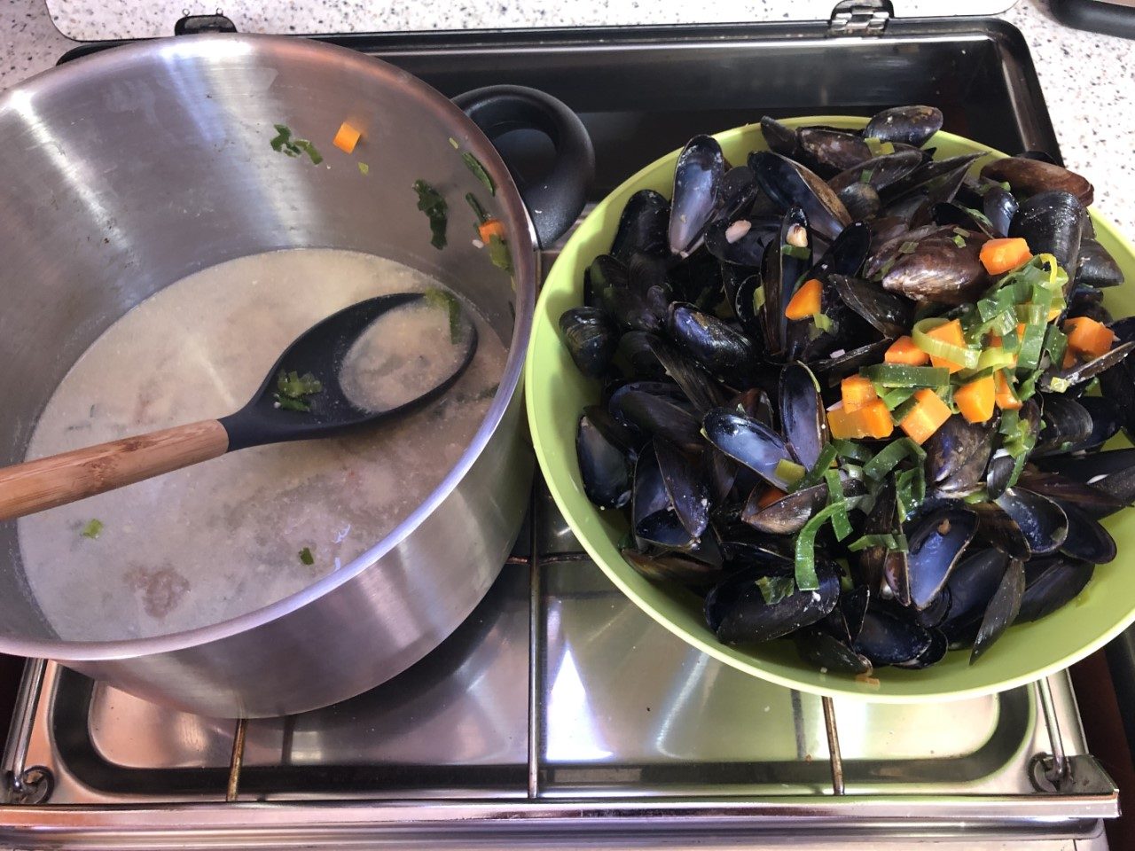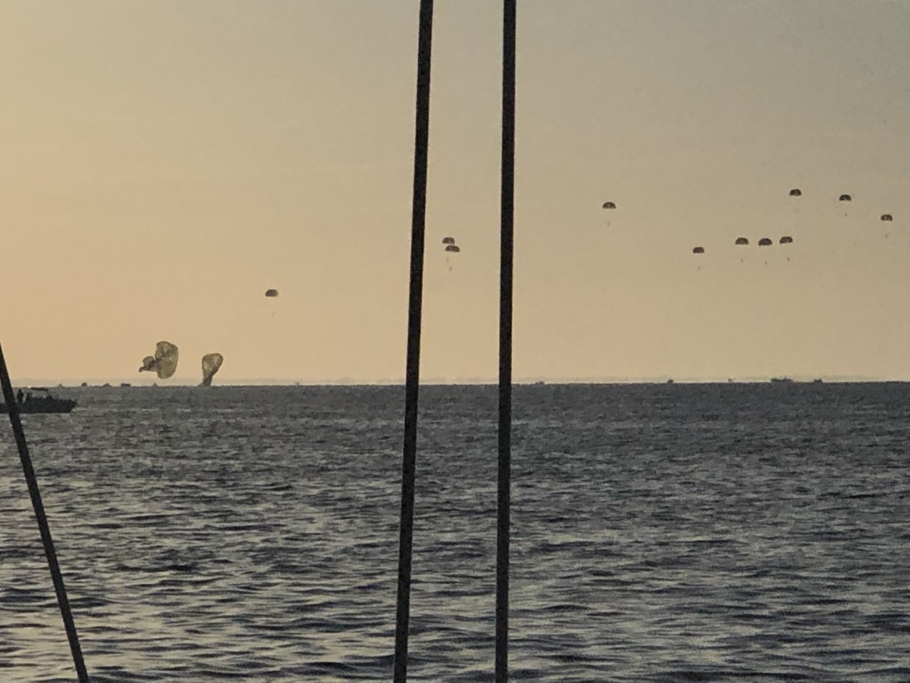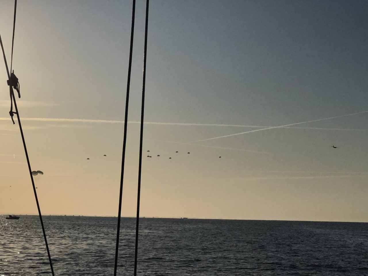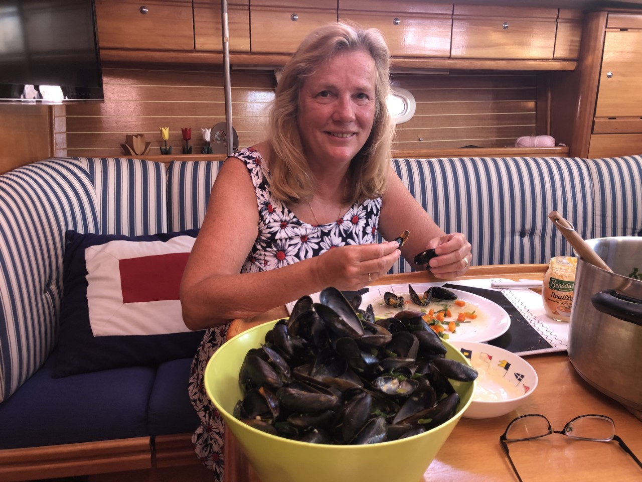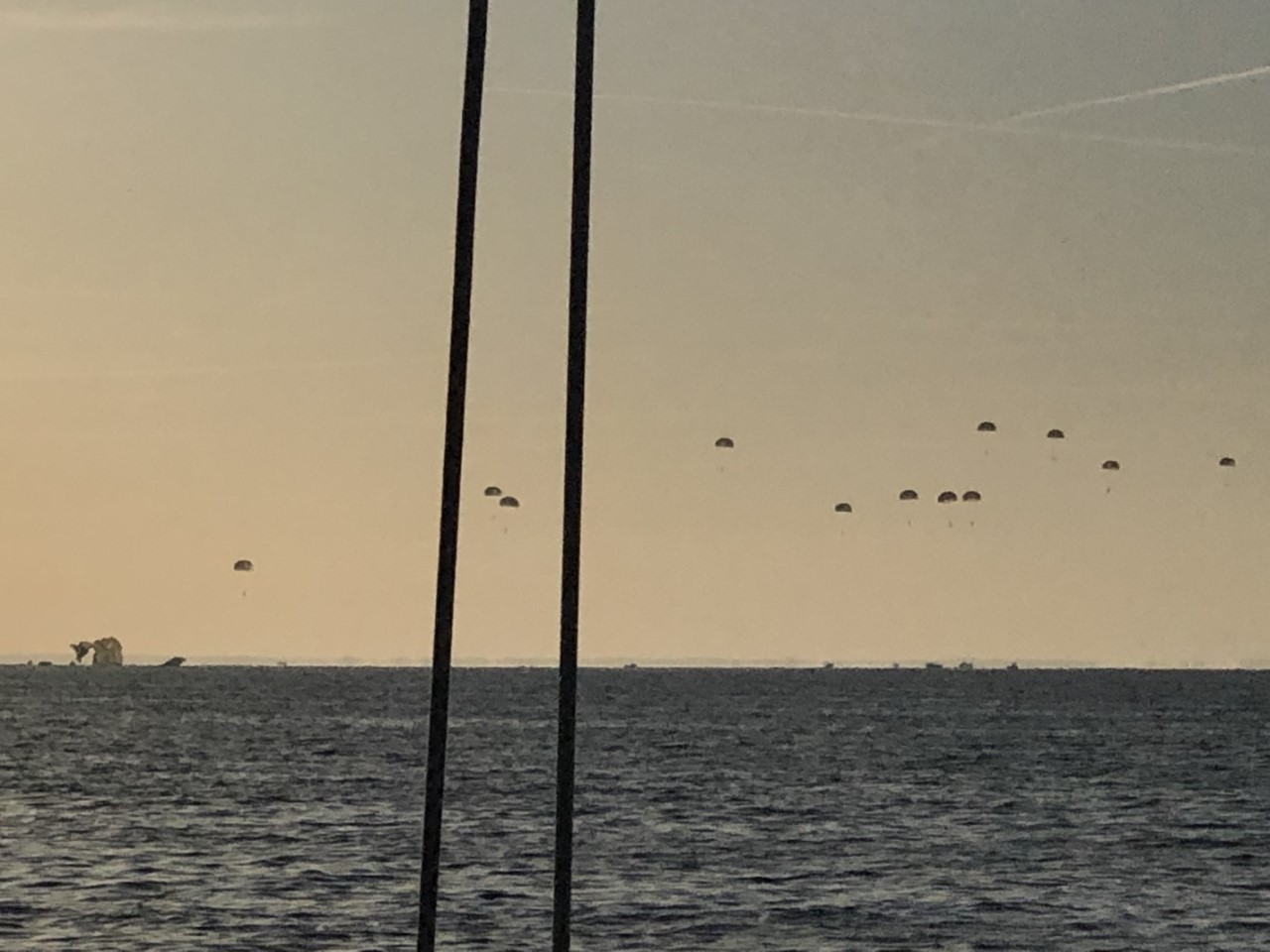 We gaan vandaag een baaitje verder en nemen afscheid van dit baaitje. We kregen nog een flybye van het Franse leger en vervolgens werden er tientallen parachutisten gedropt een paar honderd meter voor de Just. Gelukkig werden we niet geënterd en konden rustig verder varen de zon tegemoet. We zeilden weer met de motor erbij om enigszins wat voortstuwing te hebben. We kwamen nu al voor de derde keer tijdens de siesta aan bij Port Haliguen, maar er kwam toch een rubberbootje ons tegemoet en die gaf ons een ruime box. We maakten ons klaar om langs het havenkantoor te gaan, maar ook dat was niet nodig. De havenmeester kwam langs met z’n bootje en noteerde het nummer van ons Passeport Escales, dat is ook geregeld. In de middag hebben we fietsjes geleend en zijn wat boodschappen gaan halen. De mosselen waren in de aanbieding, dus die gingen voor vanavond op het menu. En ze smaakten heerlijk. We hebben gekeken naar onze volgende havens en ook alle havens in de Golf van Morbihan, waar we al eerder met Mark en Marion zijn geweest. Als je een beetje kritisch kijkt, blijft alleen Vannes over waar je in een box ligt en direct aan wal kan. De andere havens zijn aan een ponton of mooring. We gaan daar morgen nog even een studie van maken.