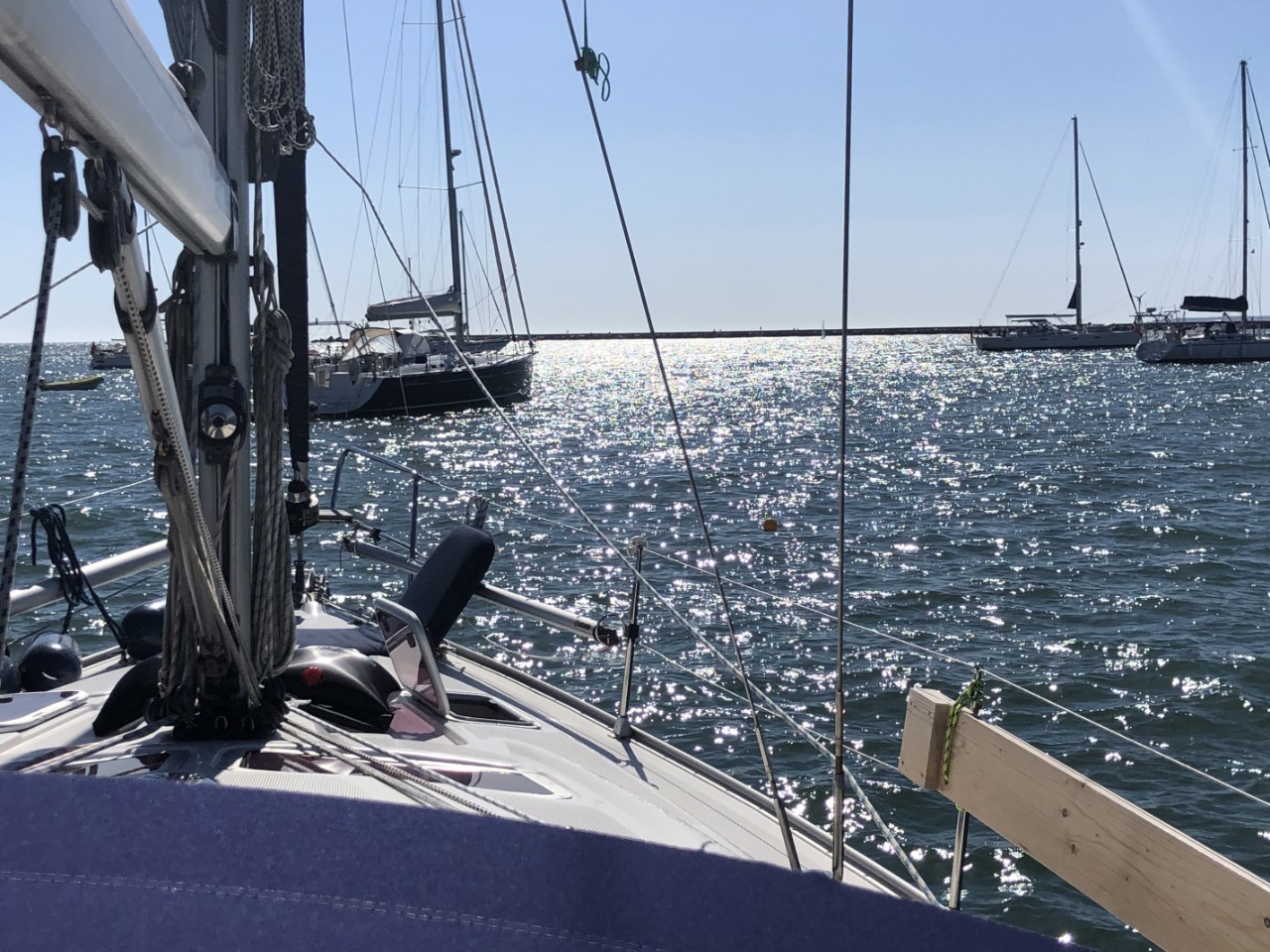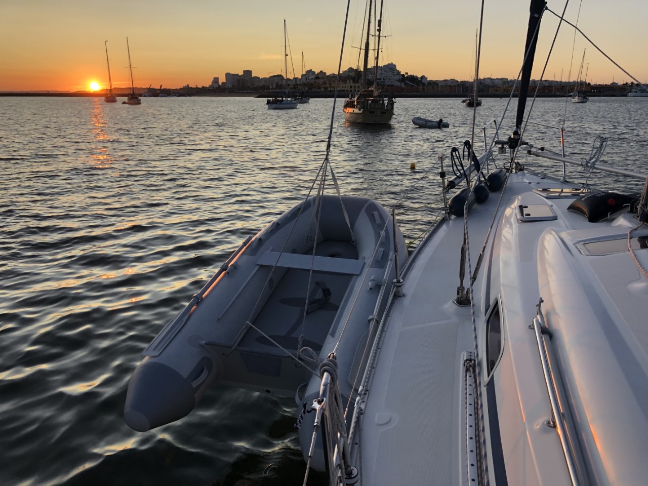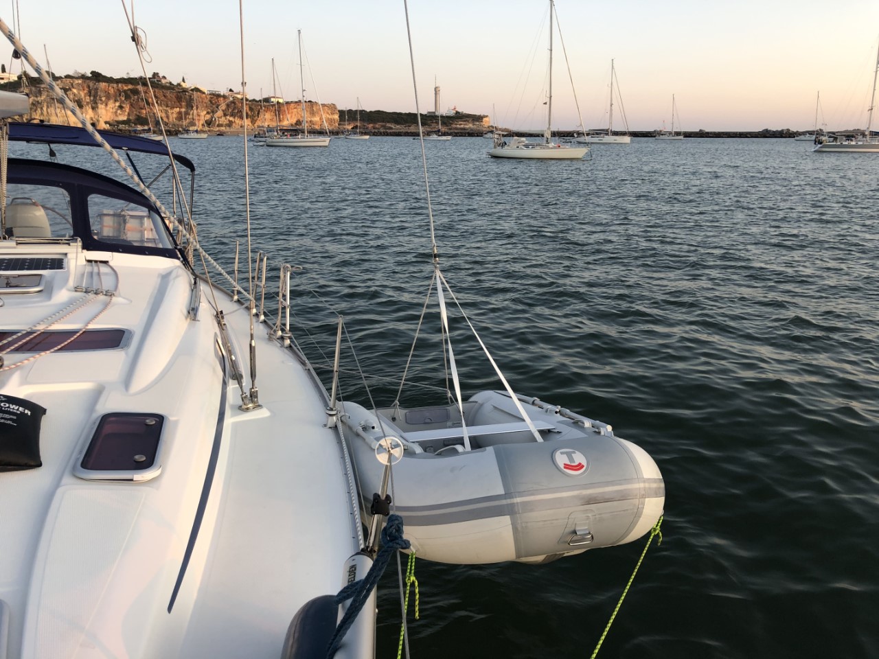 Er zijn zeilboten die hun rubberboot gewoon achter hun boot laten hangen, maar de iets zuiniger en voorzichtiger types hijsen de rubberboot op het dek. Dat deden wij ook altijd, maar je ziet ook dat ze de bijboot ophangen/takelen naast de boot. Dat systeem hebben wij vandaag ook geprobeerd.