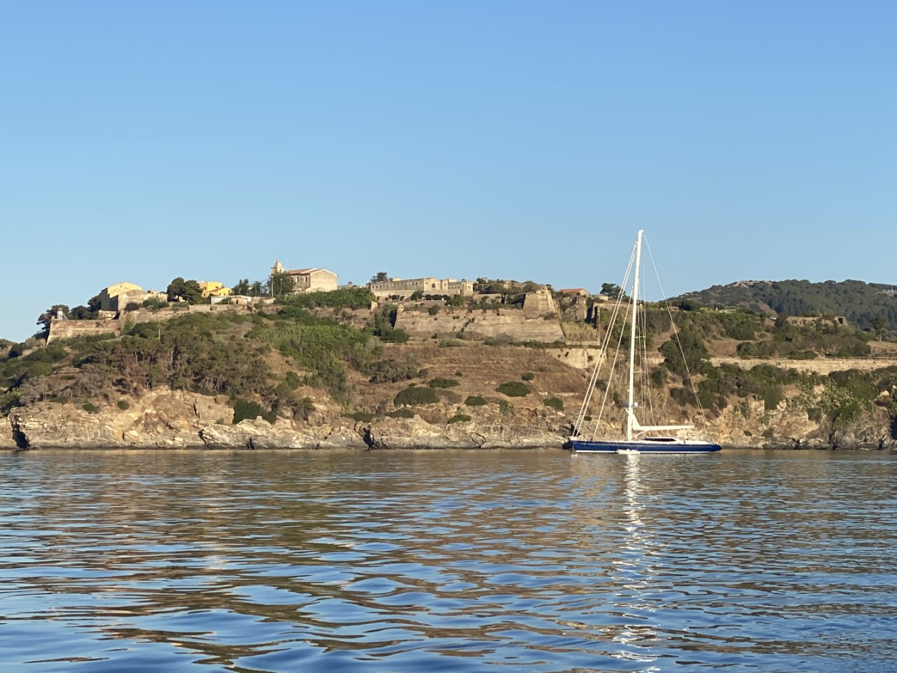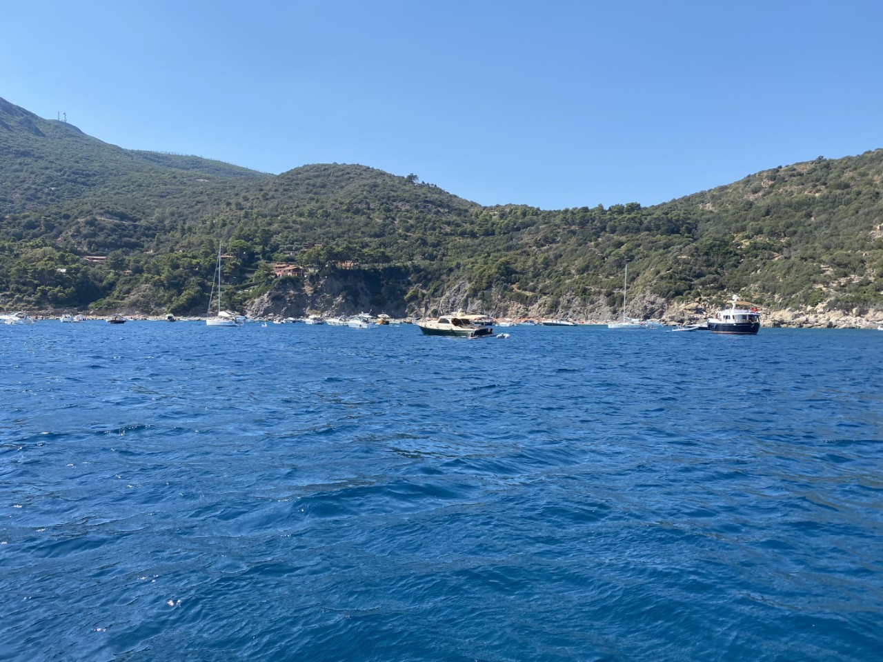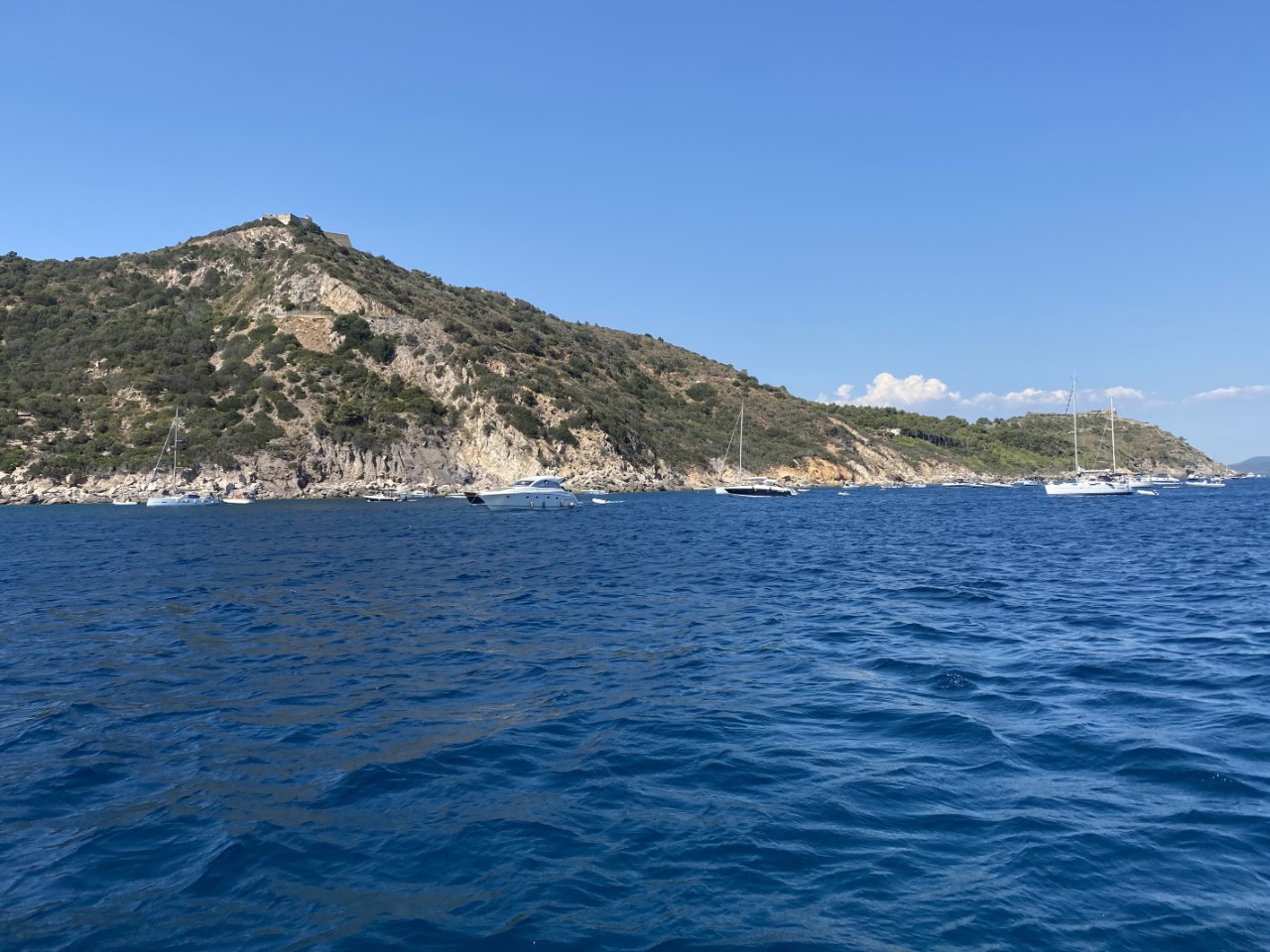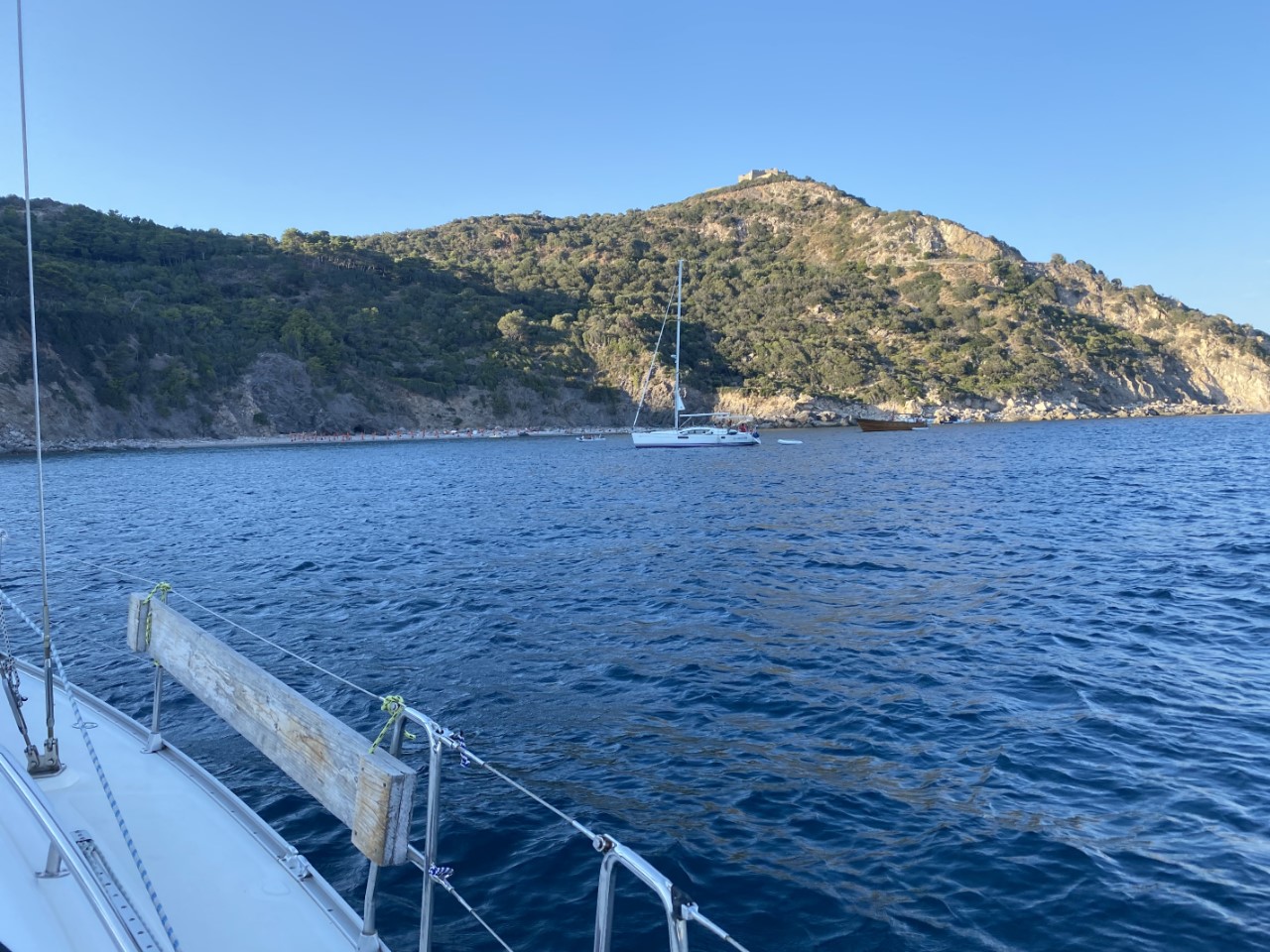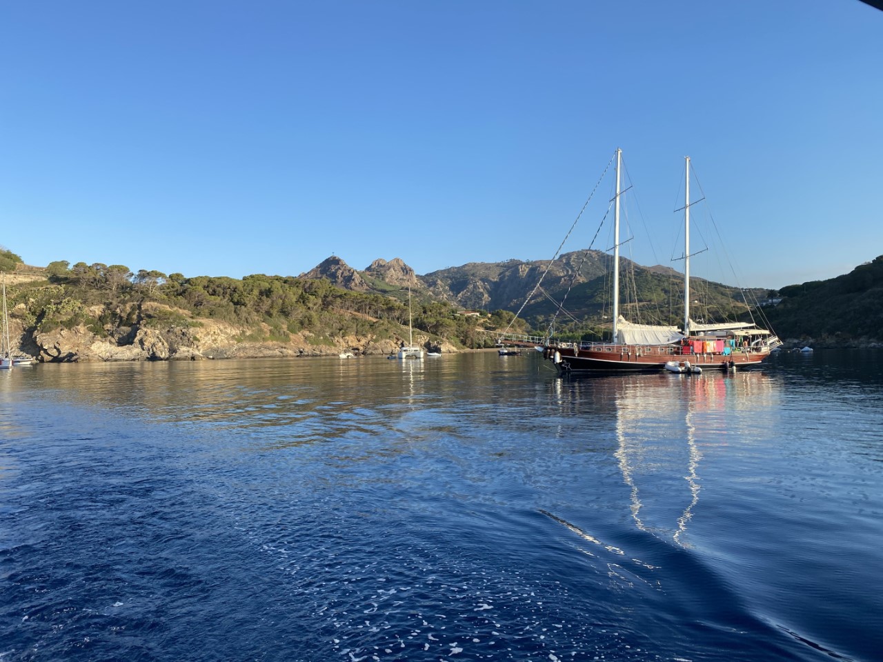 Wij sturen naar bakboord en zoeken een ankerplekje bij Lo Sbarcatello, een vrij drukke baai naast Porto Ercole. Wij ankeren een beetje aan de buitenzijde van heel dat ankerveld. Op de ankerplek staat er nog 22 knopen wind. Zonder verdere problemen ligt het anker vast op 14 meter diepte. Na 18:00 uur halen de meeste bootjes hun anker op. Wij doen dat ook, nu hebben we ruime keus dichter aan de kust, waar we ons ankertje droppen in 9 meter diepte. Omdat de wind aflandig is, is hier bijna geen swell meer. Na 19:00 liggen we vrijwel alleen op deze ankerplek en de wind is gaan liggen.