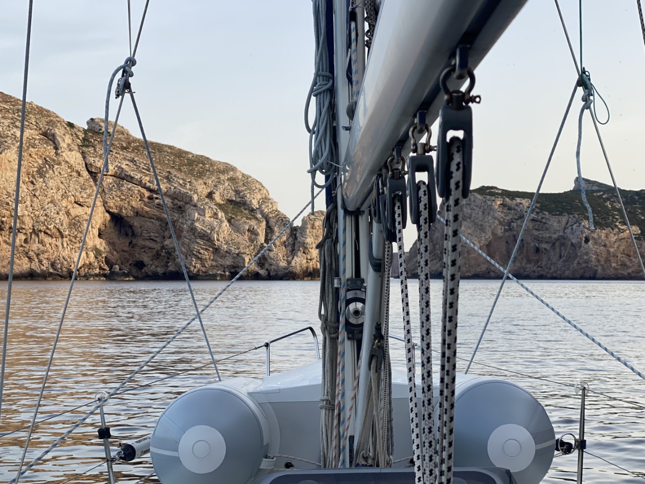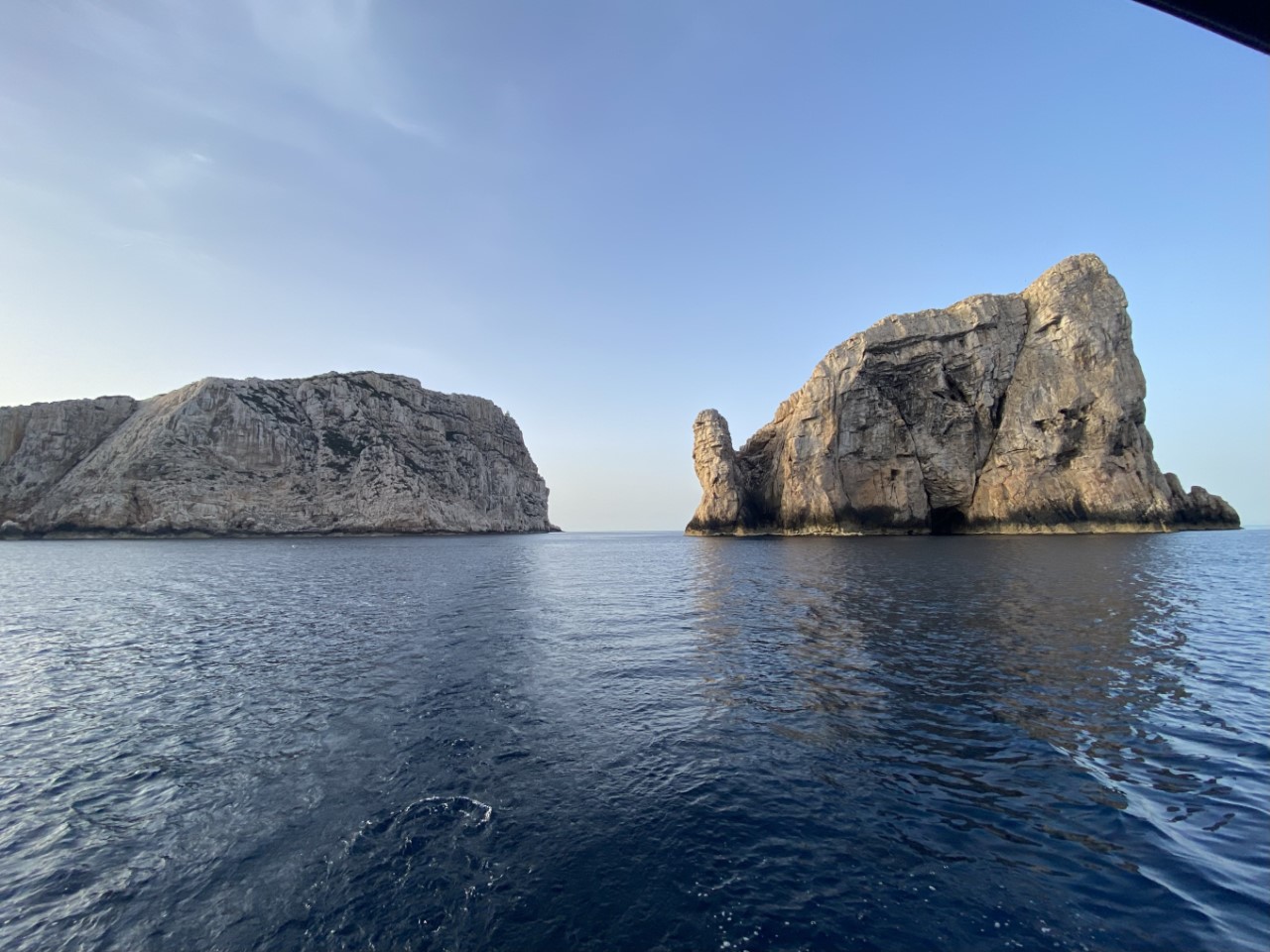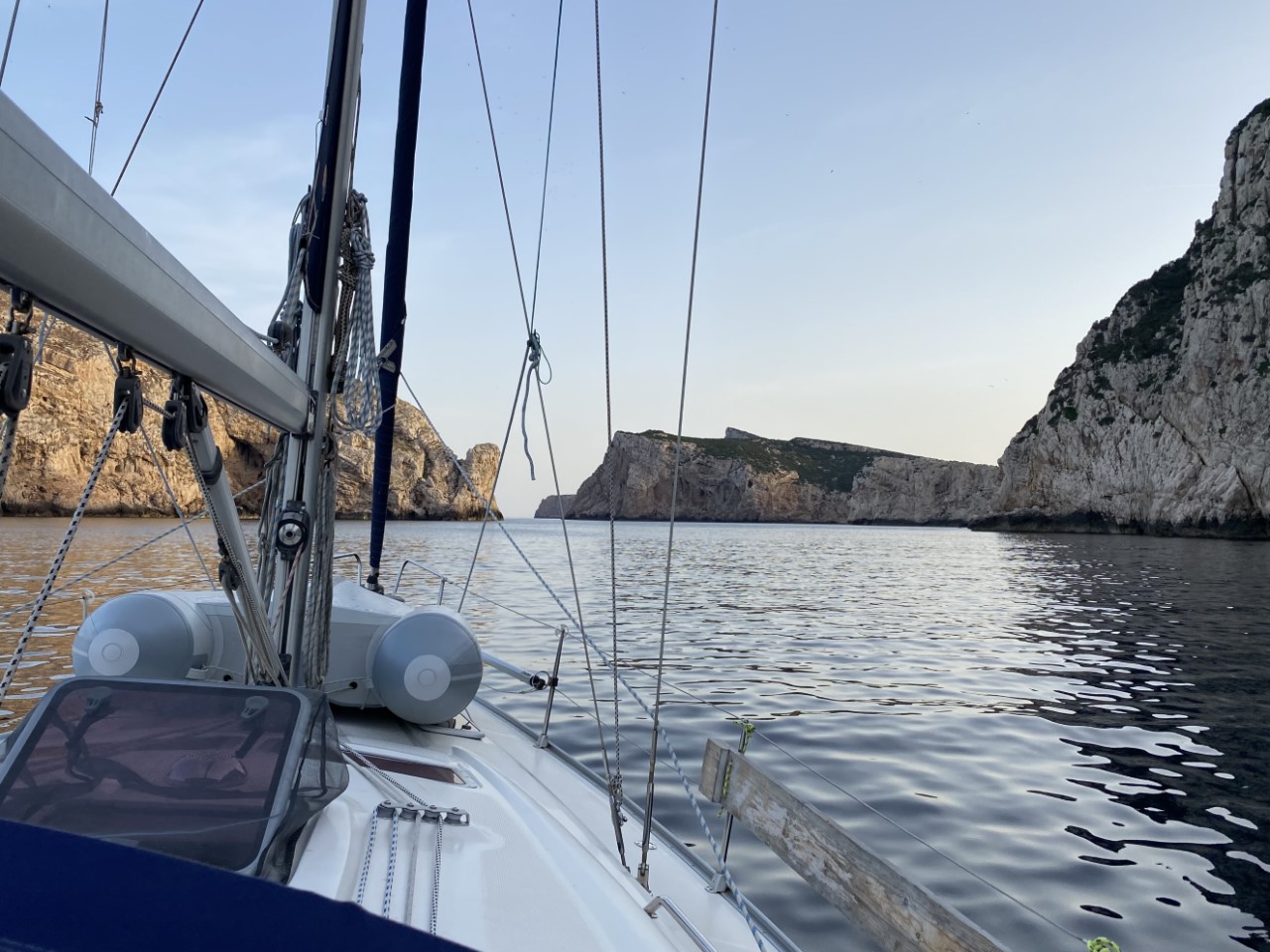 Voor de tweede maal varen we langs de Grotta di Nettuno. Ik weet nu waar ik moet kijken en heb een fotootje gemaakt. Ik manoeuvreer de Just tussen de rotsen van Grotta dei Vasi Rotti en Isola Foradada, waar een mooi doorkijkje in de rots is (Grotta dei Polombi). Het duurt vijf uur voordat het weer een beetje spannend wordt. De kust is mooi, veel rotsen en groen, maar geen enkele ankerplek, haven of dorpje.