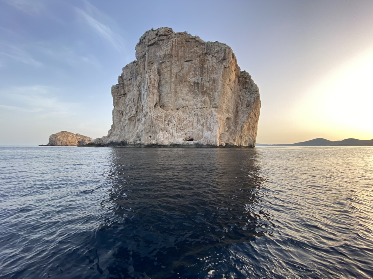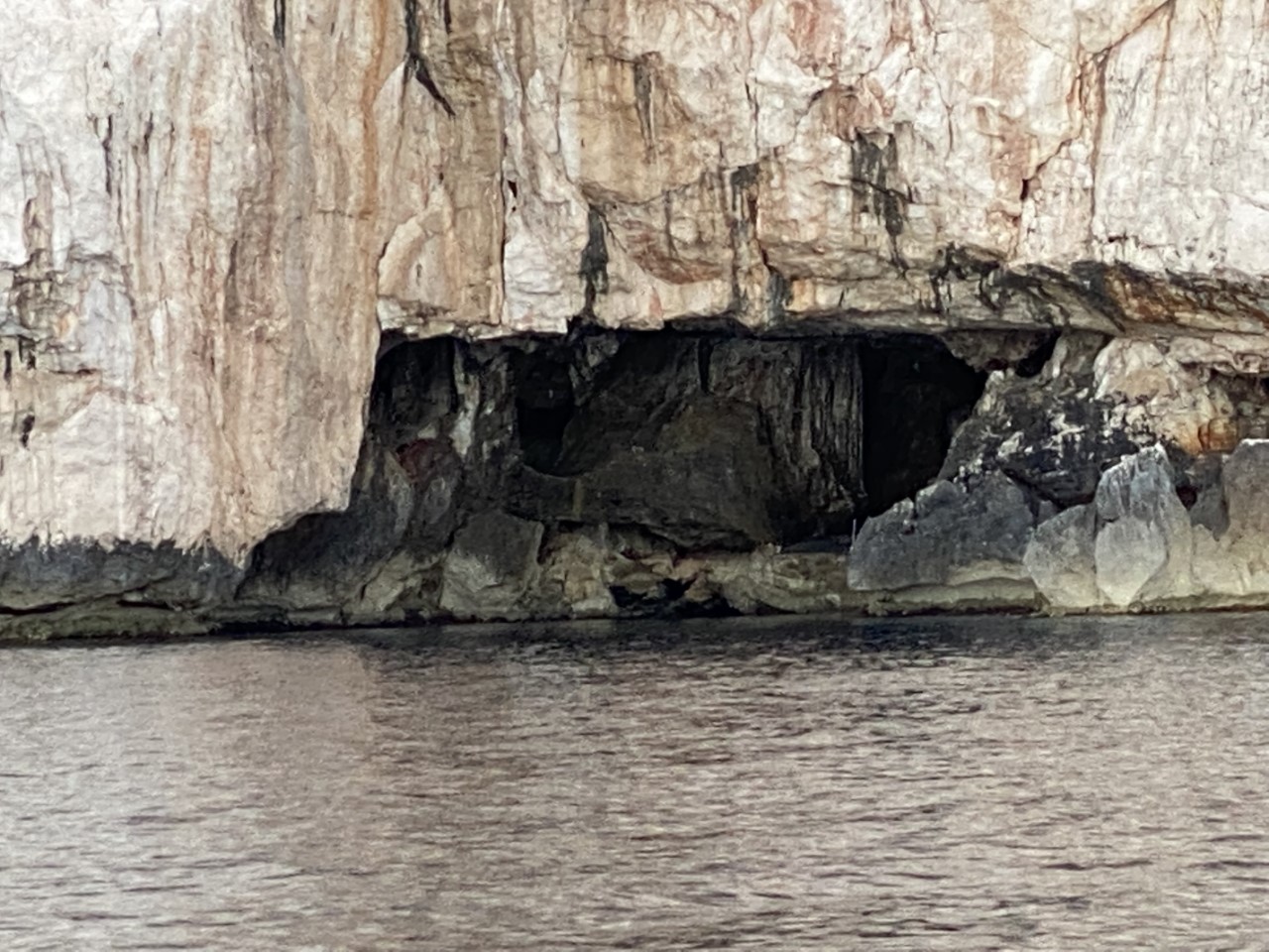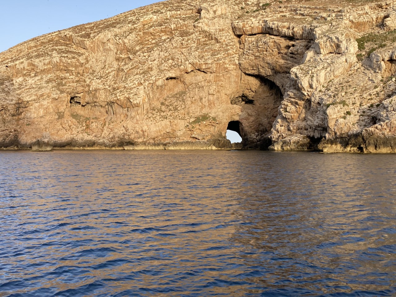 Voor de tweede maal varen we langs de Grotta di Nettuno. Ik weet nu waar ik moet kijken en heb een fotootje gemaakt. Ik manoeuvreer de Just tussen de rotsen van Grotta dei Vasi Rotti en Isola Foradada, waar een mooi doorkijkje in de rots is (Grotta dei Polombi). Het duurt vijf uur voordat het weer een beetje spannend wordt. De kust is mooi, veel rotsen en groen, maar geen enkele ankerplek, haven of dorpje.