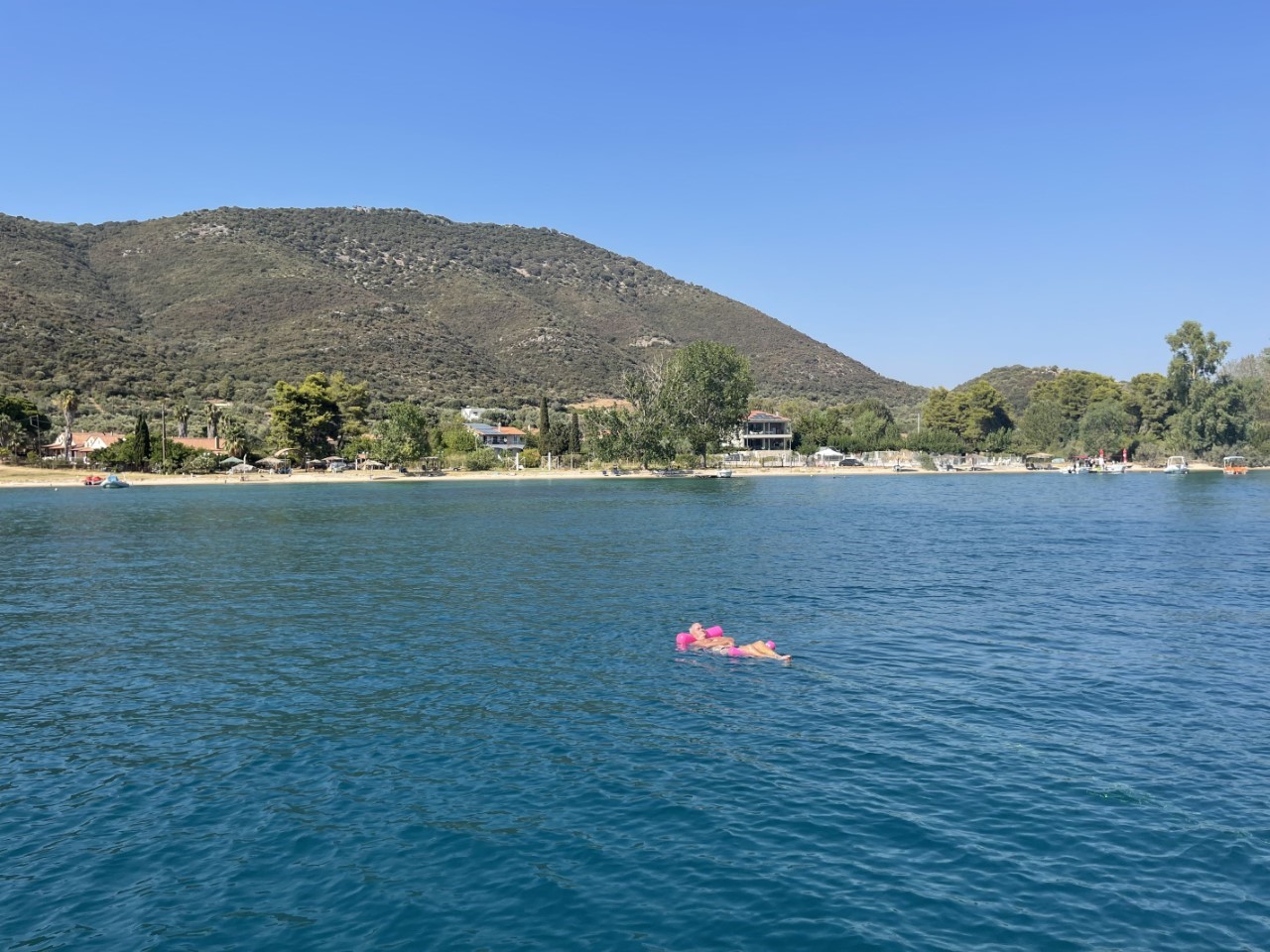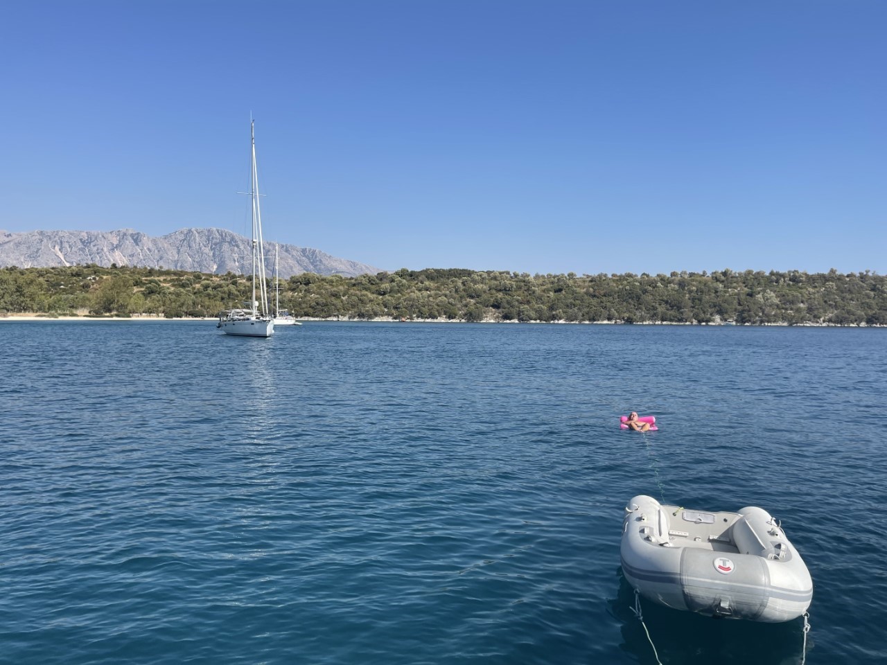 Eerst even afkoelen in het water voor de tweede klus. In de haven van Cleopatra lagen we flink klem tussen de andere boten. Aan bakboord zijn nu twee vuile, moeilijk te verwijderen plekken ontstaan van oude, vuile fenders van de buurboot. Er is een dikke, plastic smurrie achtergelaten op onze mooie Just. Met flink gebruik van WD40 lost een deel op. Met een groen sponsje met poetsmiddel kan ik de laatste resten verwijderen, klusje twee ook afgevinkt. Tijdens het afkoelen in het heerlijke, lauwwarme water (volgens de weerapp is het water 28 graden) heb ik nog een paar keer gedoken om het snelheidsradje schoon te maken. Hiermee kunnen we de bootsnelheid door het water aflezen in de kuip, klusje drie ook geklaard.