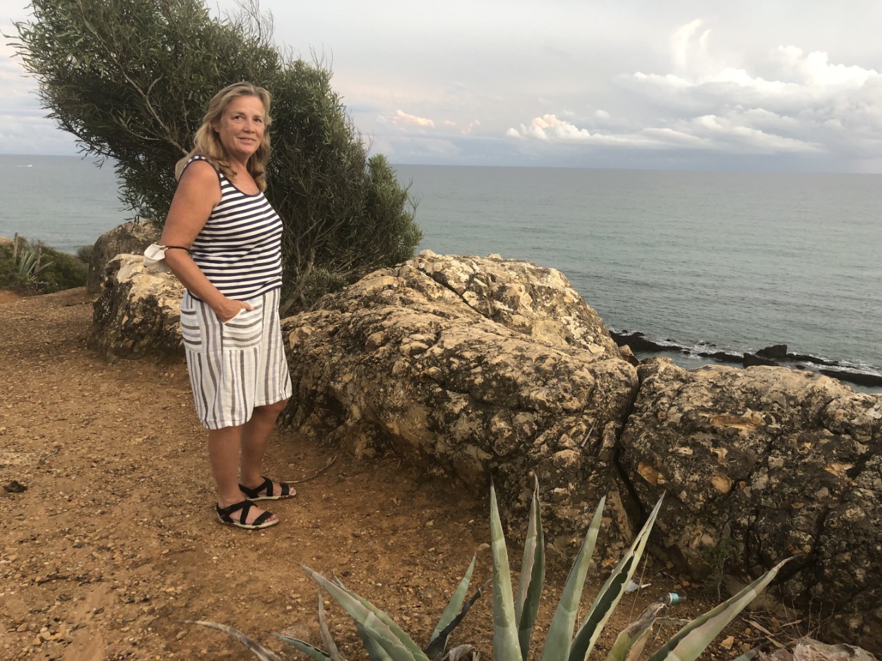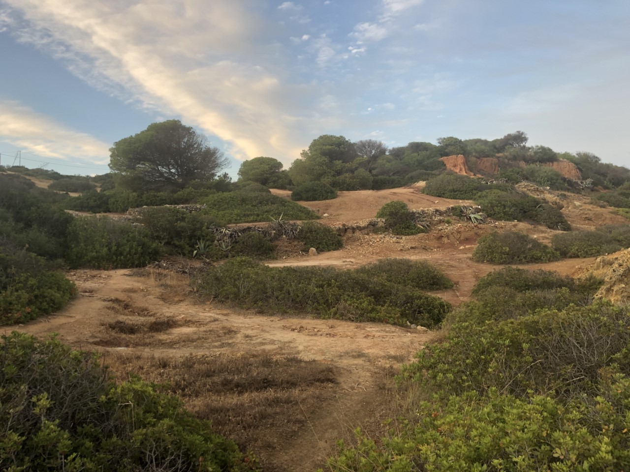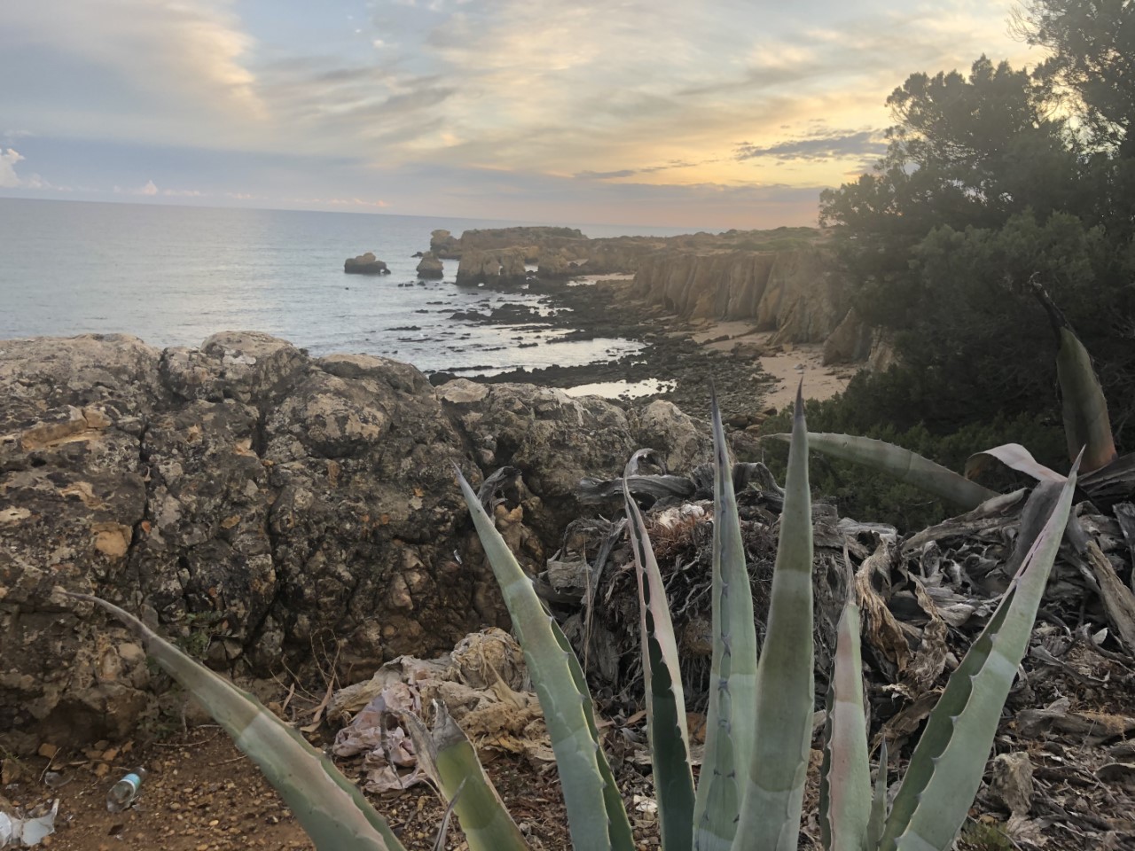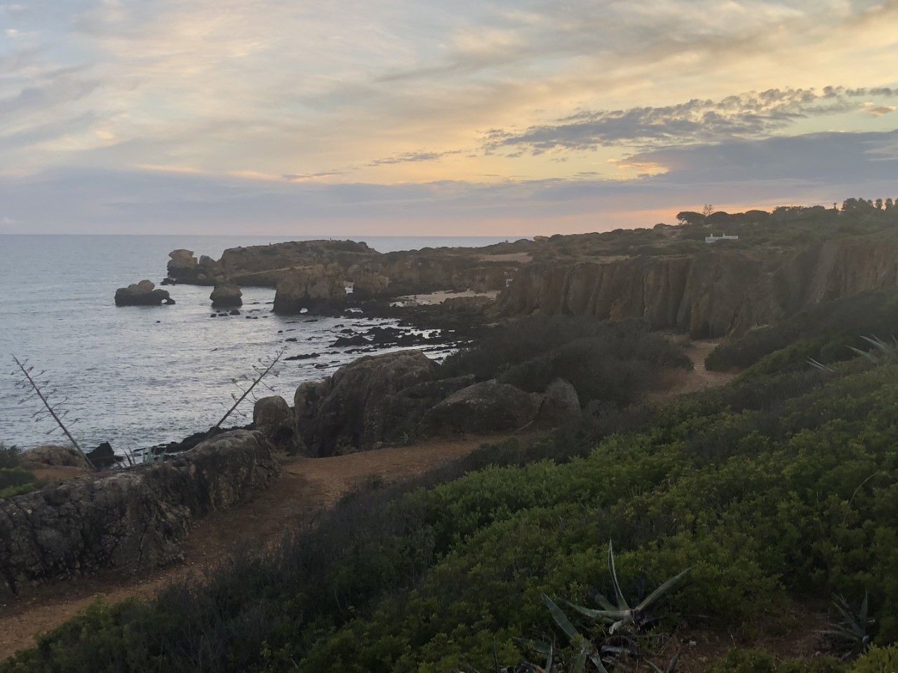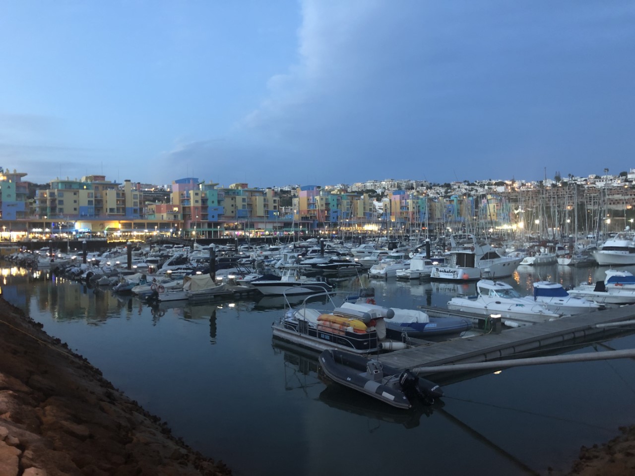 In de namiddag knapte het weer op en de buien waren verdreven. We wilden toen aan de wandel gaan, maar we besloten om iets vroeger te eten en dan een avondwandeling te maken. Nadat we een groot ijsje op de kade hadden genomen, zijn we naar de andere kant van Albufeira gelopen. We kwamen aan op een bouwrijp gemaakte vlakte met mooi aangelegde wegen. En een pad de bergen in, richting de kust. We liepen langs hele mooie villa’s en kwamen iets later in een natuurgebied met diep uitgeslepen geulen, die door de regen volgens ons steeds dieper worden. Van lieverlee kwamen we vlakbij de zee met z’n mooie rotspartijen. We konden nog wel verder lopen naar een klein strand, maar het begon al te schemeren en dan wordt het hier snel donker, dus gingen we maar richting de Just. We gingen nog even lekker onderuit op de banken.