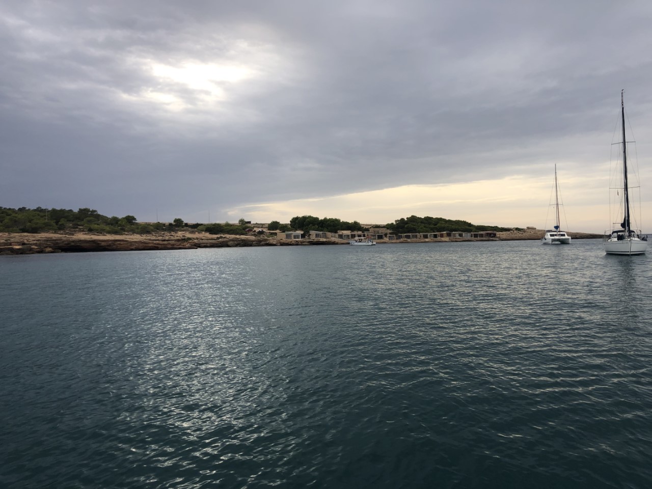 Gisteravond waren er ineens uit het niets een paar windstoten, die maar een half uurtje duurden. De wind loeide door de mast, maar het water in de Cala bleef spiegelglad. De rest van de nacht was het windstil en we hadden een rustige nacht.