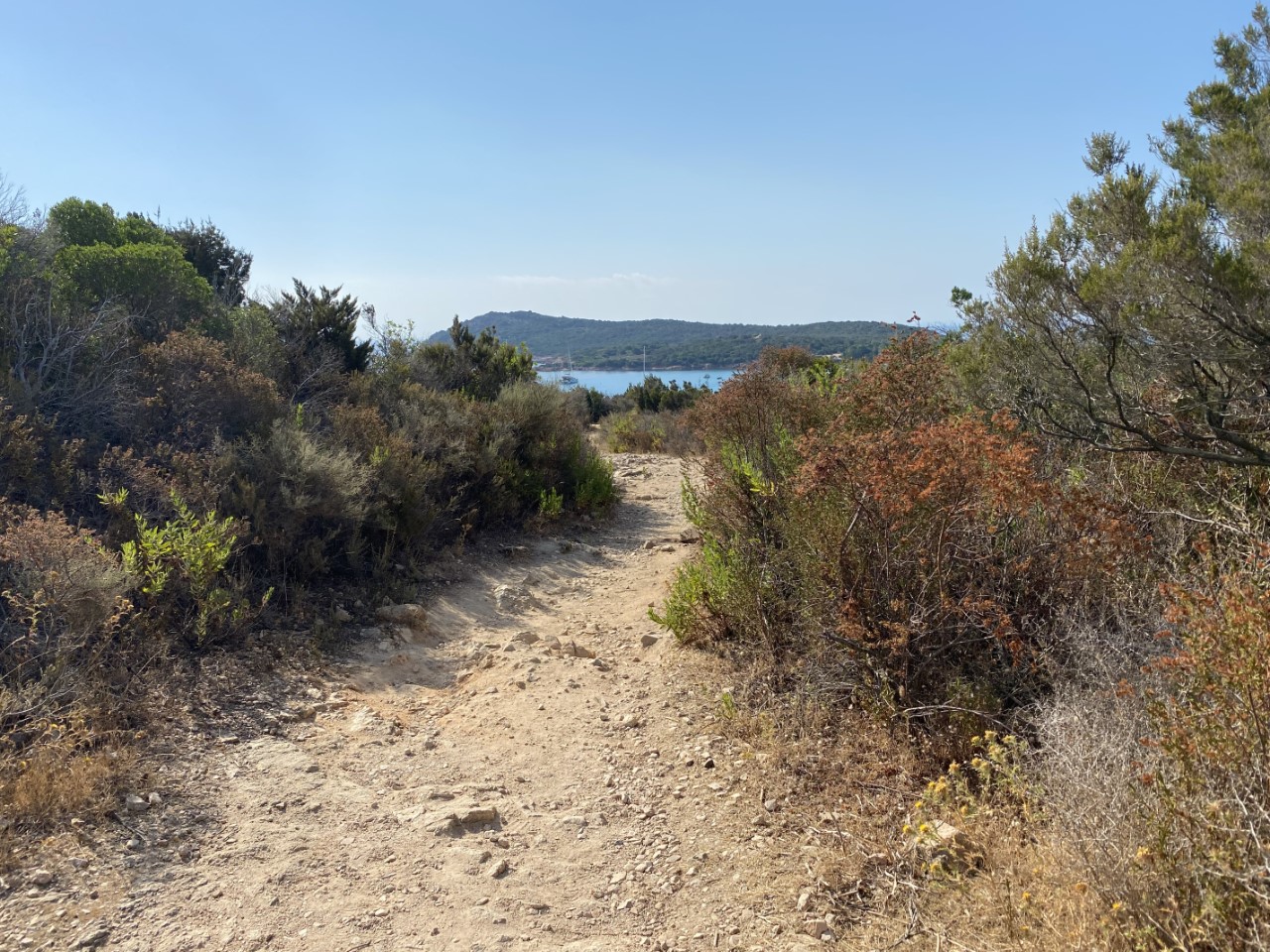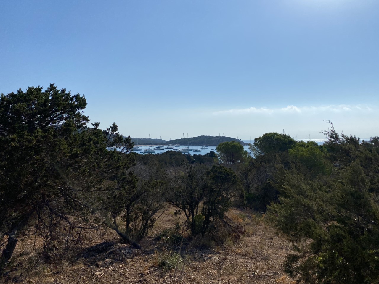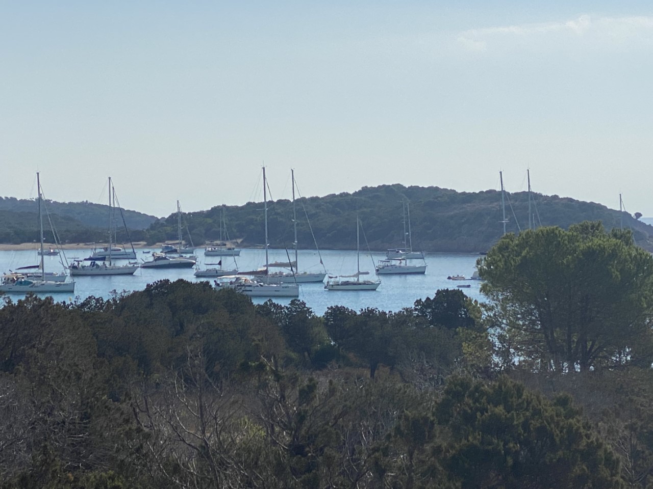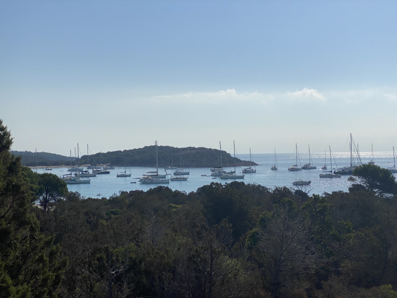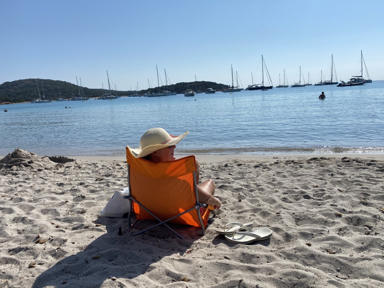 Volgens Marianne is er hier een supermarktje. Ik stel voor dat Marianne lekker op het strandje gaat zitten en ik even naar de supermarkt loop. Met het bijbootje gaan we in de ochtend naar een mooi aangelegd steigertje, gereserveerd voor de boaters. Er is één strandtent en verder staan er pijnbomen achter het strand. Marianne zoekt een plekje voor haar strandstoeltje en ik ga op pad met Google Maps naar de supermarkt. Het is een lange en stevige klim met veel haarspeldbochten, waarna ik aankom bij een camping waar het kleine supermarktje is. Met wat melk, brood en vers fruit ben ik via een rotsig paadje weer op het strand aangekomen. Marianne heeft net een duik genomen en komt als een filmster uit het water gelopen.