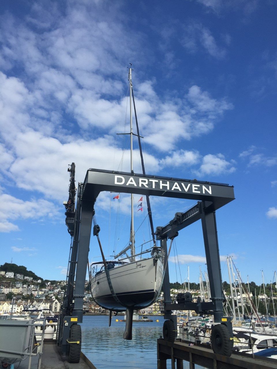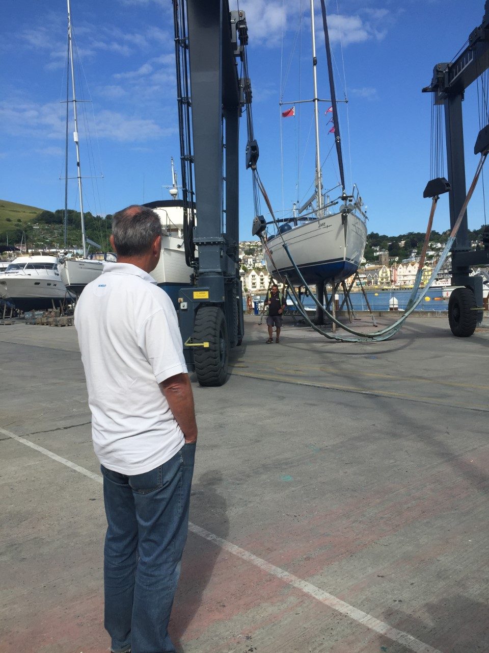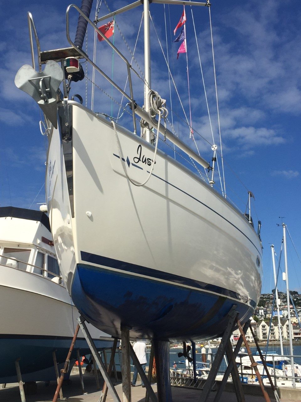We moesten vroeg op, want de monteur zou rond 07:30 uur komen om de motor alvast van de saildrive los te koppelen. Precies 08:30 uur lagen we onder de kraan en ging de Just op de kant. Ik zocht een ladder en ging aan de slag om de Just te verwennen. Eerst afsoppen met een lekker geurend shampootje en dan een stevige scrub (poets) behandeling en de laatste behandeling was een lekker crèmetje (polish) voor een shinning body. James, de monteur, was al die tijd bezig om de oude saildrive te verwijderen, zodat de nieuwe op dat plekkie kon. Marianne heeft van de omgeving genoten, lekker gezeten bij een kwabbelend beekje, stoomtreintje fotograferen en gekeken naar onze winterhaven en de mogelijkheden. Rond 15:00 uur was iedereen klaar met z’n bezigheden en kon de Just weer te water gelaten worden. Een laatste controle van James of er geen lekkages zijn en wij mochten de rekening gaan betalen. Marianne had al een ligplaats gereserveerd in Brixham, waar we op de motor (om te testen) naar toe zijn gevaren. We hadden een lange dag verwacht, maar dat viel gelukkig mee. Onze vooraf gemaakte Salade Niçoise smaakte heerlijk in het kuipje in Brixham.