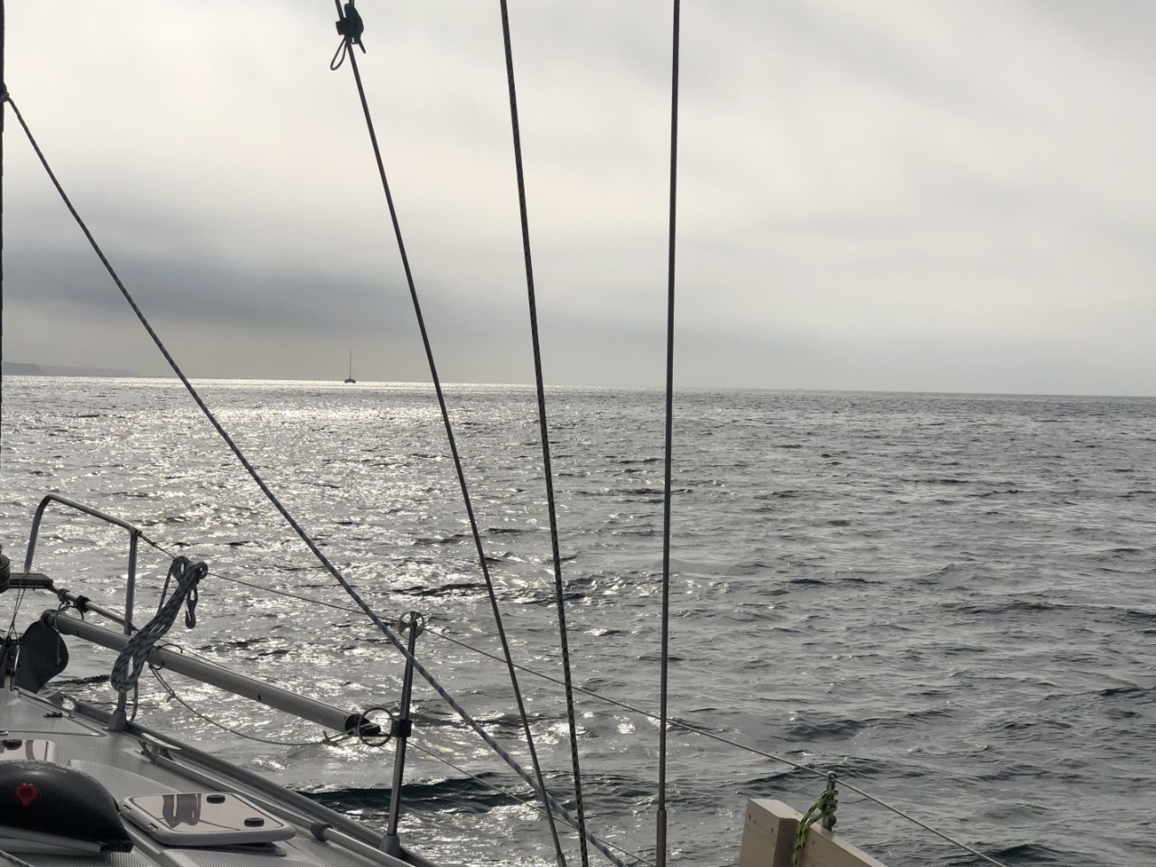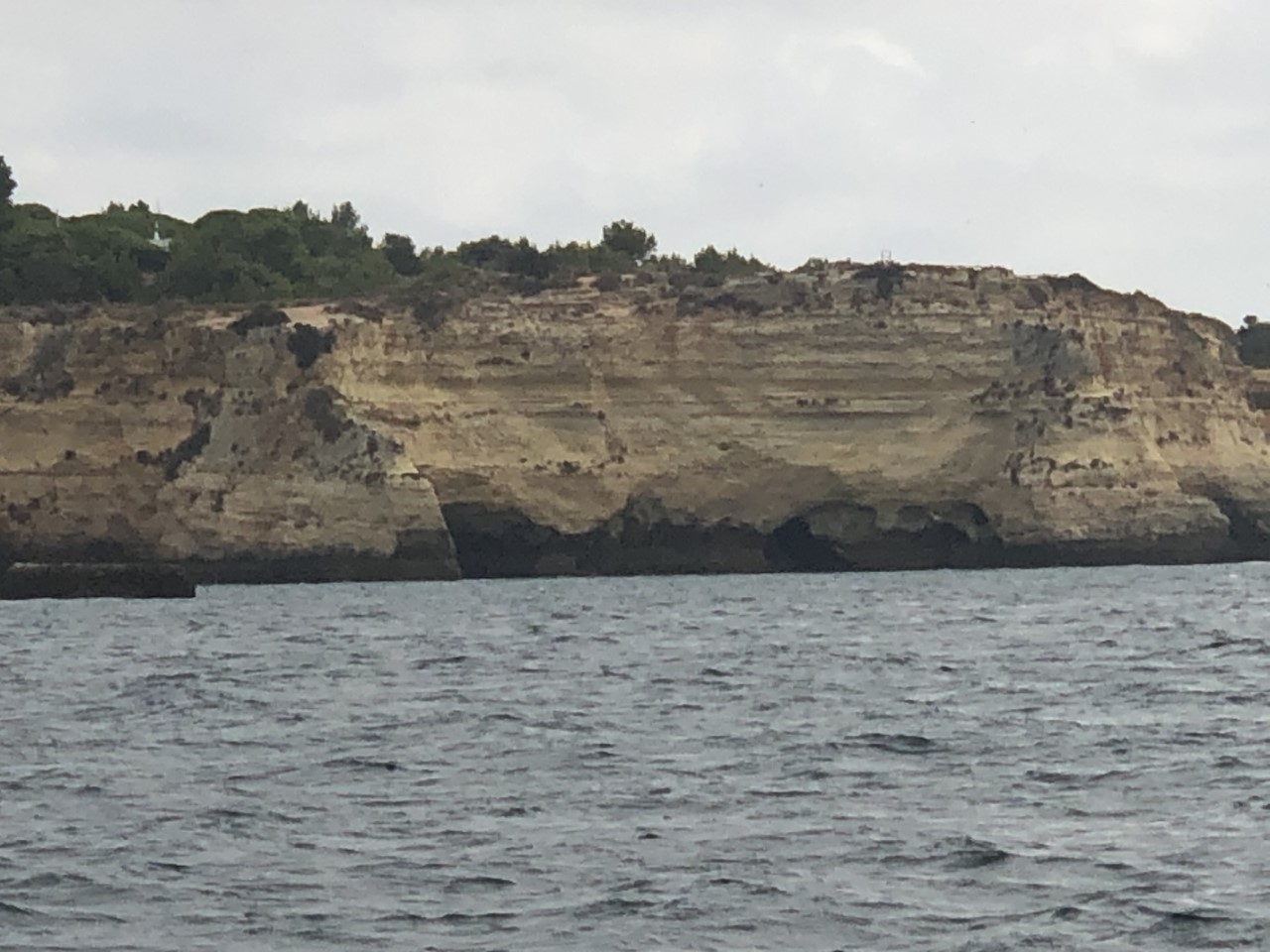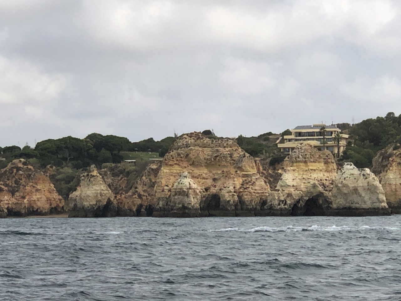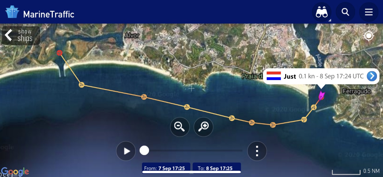 We zijn dicht langs de kust gevaren om goed de rotsen van de mooie kust te kunnen zien. Er was wat bewolking en de oceaandeining is volledig verdwenen. Er worden bij Portimão 2 ankerplekjes aangeraden door andere vertrekkers. Bij het naderen van de haven zagen we op de AIS dat er veel boten direct na de havenpieren aan stuurboord lagen en op het geadviseerde ankerplekje zagen we maar een enkele boot. Er bleek nog voldoende plek direct na de havenpieren en het zag er vredig uit, dus we hebben daar ons anker laten zakken tussen een mengeling van nationaliteiten.
