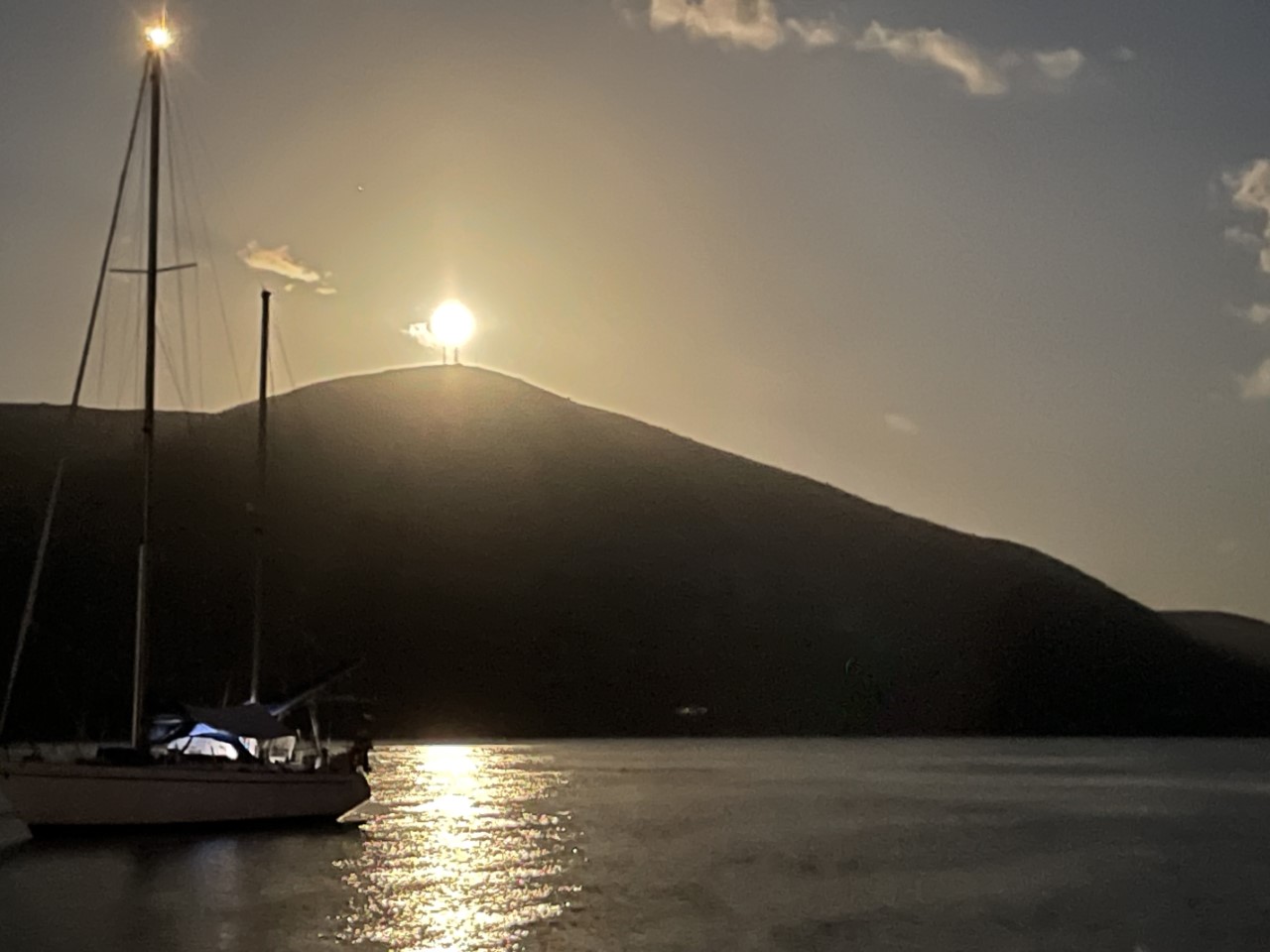 Gisteravond hebben we veelvuldig gekeken naar de blauwe maan (tweede maan deze maand), die ook nog een supermaan is. Hij kwam mooi op achter de berg en zette de baai in helder licht.
