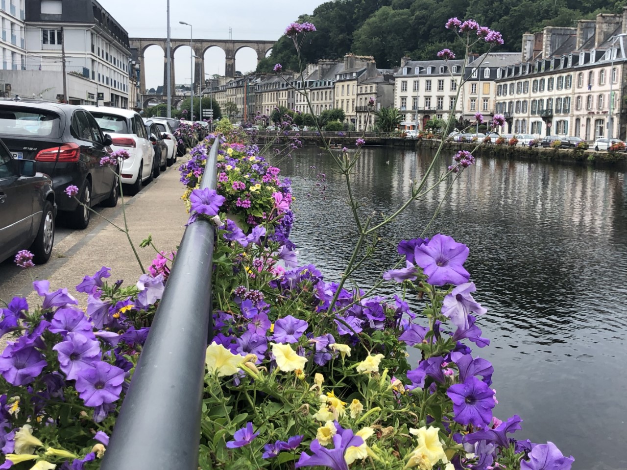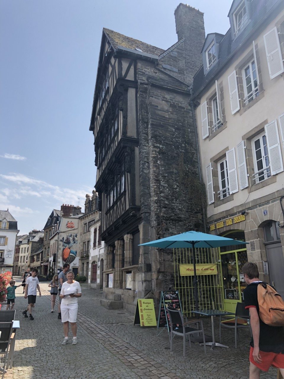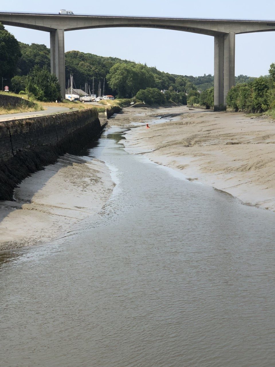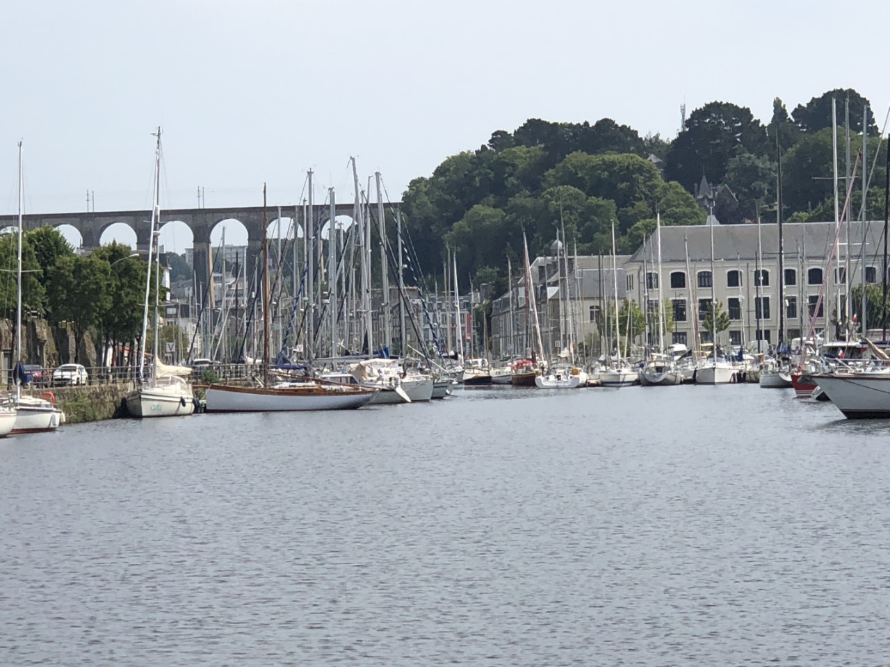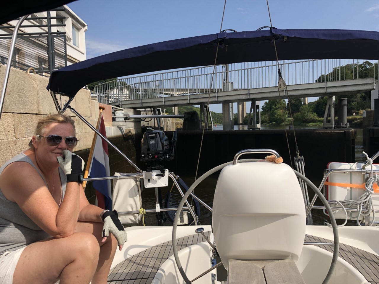 We vertrekken in de ochtend naar Morlaix. Een klein stukje over zee tussen de rotsen laverend kwamen we op een nu nog brede rivier. Op de rivier hadden we de stroming mee, maar we bleven netje tussen de boeien. Marianne had de havenmeester gebeld en had 3 tijden doorgekregen dat de sluis bediend zal worden. Wij gingen voor 10:31 uur, of 10 minuten later zoals de havenmeester zei. Door de mooi kronkelende rivier vaarden we rustig langs kleine dorpjes, grote landhuizen en donkere bossen. De rivier werd steeds smaller en de rode en groene tonnetjes leiden ons slingerend naar de sluis. Het laatste groene tonnetje dacht ik te kunnen afsnijden. De rode, groene en rode ton stonden bijna in een lijn. Een verkeerde keus. De Just kwam langzaam tot stilstand, beetje dom, maar we waren snel weer los van de bodem en we vervolgden de laatste 2 tonnetje braaf aan de juiste kant. We waren een kwartiertje te vroeg bij de sluis. In de sluis werden we keurig opgevangen en de lijntjes werden belegd, wat een service. We hebben in de box snel de bimini opgezet, want het was bloedje heet in de kuip. De buiten temperatuurmeter gaf 42 graden Celsius aan. Na een korte siësta hebben we het stadje bezocht. We hebben eerst een stadsmap gehaald en daar mee ook een stadstour met alle hoogtepunten. Een tegenvaller waren de hoge trappen van het viaduct, maar daar hadden we wel een mooi uitzicht over het stadje. Via allemaal kleine straatjes met een aparte bouwstijl qua huizen. Er waren veel leuke winkeltjes met snuisterijen, brocante en streekproducten. Aan de inrichting was veel zorg besteed. We kwamen op een pleintje waar we een 15e eeuws huis van binnen hebben bekeken. We zagen een grote openhaard en schoorsteen en een mooie hout bewerkte draaitrap met overlopen naar het voor- en achterhuis. We hebben ook een leuk restaurantje gezien met een aantrekkelijk menu. Dus wij rond 19:00 uur op pad om eerst langs de havenmeester te gaan, maar die doet alles tranquille en ook nu was hij er niet. Ook het restaurantje was nog gesloten en plan B eten aan boord, hadden we geen zin meer in. Dus zijn we de plaatselijke Fat-Kee maar binnen gelopen voor ons maaltje, een prima keus. Ook op de terugweg was ons plan A nog steeds gesloten. De havenmeester was nu wel in z’n kantoortje en hebben we de administratie afgewerkt op zijn manier tranquille. Een flink half uur later stonden we buiten. Morgen kunnen we pas om 11:22 uur de sluis nemen om weer de open zee te bereiken. Het is hier een leuk Frans plaatsje voor een dag.